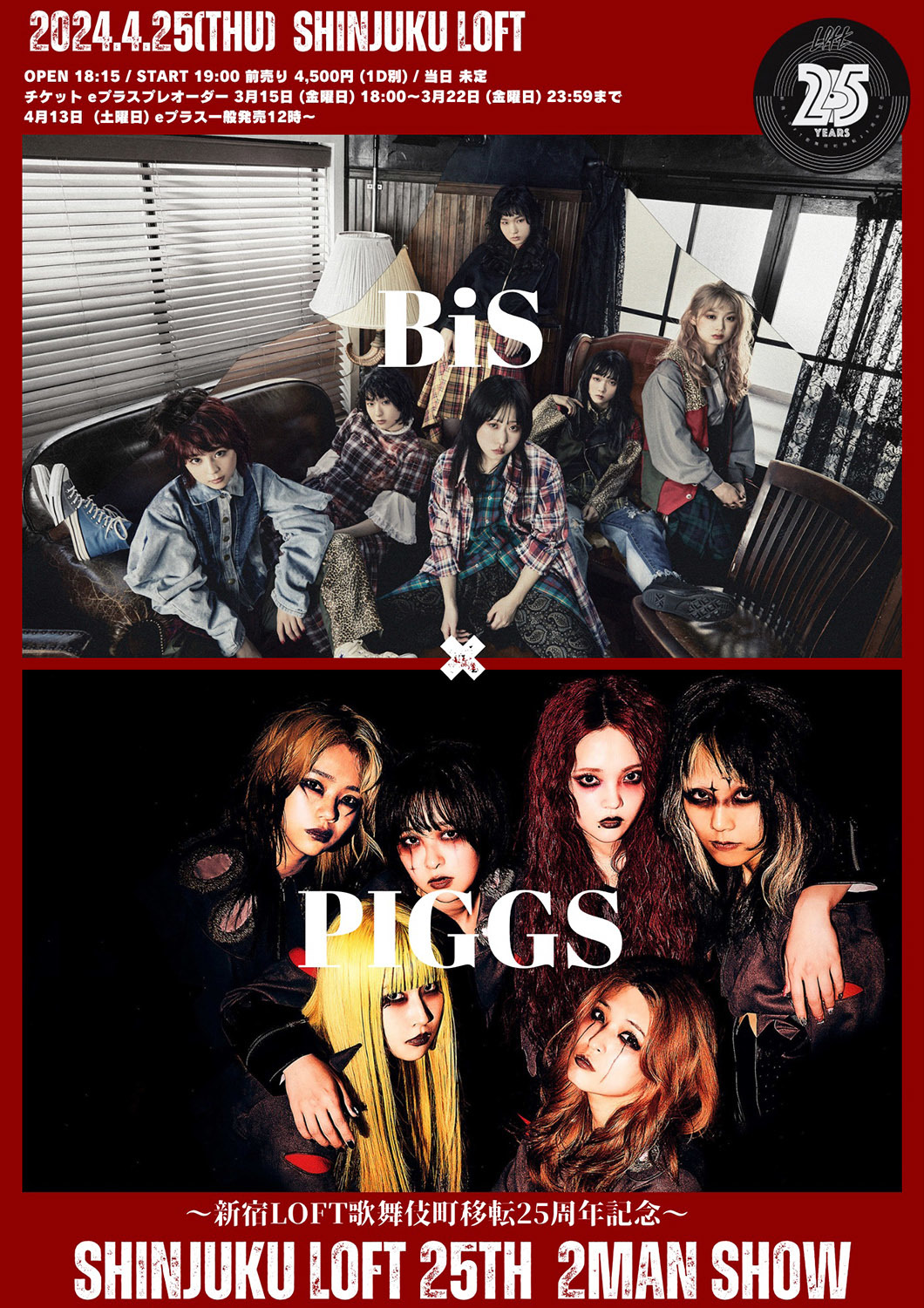 4月25日 (木)にPIGGS×BiSの2マンライブが開催。チケットはイープラスにてプレオーダーが3月15日(金)18:00から開始される。受付は3月22日 (金) 23時59分まで。