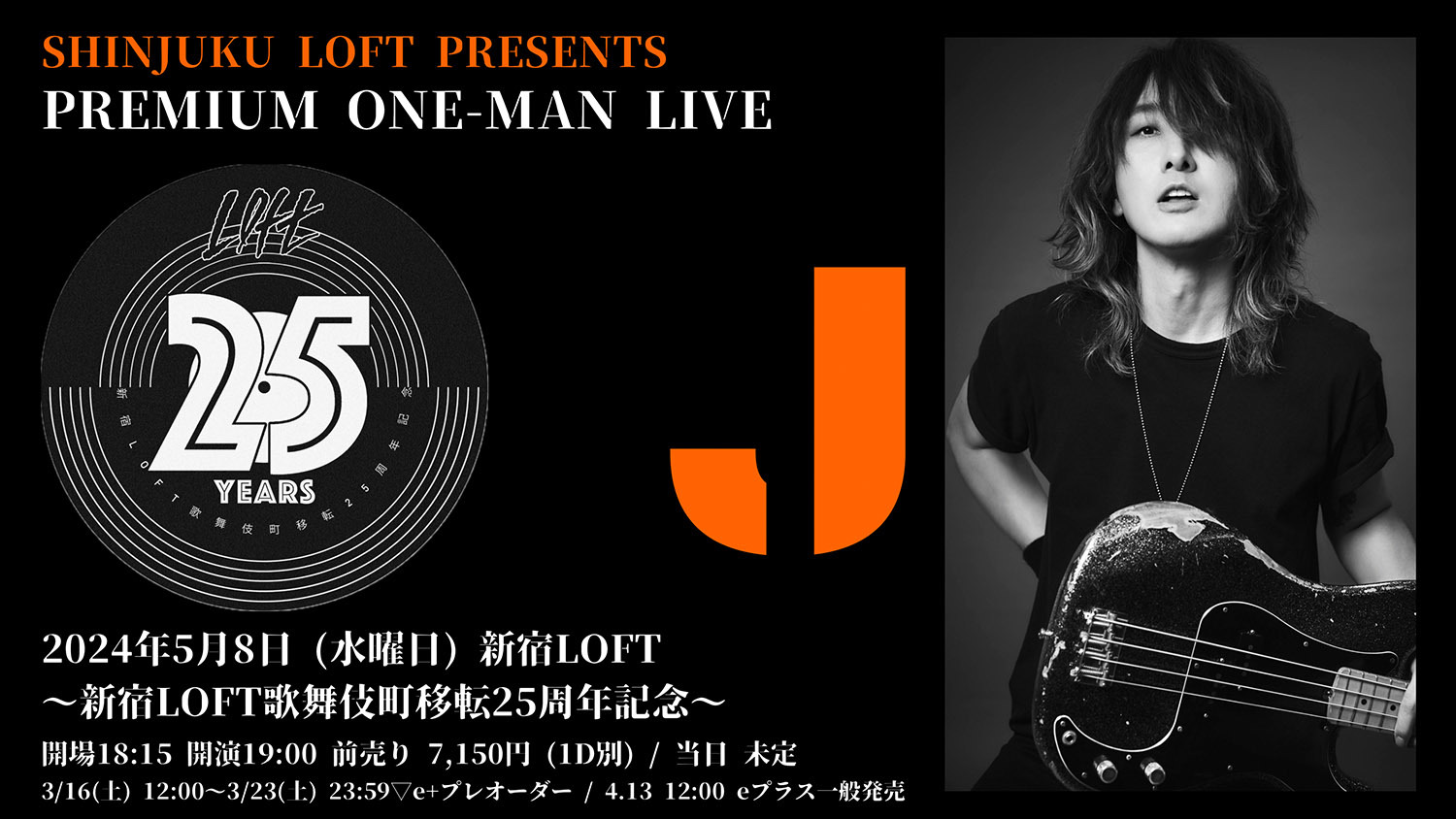 5月8日 (木) にプレミアム・ワンマンライブと題し、LUNA SEAのベーシストである“J”のワンマンライブが開催。チケットはイープラスにてプレオーダーが3月16日(土)12:00から開始される。受付は3月23日 (土) 23時59分まで。