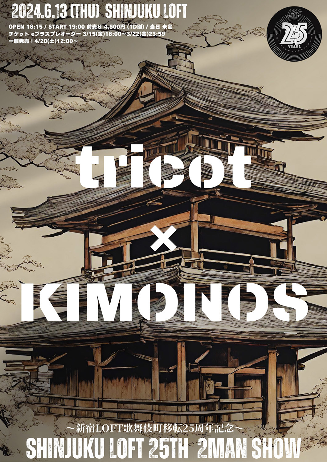 6月13日 (木) にtricot×KIMONOSの2マンライブが開催。チケットはイープラスにてプレオーダーが3月15日(金)18:00から開始される。受付は3月22日 (金) 23時59分まで。