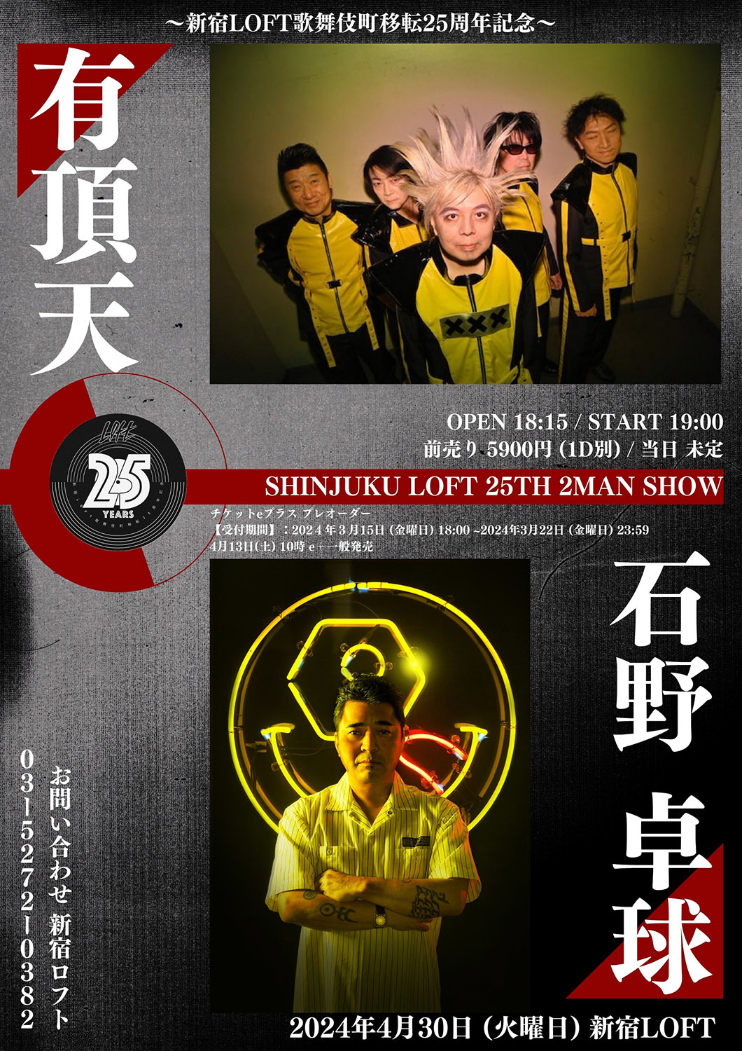 4月30日 (火) に石野卓球×有頂天の2マンライブが開催。チケットはイープラスにてプレオーダーが3月15日(金)18:00から開始される。受付は3月22日 (金) 23時59分まで。