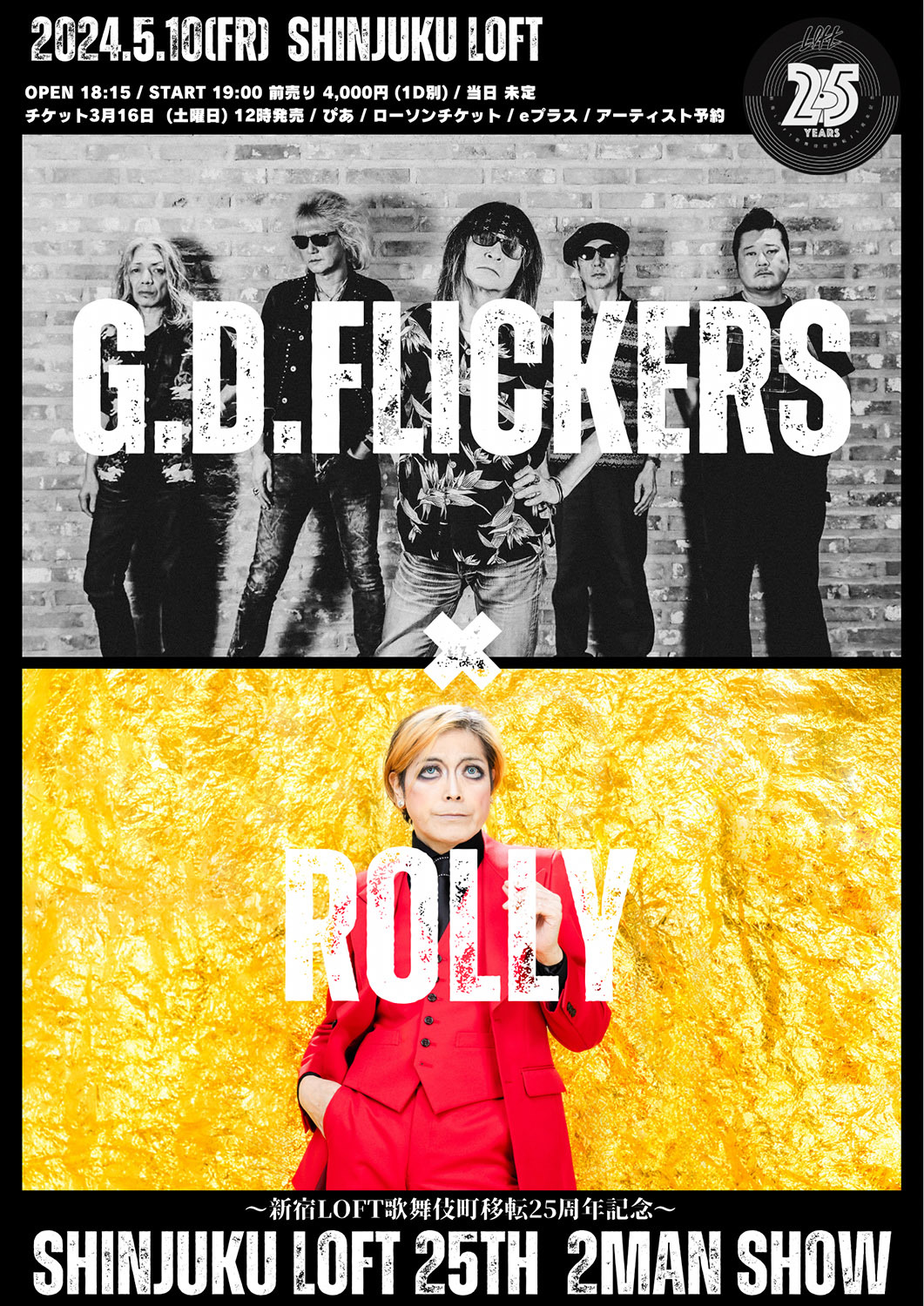 2024年4月から新宿LOFTで開催される「新宿LOFT歌舞伎町移転25周年記念」として、5月10日 (日) に 『SHINJUKU LOFT 25TH 2MAN SHOW』と題してG.D.FLICKERS × ROLLYの2マンライブが開催されることが発表された。