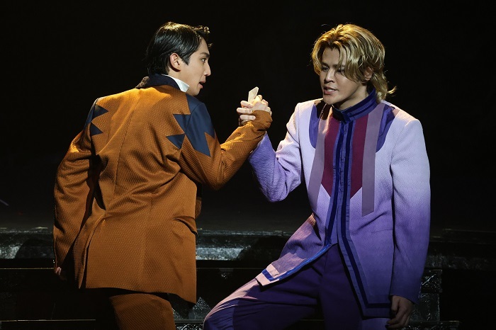 ステージ上に鎮座するのは大きな円、象徴的な階段、半円状のスロープ。美しくも不穏な世界観を凝縮したセットは壮観で、開演前から心が躍る。冒険譚の語り部はスピードワゴン(YOUNG DAIS)。ラップを取り入れた疾走感のあるナンバーは、“ジョジョ”シリーズ全体に漂う個性的でスタイリッシュな空気感を彷彿とさせた。