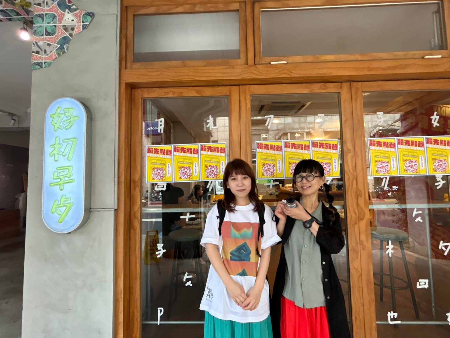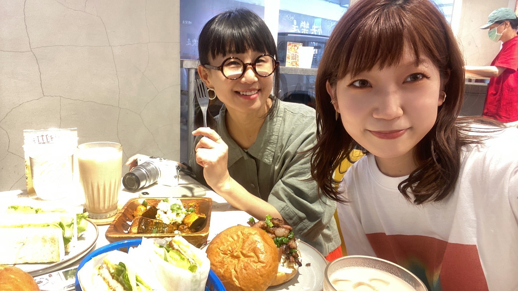 まずは、台湾といえば朝食!ということで、台北・中山エリアにある若者に人気のカフェ「好初早餐」で待ち合わせ。平日の朝から賑わっていて、レトロポップな店内で台湾の伝統的なフードをアレンジしたサンドイッチを一緒に堪能。揚げた湯葉のサンドイッチ、台湾の家庭料理で塩漬けにした卵・鹹蛋(しぇんたん)がトッピングされたカボチャ、小さな紅白のお餅・湯圓(タンエンイ)を揚げてピーナッツパウダーと砂糖をまぶしたモチモチさくさくのサイドメニュー、さっぱりな甘さの豆乳ミルクティーなど、どれを食べても日本にはない味わいで感動!