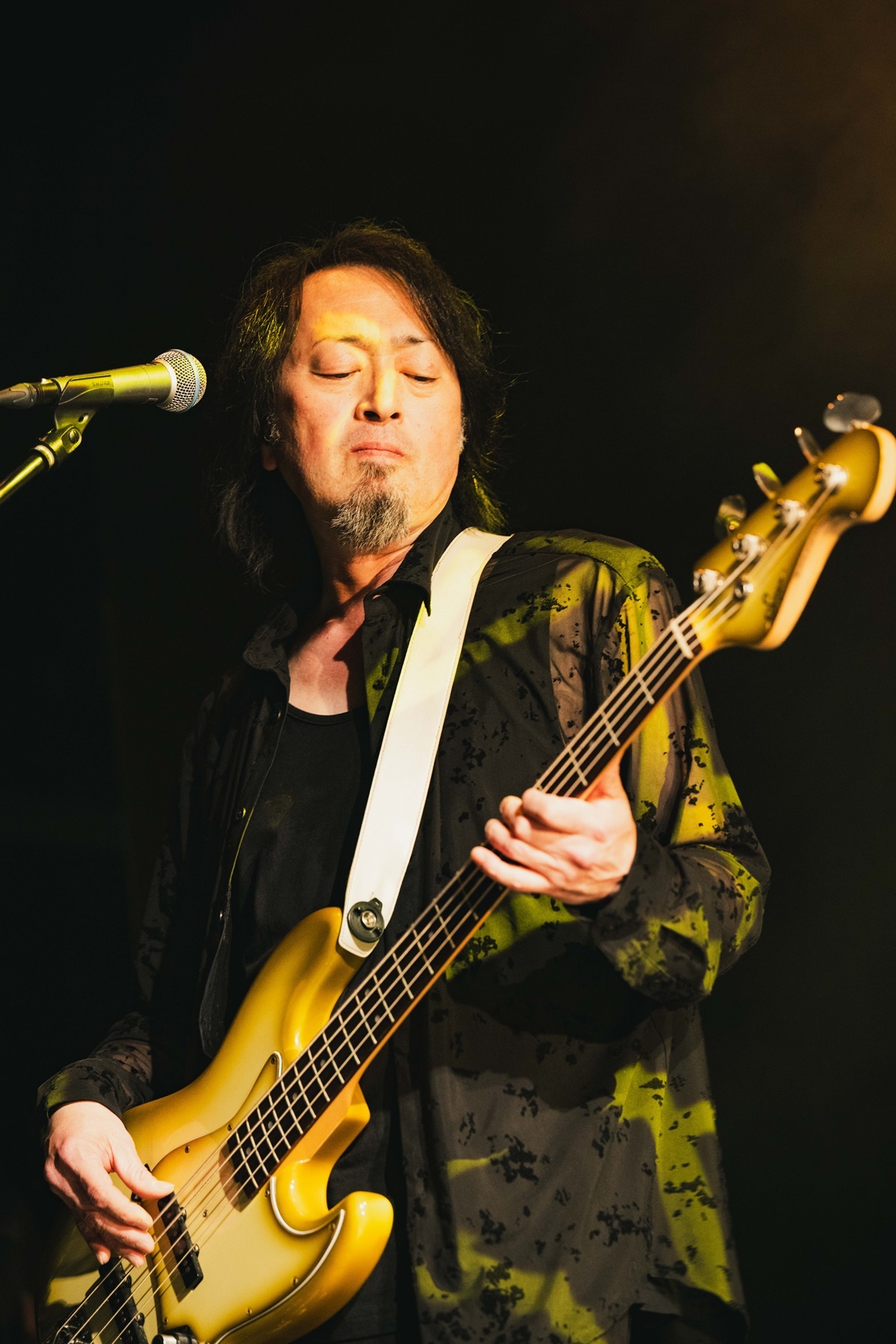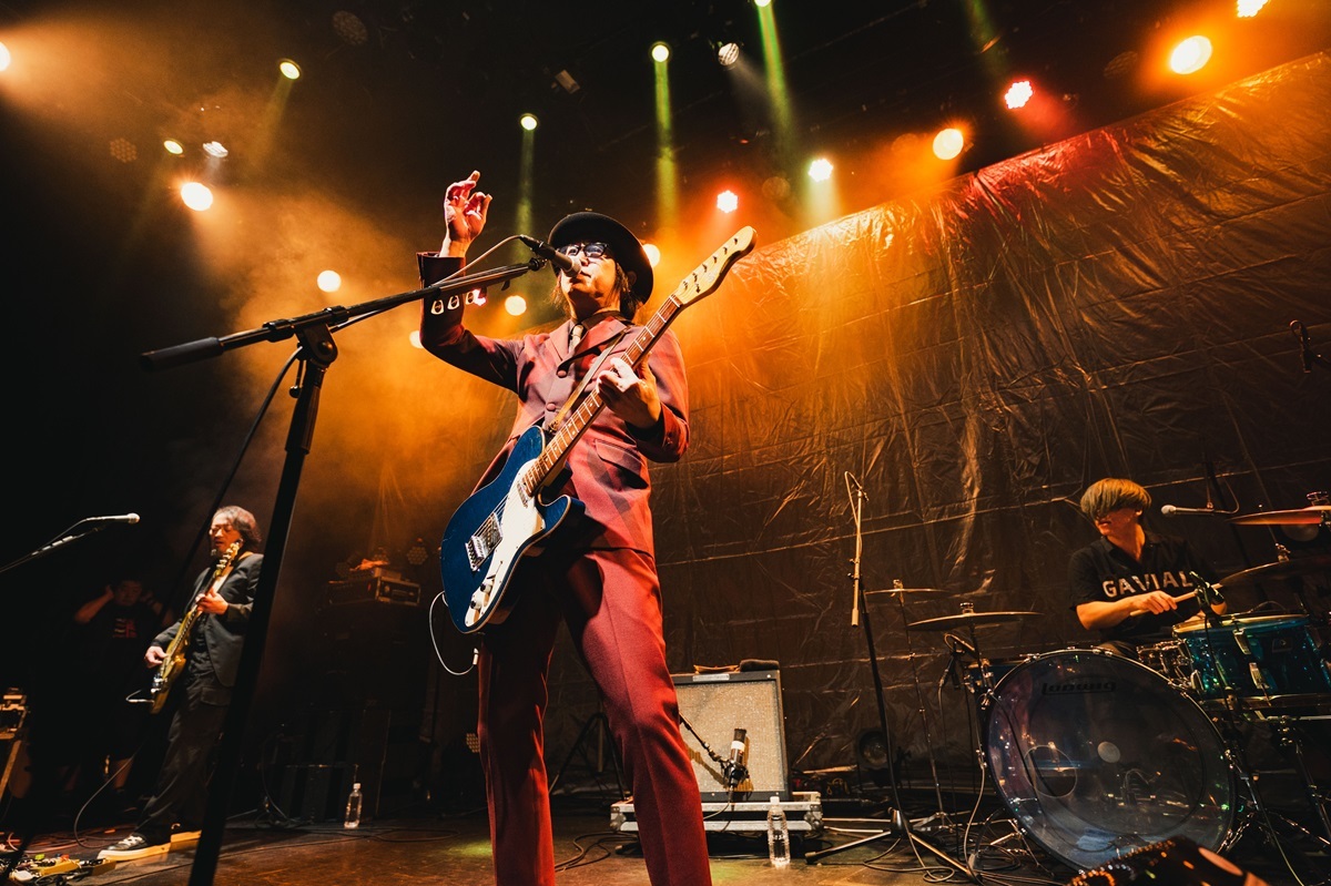 そして1曲目はファーストアルバムから「MaMa」、伸びやかで美しいメロディーを持つお誕生日に相応しい誕生のナンバーだ。そこから「Marking Point」「電撃」「Red monkey」と超絶アッパーなパワーナンバーが炸裂する。まさに杉本恭一である。ちなみに還暦のお衣装は、赤というか臙脂色のユニオンジャック柄が入った小粋なスーツにぴしっとネクタイ。ネクタイ姿で登場したのは人生初だとMCで披露し、満員の観客の笑いを誘うなどして「ズル休み」「moon」と、情景が目の前に浮かんでくるような染みわたるナンバーが響く。