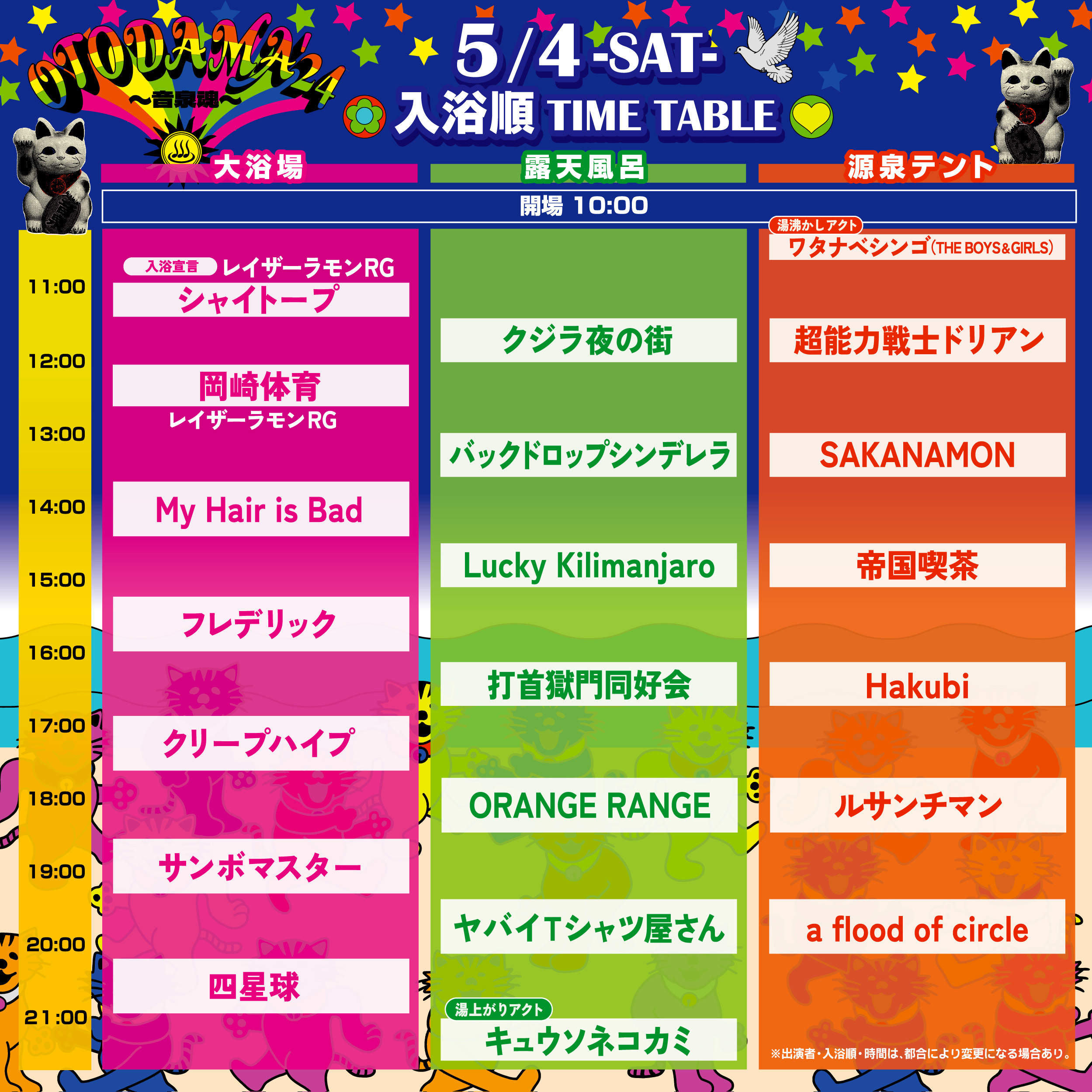 5月4日(土祝)5日(日祝)の2日間、大阪・泉大津フェニックスにて開催される『OTODAMA’24~音泉魂~』の入浴順(出演順)および出演ステージが発表された。