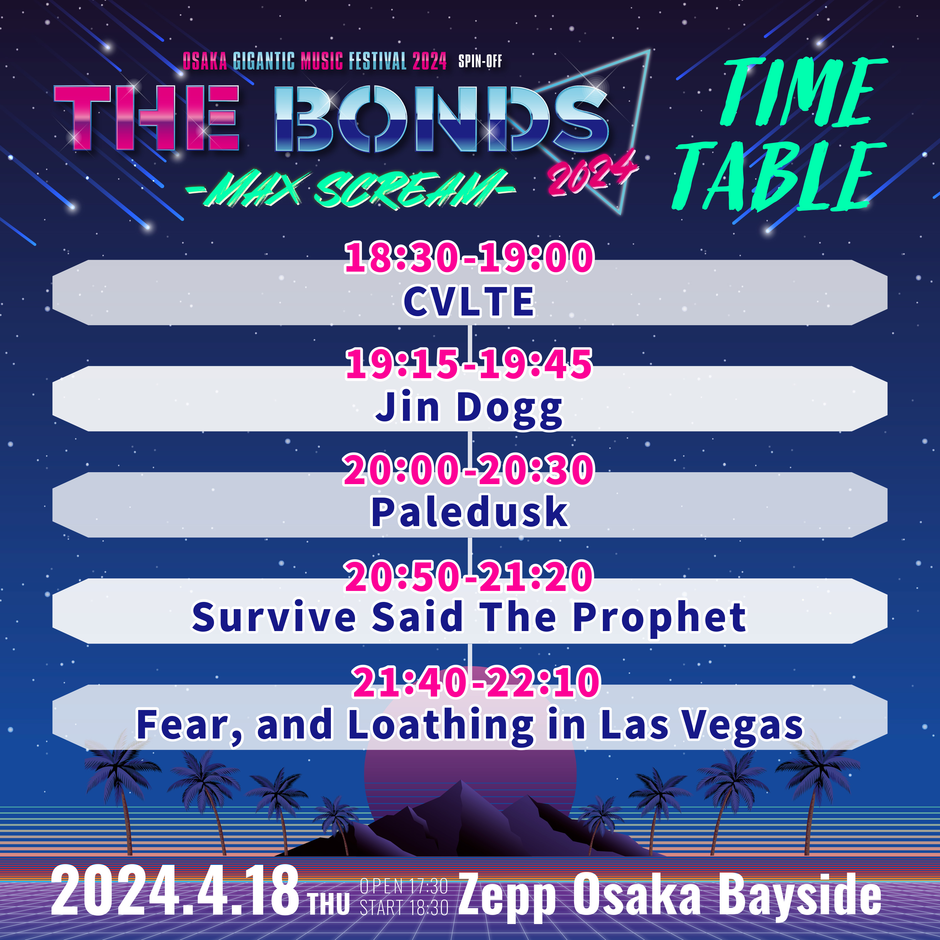 4月18日(木)にZepp Osaka Baysideにて開催される、『ジャイガ』スピンオフイベント『THE BONDS 2024-MAX SCREAM-』のタイムテーブルが公開された。