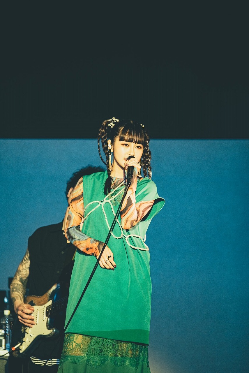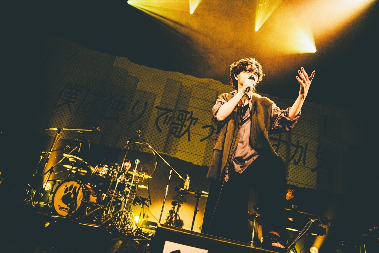 9曲目「fish」からは、ステージ後方のスクリーンに映像が映し出される。この楽曲では、水泡が地上に向けてぽこぽこと浮かび上がるなど、楽曲の世界観を引き出す演出に。イントロとアウトロでは、原曲にはないキーボードの独奏が、渇愛の想いを情緒いっぱいに膨らませ、じっくり、たっぷりとその音色に酔いしれる時間となった。