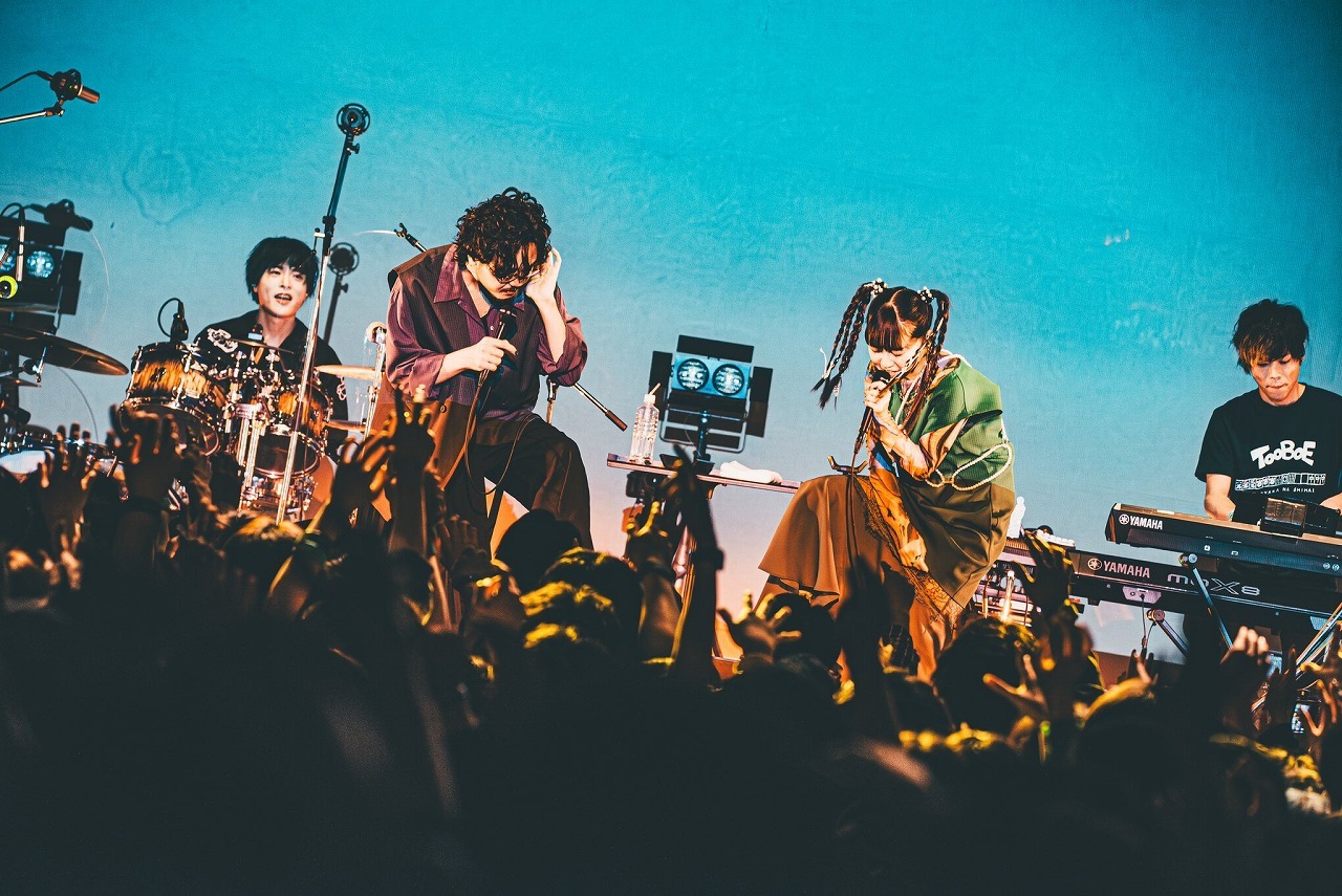本編終盤には、john名義のセルフカバー「ヒガン」で、〈まるで死んだ真夏の廃魚〉のように、純愛ながらも歪んだ愛情を日向に背を背けつつ高らかに歌うと、メジャーデビュー以降の“始まり”の楽曲である「心臓」では、MVをバックに熱唱。会場一体となって間奏で鳴らした三三七拍子を受けて、TOOBOEもその熱を返すように、大サビの〈間違いも愛せるよ 馬鹿なもんでさ〉を、ブレス抜きで流すように歌うなど、気持ちよくのびのびと歌い上げる。最後は「往生際の意味を知れ!」に「浪漫」と、緩急あるドラマティックな楽曲で大団円を迎えた。