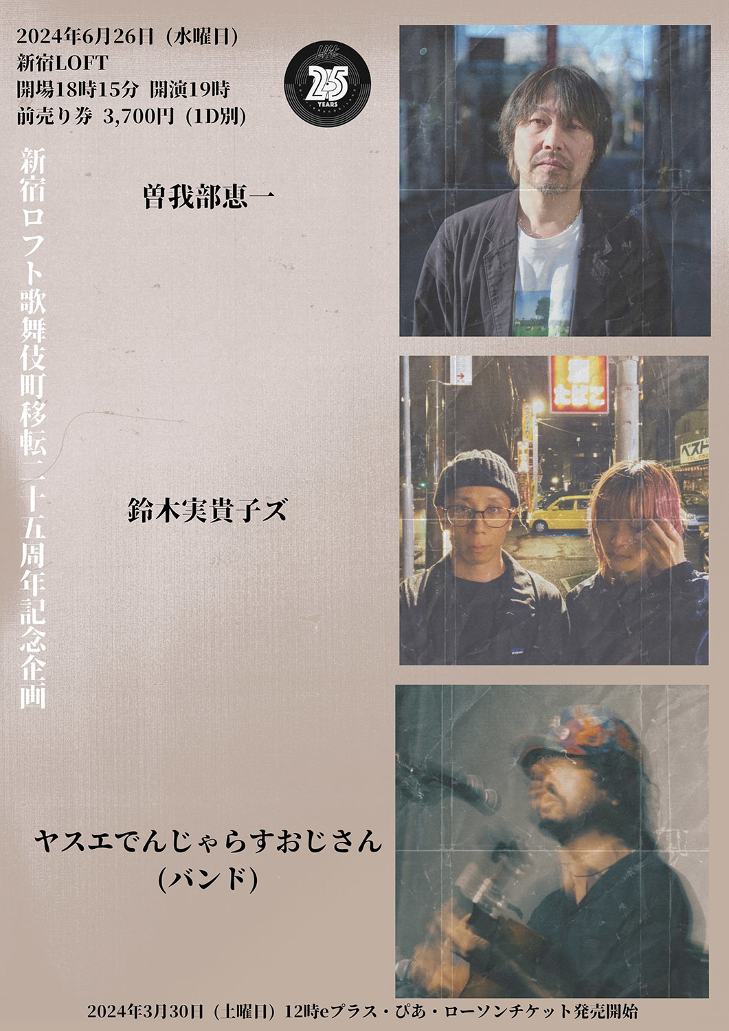 2024年6月26日(水)に新宿LOFTで開催される「新宿LOFT歌舞伎町移転25周年記念」として曽我部恵一×ヤスエでんじゃらすおじさん (バンド) × 鈴木実貴子ズの3マンライブが開催されることが決定した。