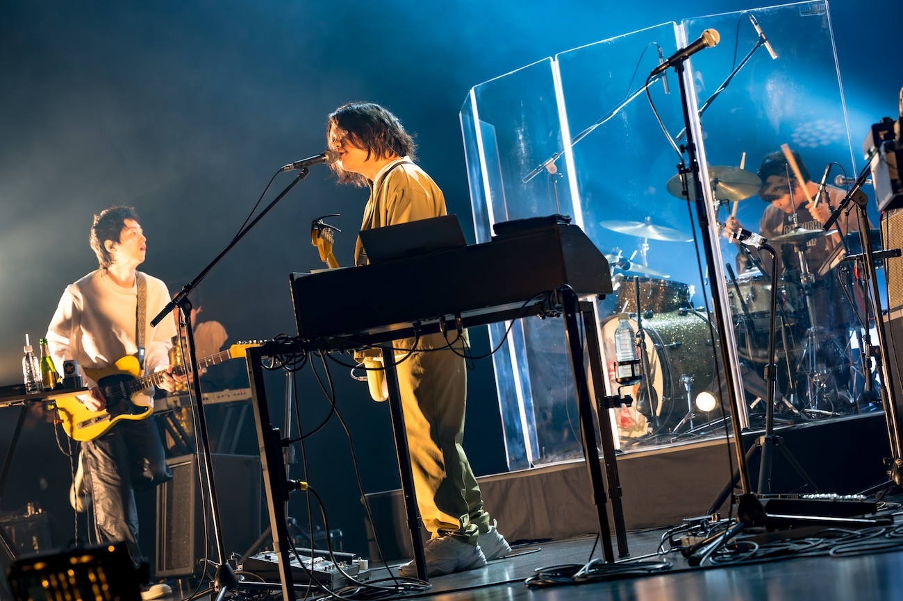 転換も暗めの青いライトが照らされたまま行われ、ギターとシンセで作られたと思しきSEは海のイメージを作り出す。まさにGalileo Galileiのステージへの幕間にぴったりだ。程なくGalileo Galileiのメンバーが登場すると、イントロのSEに歓声が上がる、「リジー」だ。バンドアンサンブルが入ってくると、瞬時にBBHFとのサウンドの違いが鮮明になる。この曲の包容力や優しさのせいもあるけれど、特にギタリストのカラーの違いは鮮明で、岩井郁人(Gt/Key)のシューゲイズ色の昇華の仕方は際立っている。加えて、雄貴がフロアに向かって開かれたパフォームをしているのも顕著な違いだろう。