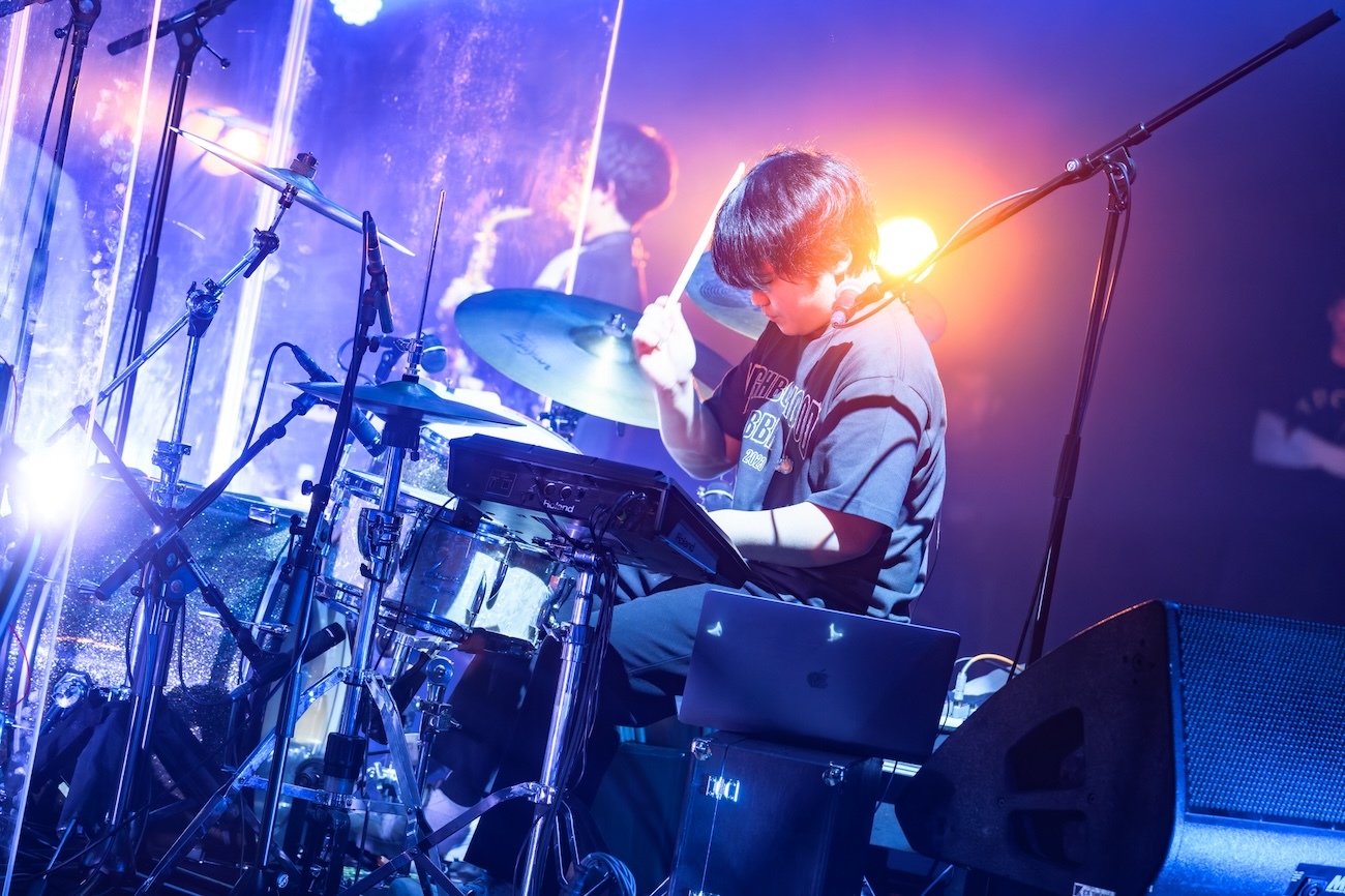 強烈な白いバックライトが始まりの合図のように「ノーキャスト」が始まり、自然とクラップが起こる。<運命を盗み取り 書き直せる>と歌う力強さを獲得した今のGalileo Galileiを祝うようなクラップだ。そしてアトモスフェリックなシンセのレイヤーで構成される「ピーターへ愛を込めて」へ。生音とエレクトロニクスの有機的な交差はそれそのものが会話のよう。岩井と岡崎真輝(Ba/Key)、もっと言えば和樹も大久保も含めた全員のユーティリティプレイヤーぶりが発揮された。