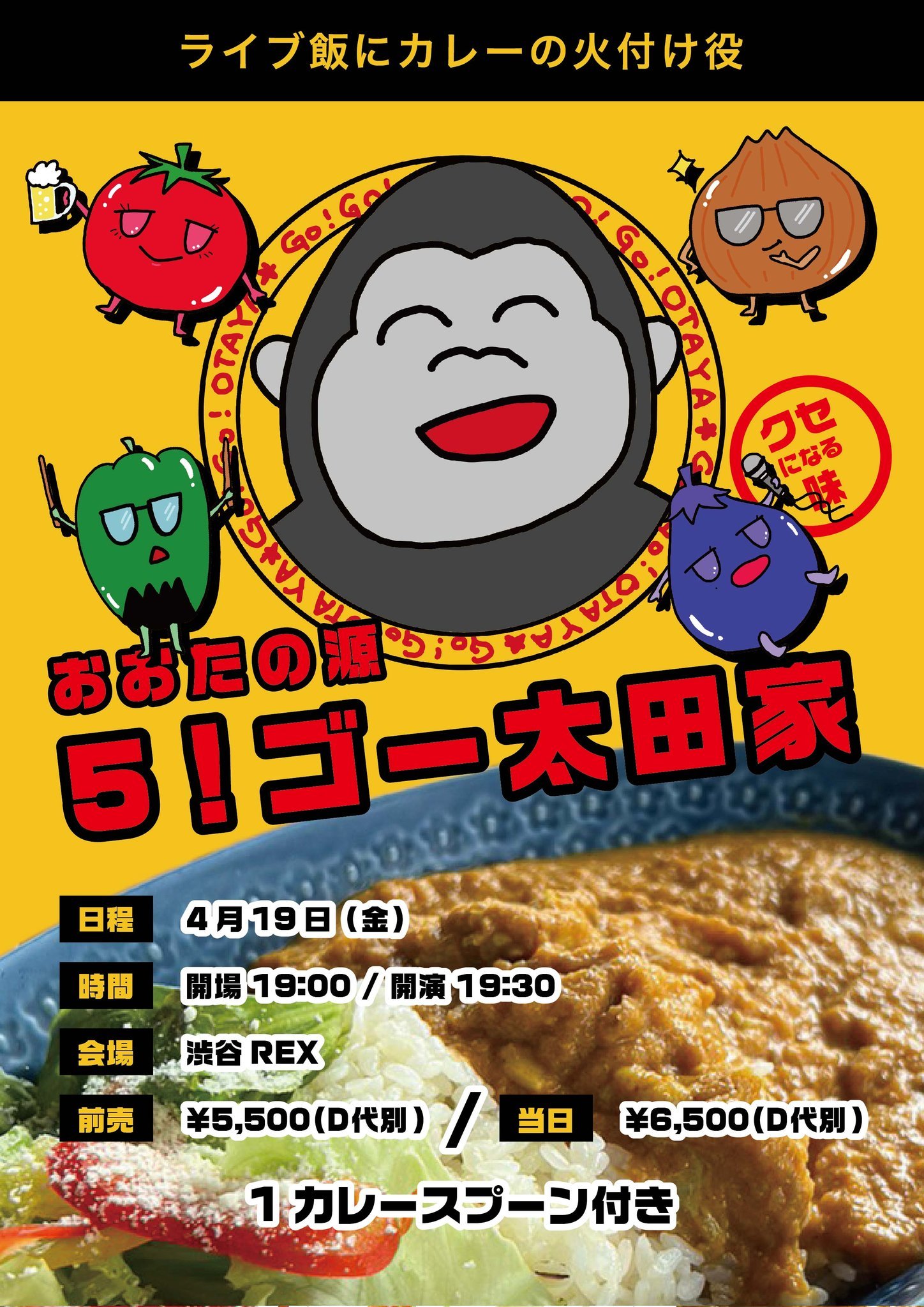 太田家は、4月19日に渋谷REXで5周年記念ワンマンライブ『おおたの源 5!ゴー太田家』を開催する。渋谷REXは、太田家にとって初となるライブ会場。この日はチケットには、カレースプーンが付いてくることに加え、会場内ではカレー弁当の販売も行われる。