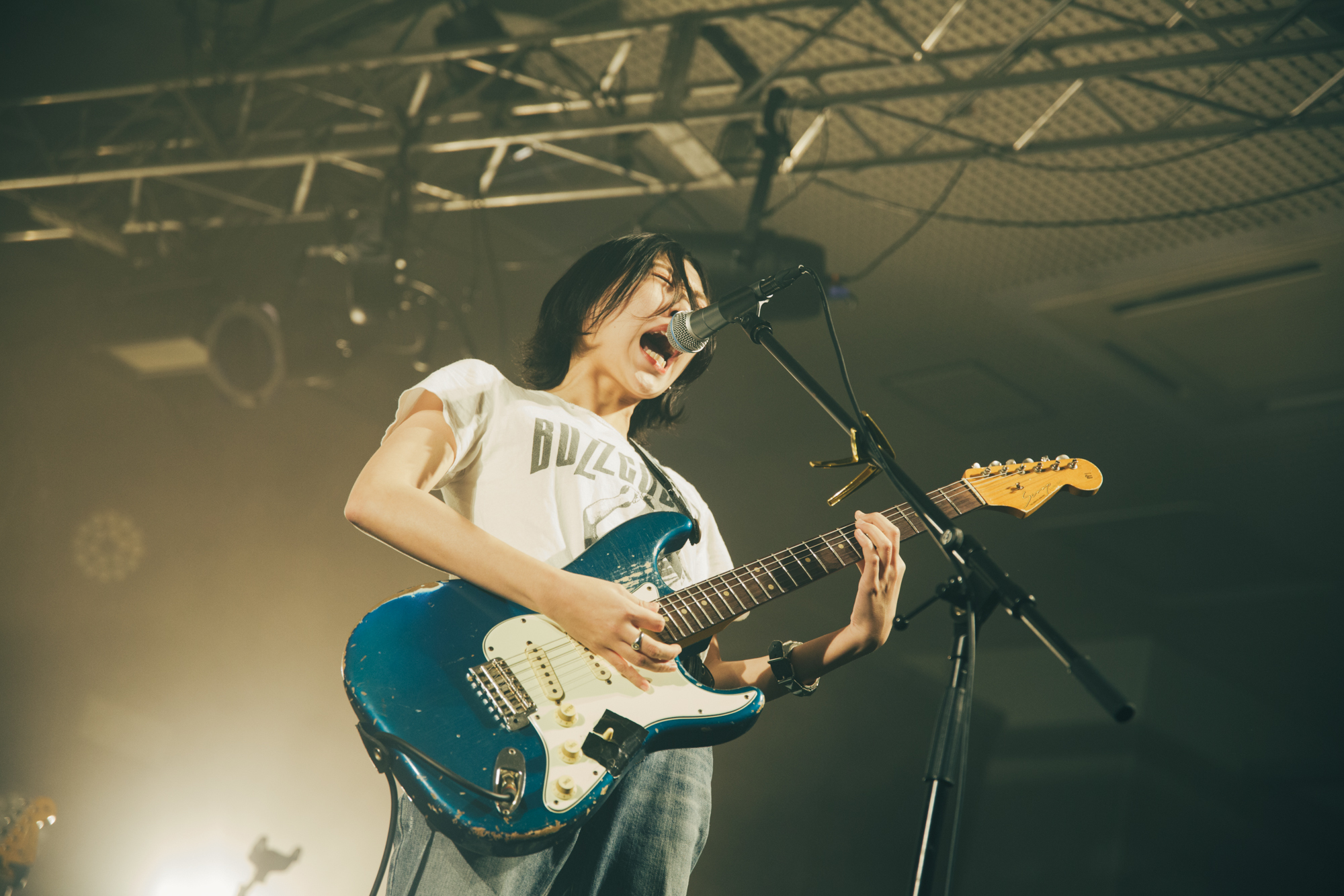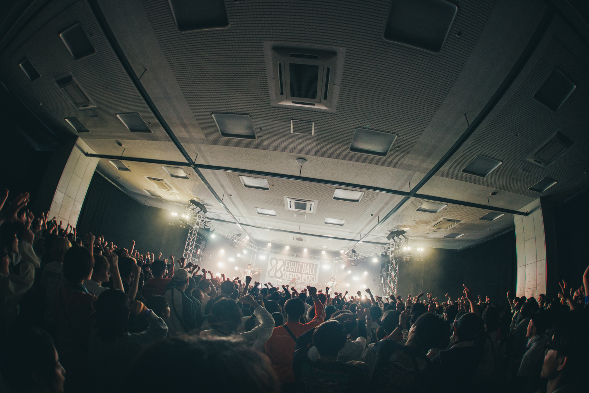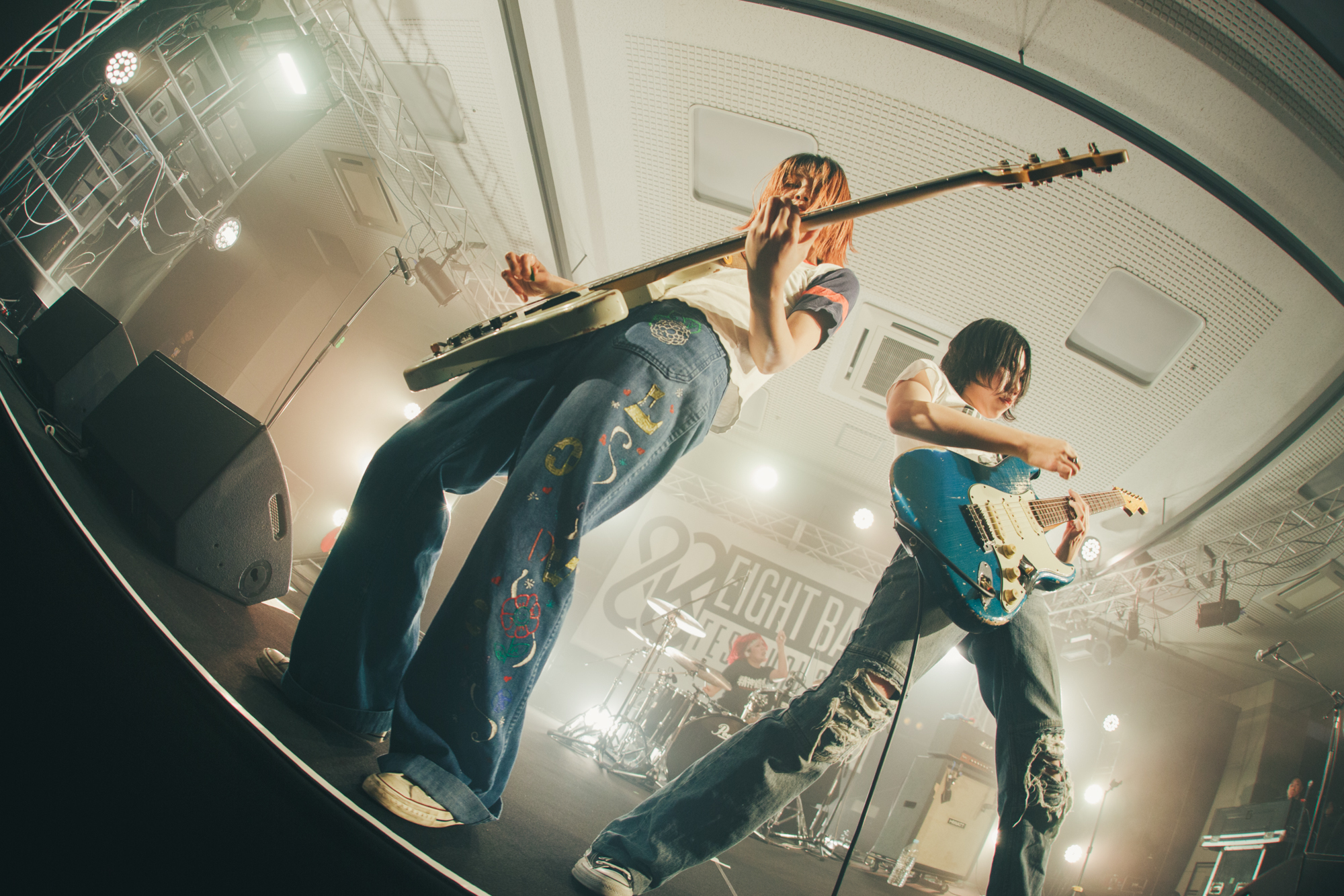 空気を震わせるほどの気概を音にのせ、そこから「ライブハウス」へとつなぐ展開の熱量たるや! 「from ガラガラの岡山のライブハウス! 倉敷REDBOX生まれ、岡山CRAZYMAMA 2ndRoom育ち。岡山ペパーランドで修行して、岡山CRAZYMAMA KINGDOMにたくさんチャンスをもらって。今日、『EIGHT BALL FESTIVAL』に挑戦しに来ました!」なんて無舗装の軌跡を凝縮した咆哮に、もはや涙腺決壊。その場の全員が声を振り絞ってのシンガロングを経て、「1998」でのゆきなりとしおきちが向かい合って弾き合うシーンにもグッと胸をつかまれる。