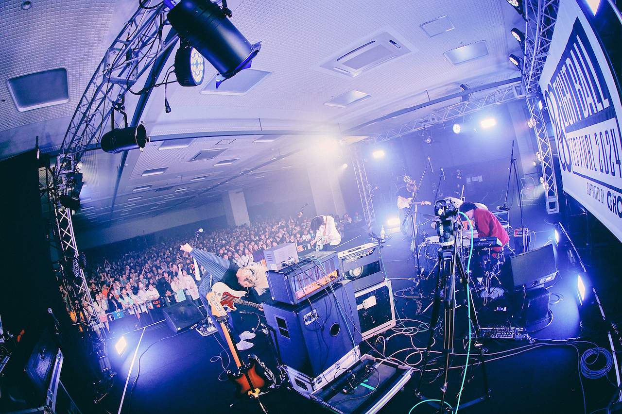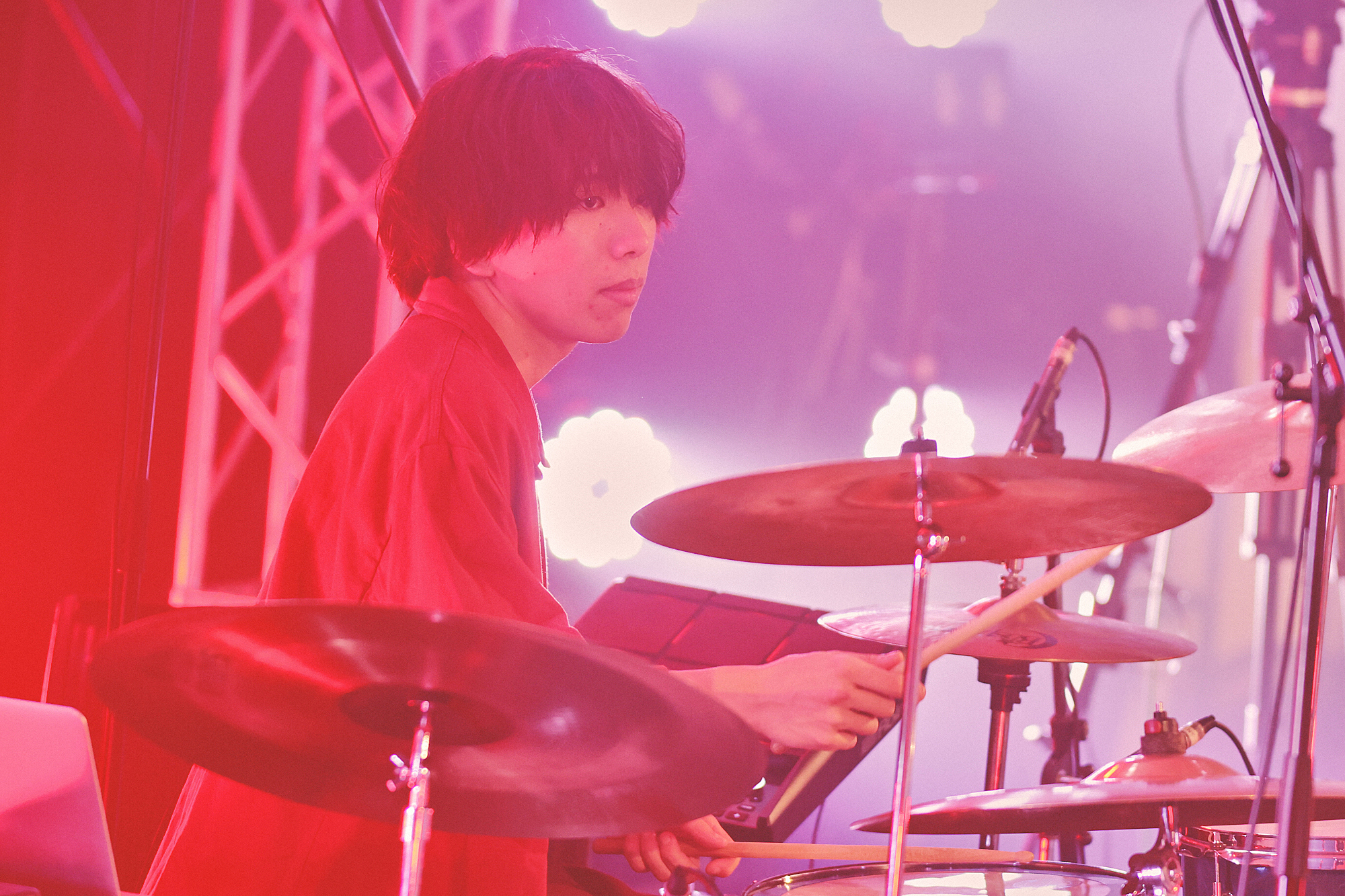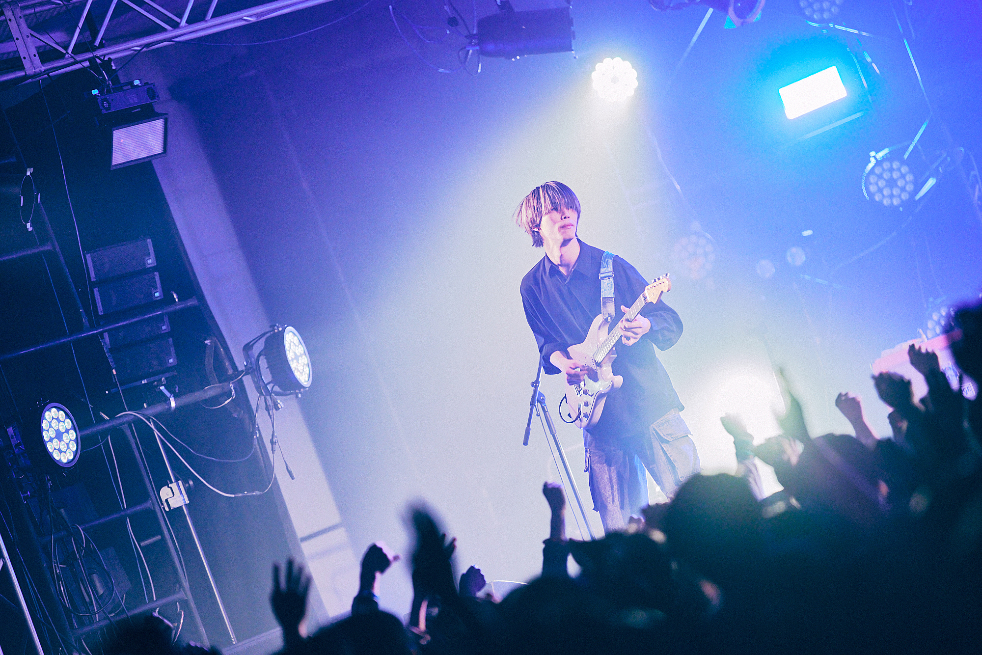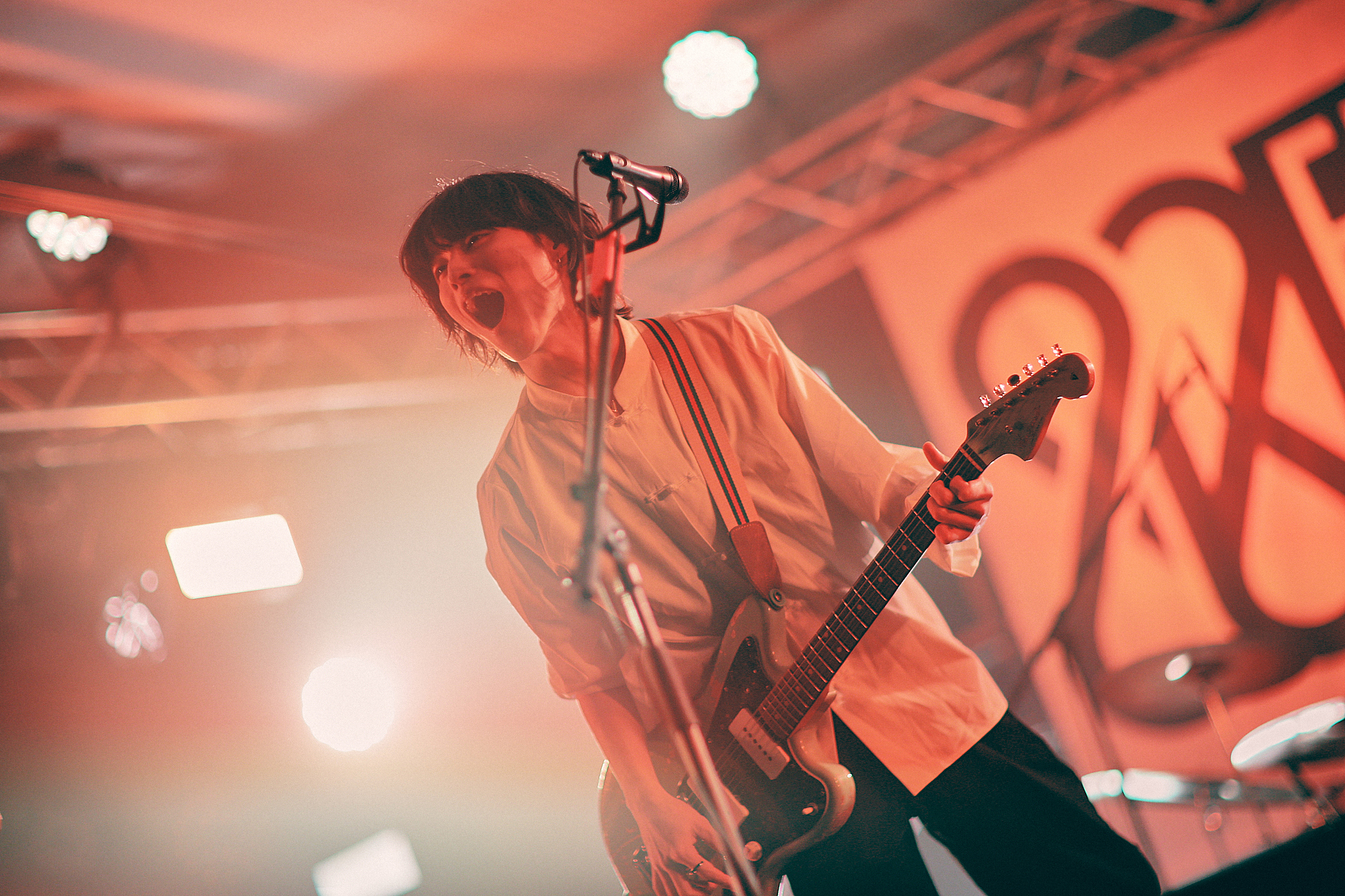 2月にリリースされたミニアルバム『ENSEMBLE CAST』収録の「少年少女」でも、漂うメランコリーとポップセンスの黄金配合で、いつの間にかびっしり埋まったフロアを大いに沸かせる。続く「letter」しかり、繰り出す曲がことごとくグッドメロディで、フックのあるリフとしなやかな歌声がどこまでも広がっていく。
