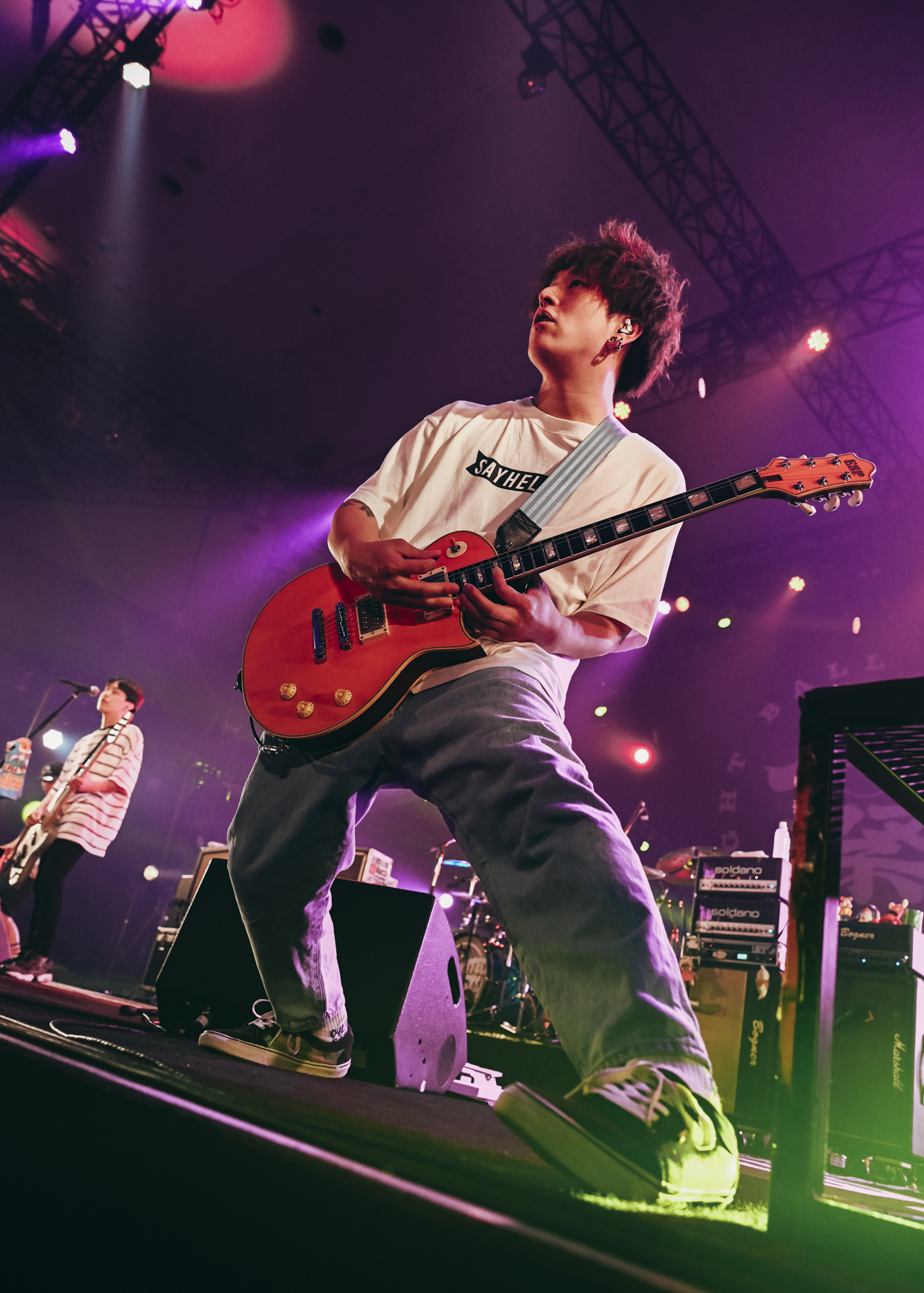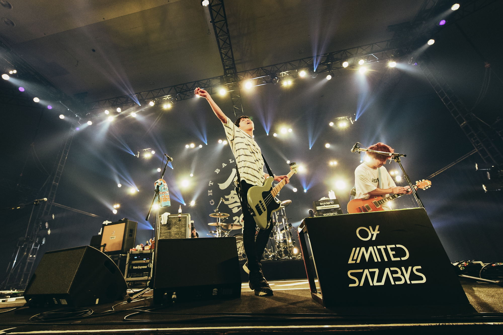 2年連続の出演となった04 Limited Sazabysは、サウンドチェックで鳴らした「Kitchen」や「message」「Keep going」の段階で、SOLID STAGEを余裕でブチ上げる王者の貫禄。本編では演奏しない楽曲をさらりとやってのけ、「準備はできてる? 一緒にいける!?」とGEN(Ba.Vo)が呼び掛ければ、オーディエンスはもう準備万端。