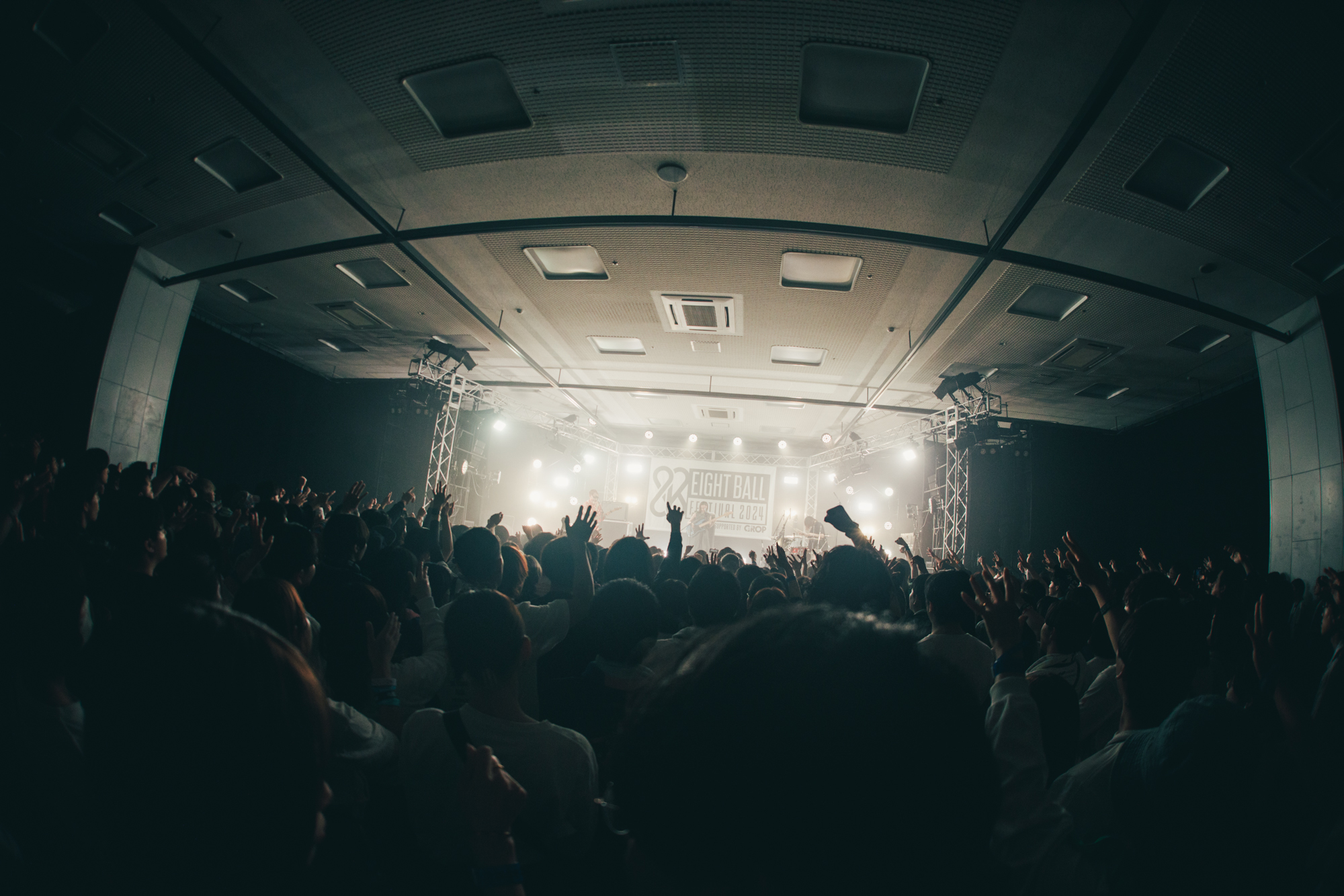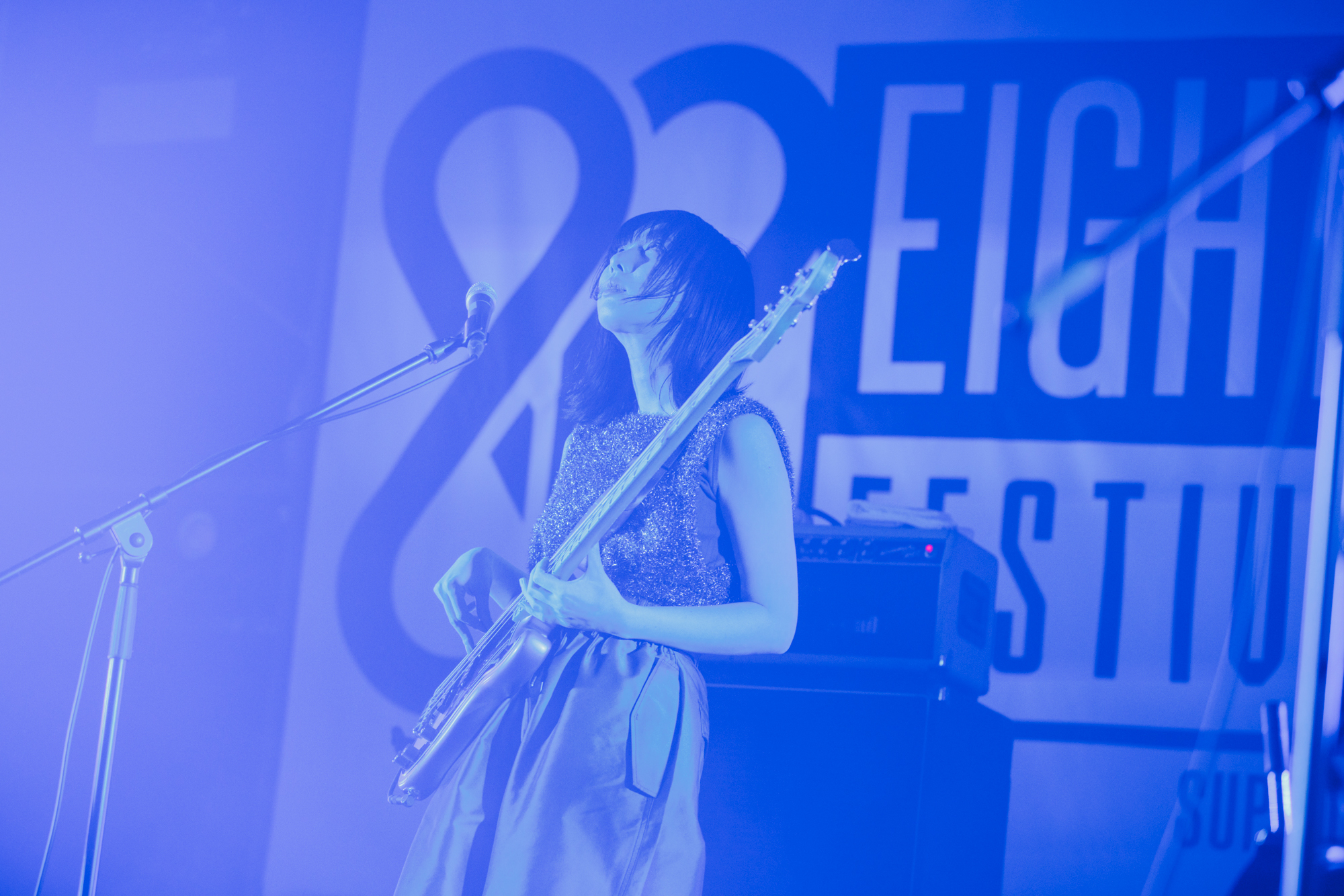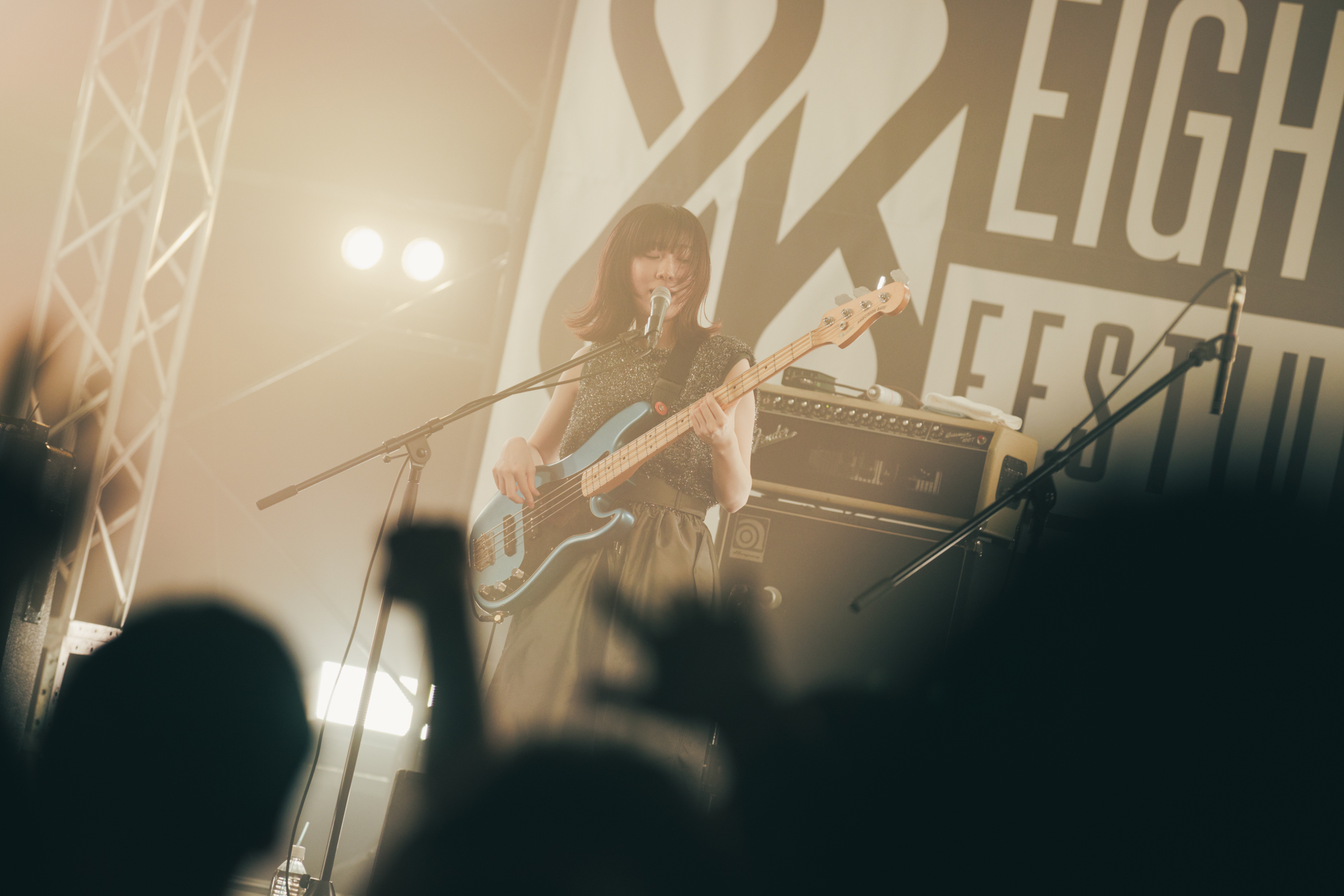 ステージは淡々と進められていく。それでも、「『EIGHT BALL FESTIVAL』、お越しいただきありがとうございます。新曲をやります」と、4月4日(木)に配信予定の新曲「キラキラの灰」へ繋げていく。かき鳴らすギターは軽やかだけど、しっかりと地に足のついた太い芯が感じられる。ドラムのビートも力強くて、楽曲に確かな息吹を感じさせてくれる。