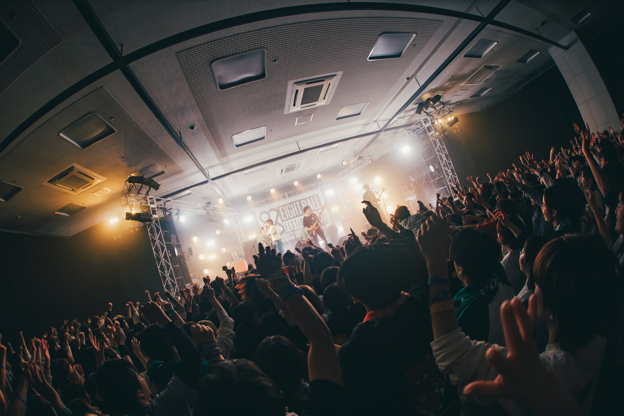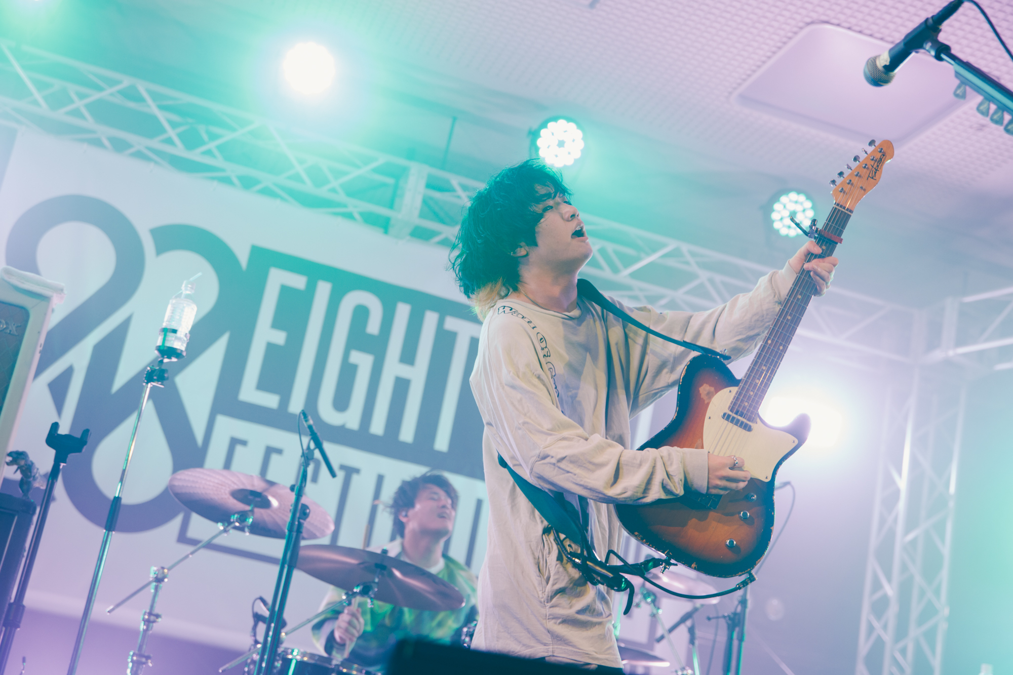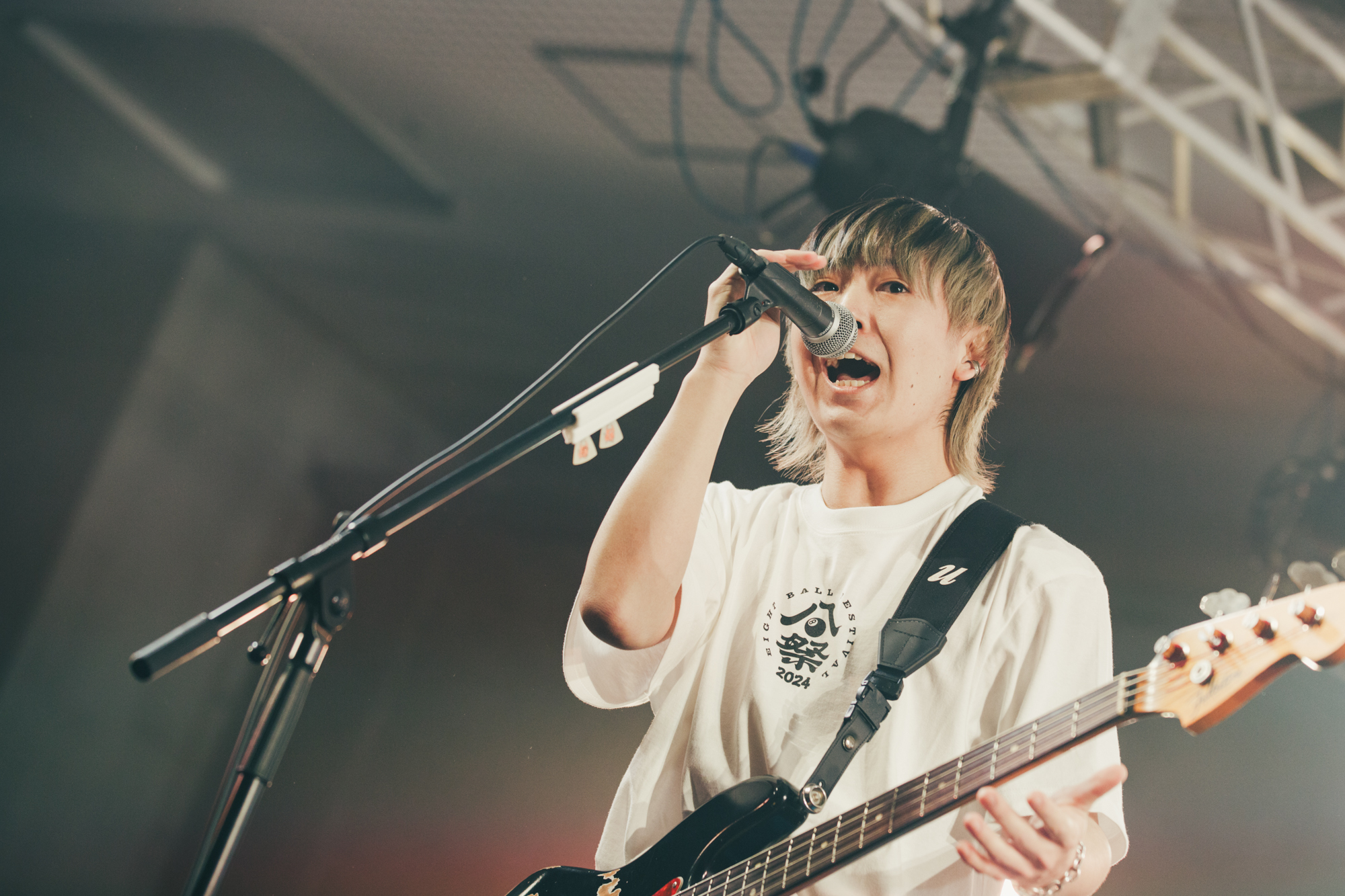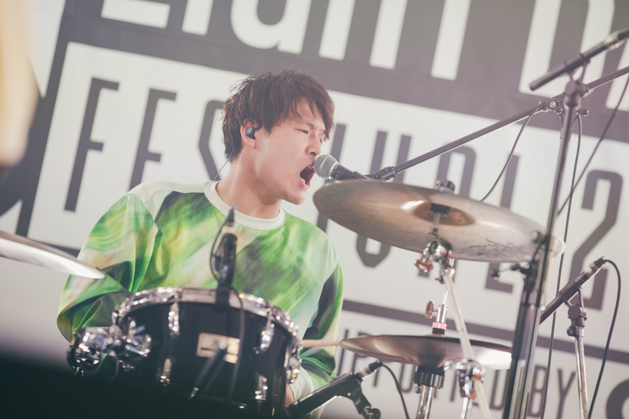 ここで急きょ、「今日、いろいろと後ろから見てて思った。どういうものを求めてるかが分かった。セトリ変えます!」とえいが告げ、ライブ鉄板の高速チューン「満月じゃん。」を投入! その狙い通りの熱狂が巻き起こり、あまりの暑さにバックヤードに着替えに戻ったえいは、『EIGHT BALL FESTIVAL』のグッズTシャツを身にまとって再登場。リフレインするギターが高揚感を誘う「夏の迷惑」でもオーディエンスの合いの手はバッチリで、ライブという名の信頼関係が見ていて伝わってくる。