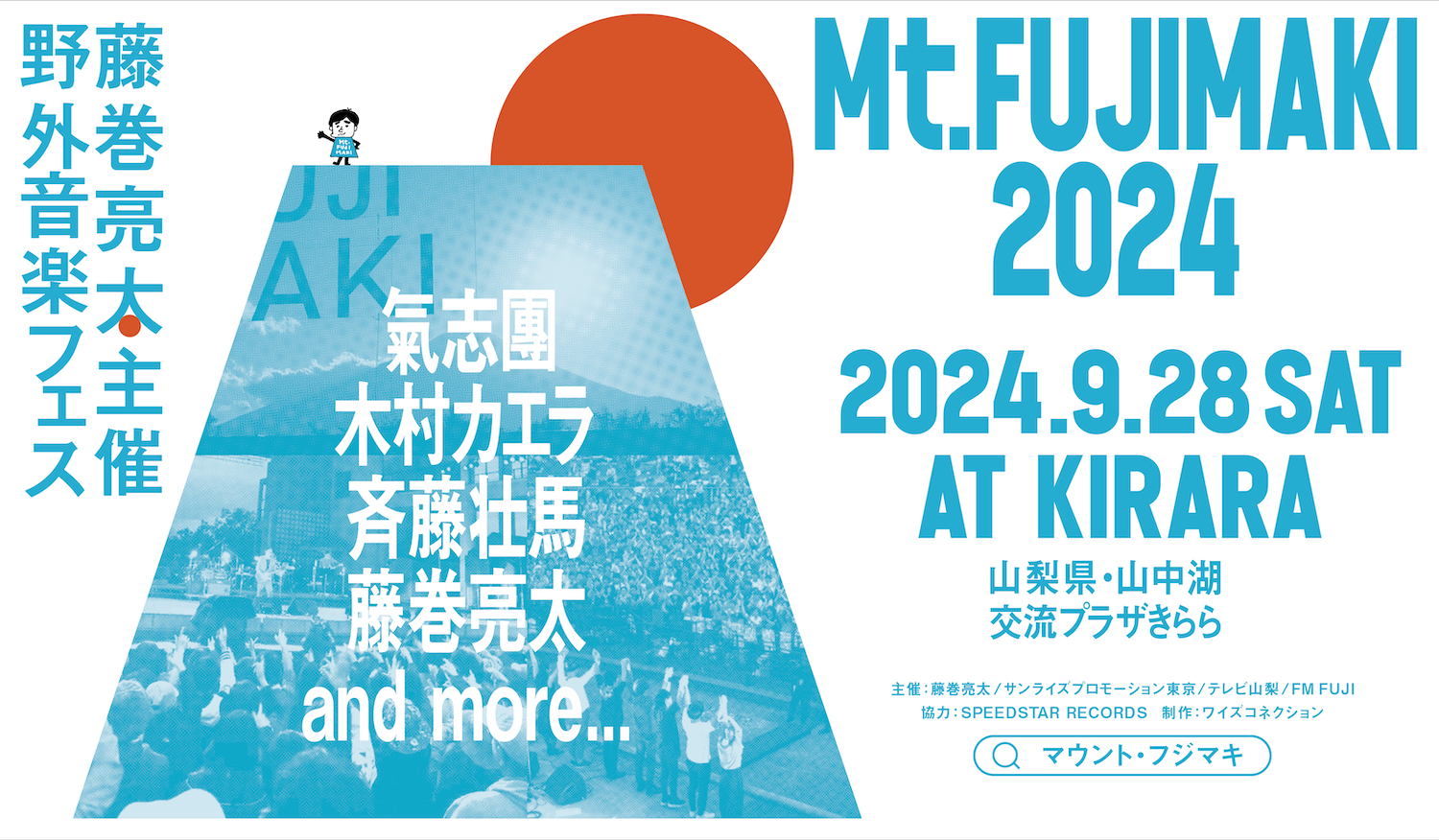 藤巻亮太がオーガナイザーを務め、2024年9月28日(土)に自身の地元である山梨県の山中湖交流プラザ きららで開催される野外音楽フェス『Mt.FUJIMAKI 2024』の第一弾出演者が発表となった。