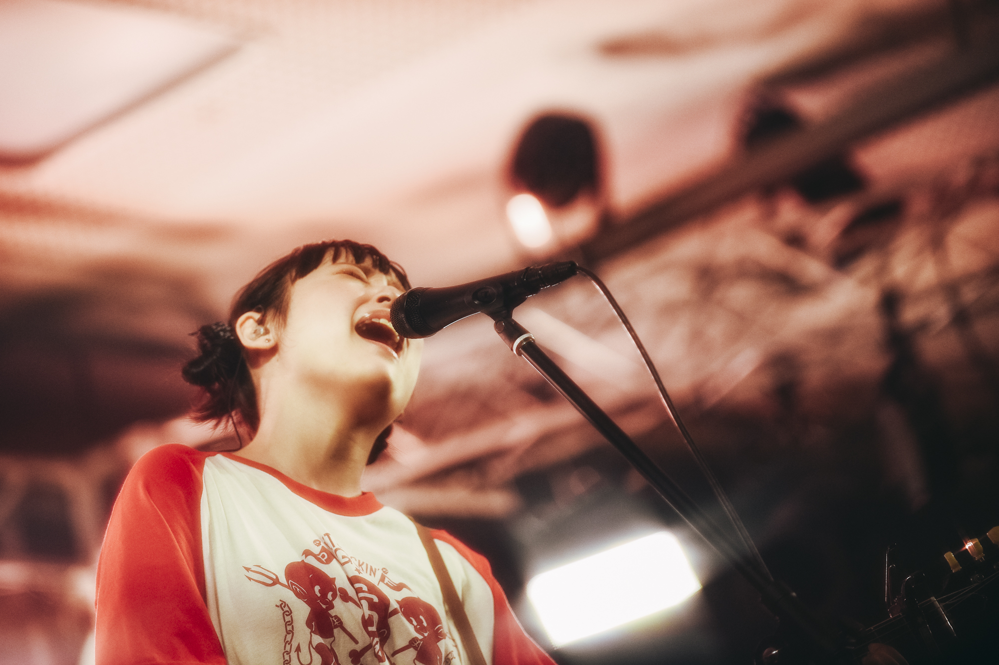 待ちに待った本編、赤いラグランシャツがキュートななち(Vo.Gt)が元気いっぱいにお立ち台で両手を広げ「岡山のみなさん、初めましてサバシスターと申します!」と、1曲目「ナイスなガール」へ。濁りなしの直球ロックンロールサウンドに自然と体が揺れてしまう。