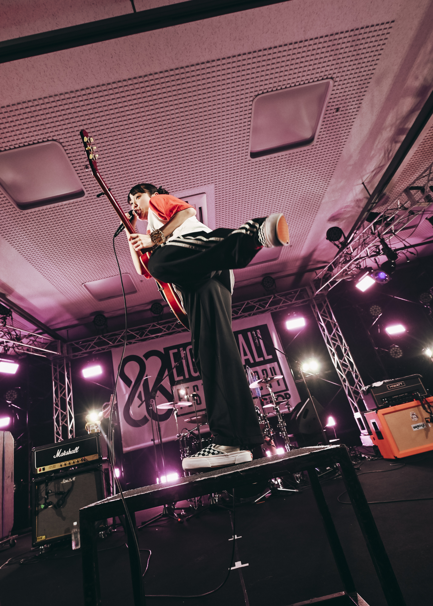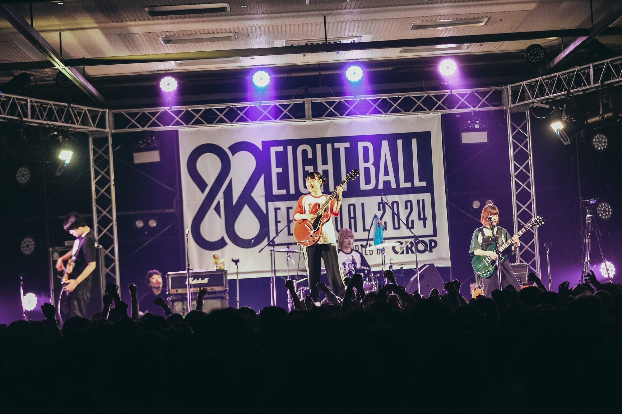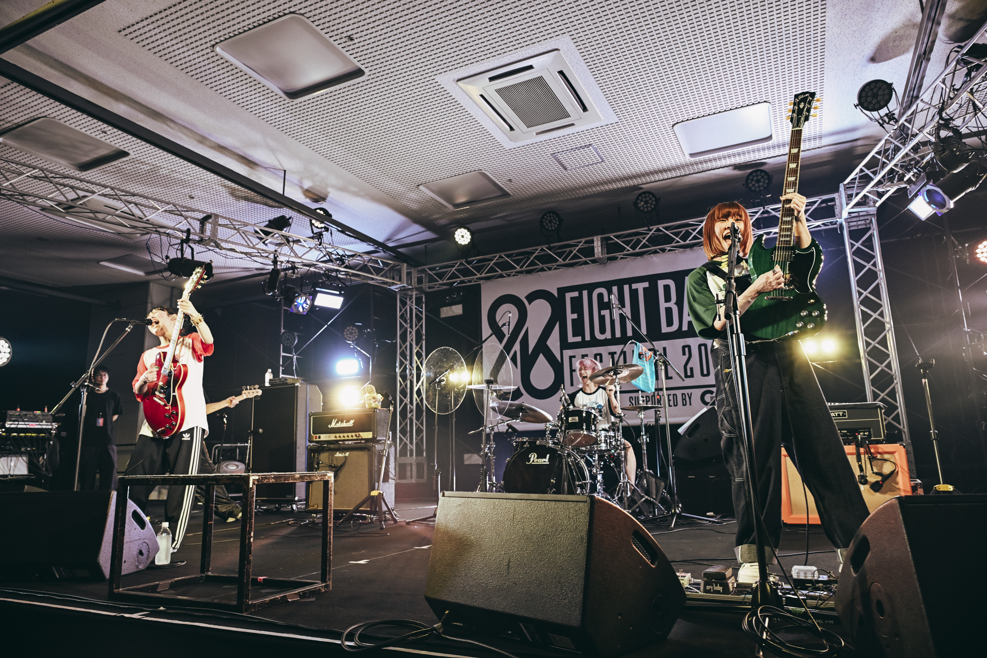 STRIPED STAGEの2番手は、今年3月8日「サバの日」にメジャーデビューしたばかりのサバシスター。サウンドチェックでは「スケボー泥棒!」「22」と、ご機嫌なサウンドでフロアの熱を高めていく。この時点で拍手喝采が沸き起こるし、フロアはすし詰め状態だし、『EIGHT BALL FESTIVAL』はもちろん、今年もすでに全国各地のフェスに出演が決定しているとあって、今の彼女らへの期待値の高さに改めて驚かされる。