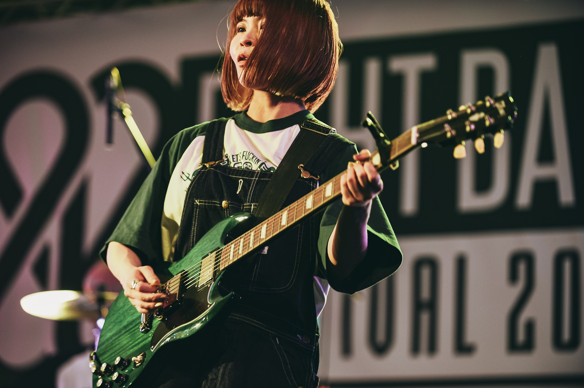 「精一杯やりたいと思います。サバシスターもイベントも楽しんでもらえたら」と、初の岡山、初の『EIGHT BALL FESTIVAL』出演に思いを語るなち。彼女の言葉通り、この日初めてサバシスターのライブを観たという人も多いだろう。けれど、ど真ん中のロックンロールサウンドはあっという間にオーディエンスの心を魅了してしまっている。なによりなちが描く歌詞は日常のさりげない部分、というか当たり前に起きているけどスルーしてしまっているような日々を描いたものが多くて。「あ〜こんなことあったな」、「あれ楽しかったよな」、「悔しかったよな」なんて共感が多くて……気づけば心にすっかり溶け込んでしまっている。