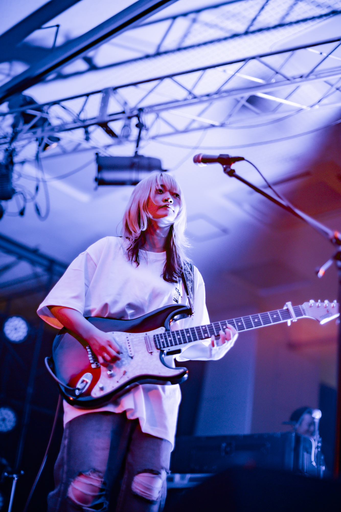 幕開けの「知らない惑星」から、演奏中にもどんどんオーディエンスが増えていく中、キュートな歌声とそれに絡みつく岡田安未(Gt.Cho)のエモーショナルなギターでもスリリングに魅せていく。「なきごとには珍しく、全員でジャンプしようという曲があります」(水上、以下同)といざなった「Summer麺」では、見渡す限りの観客が跳ねに跳ねる光景を前に、何ともうれしそうな表情を浮かべる。