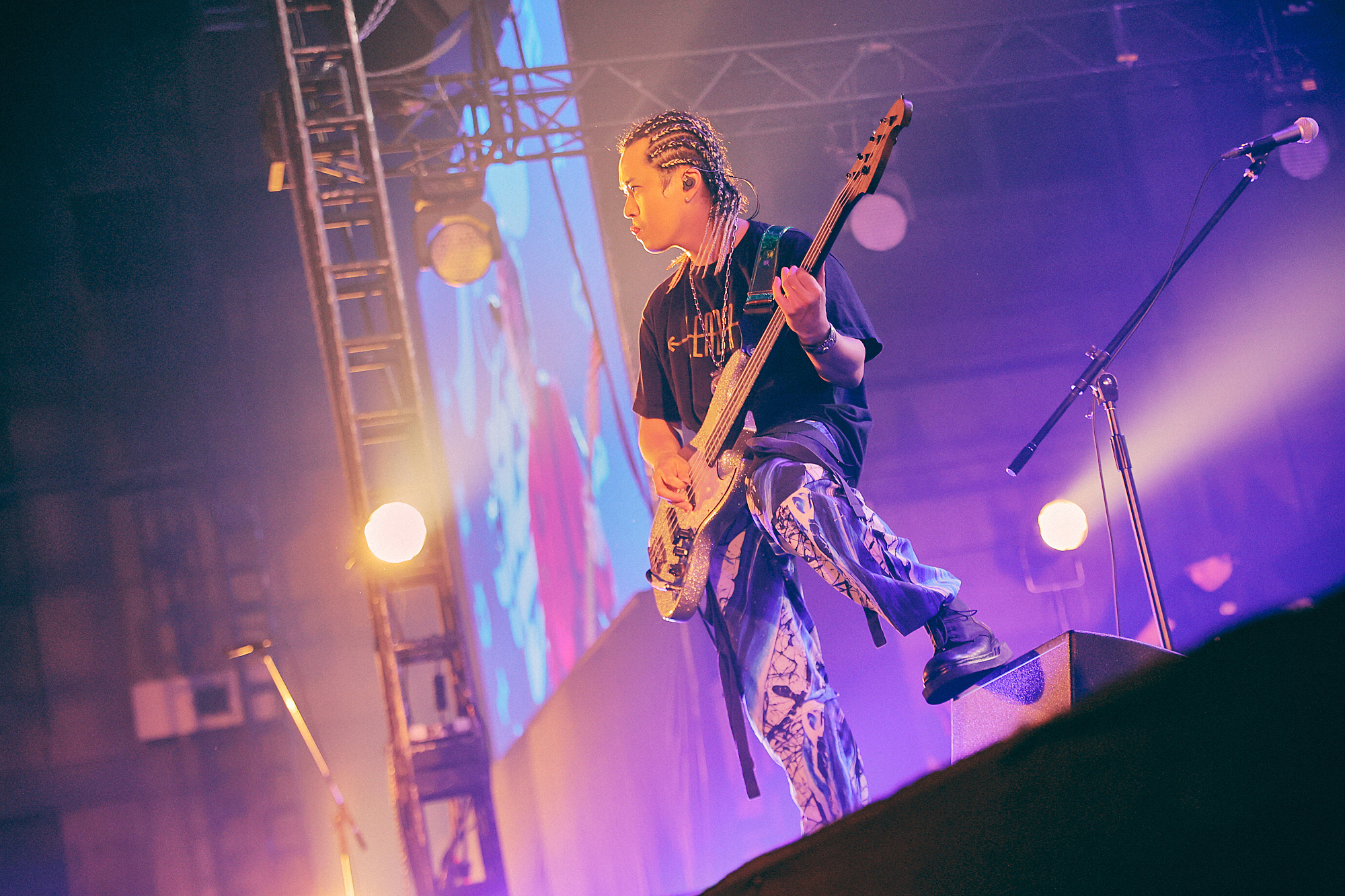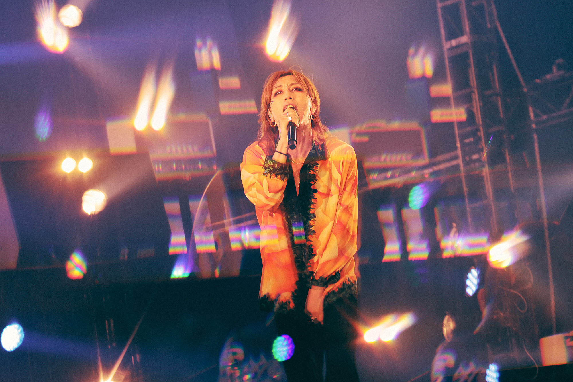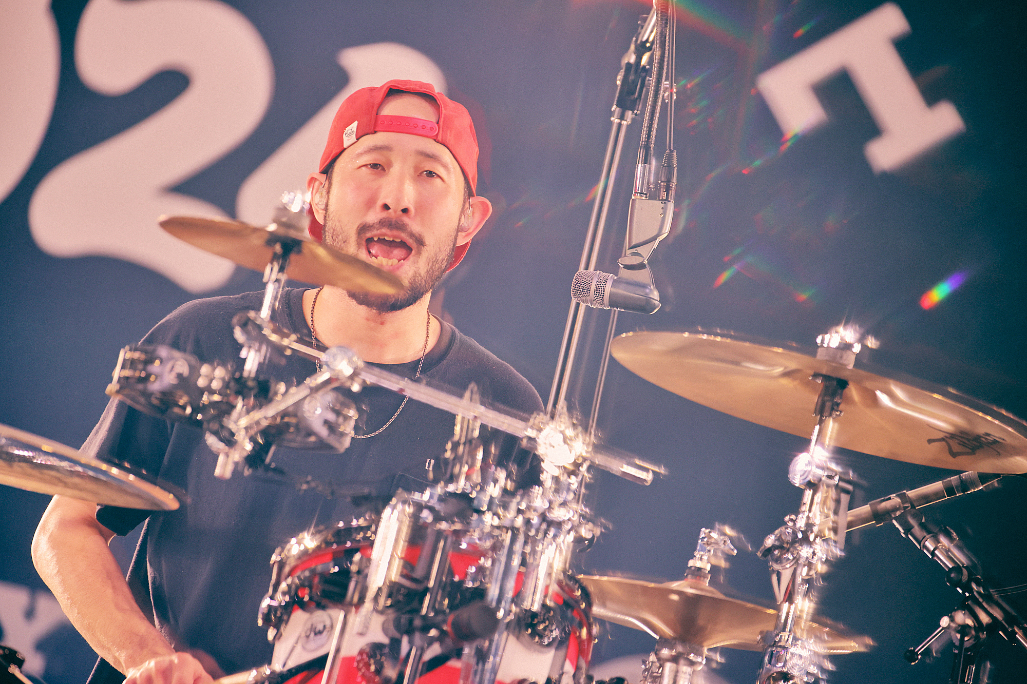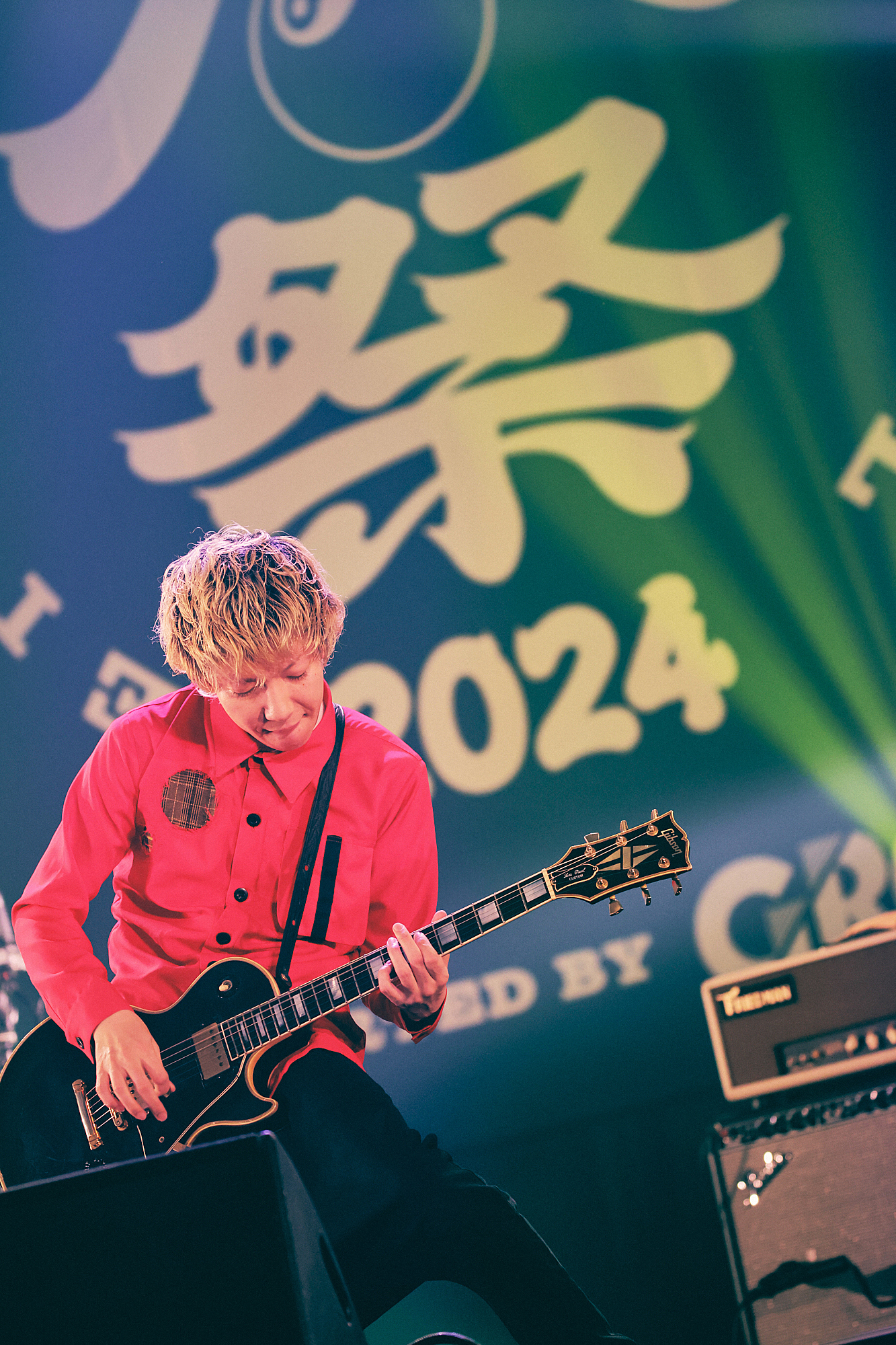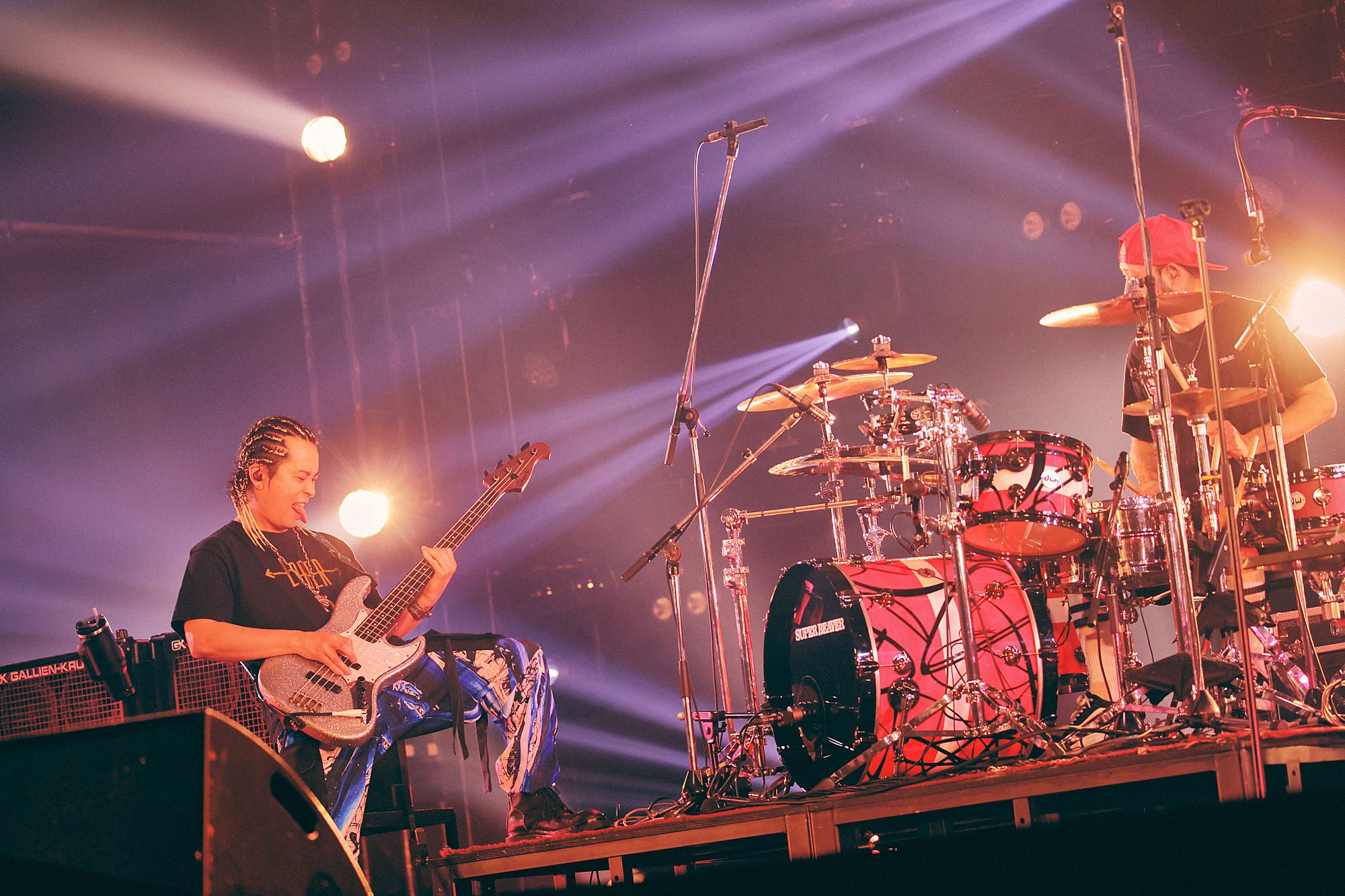 始まりの「アイラヴユー」から地鳴りするような盛り上がりで、上杉研太(Ba)と藤原“35才”広明(Dr)の奏でる重低音もろとも、生でしか感じることのできないシビれる体感と熱量に圧倒される。壮絶な幕開けに「おはようございます岡山! 楽しむ準備はできてるか!?」(渋谷、以下同)と突入した「突破口」でも、音と光で容赦なく高揚感を更新していくすさまじい光景が広がっていく。