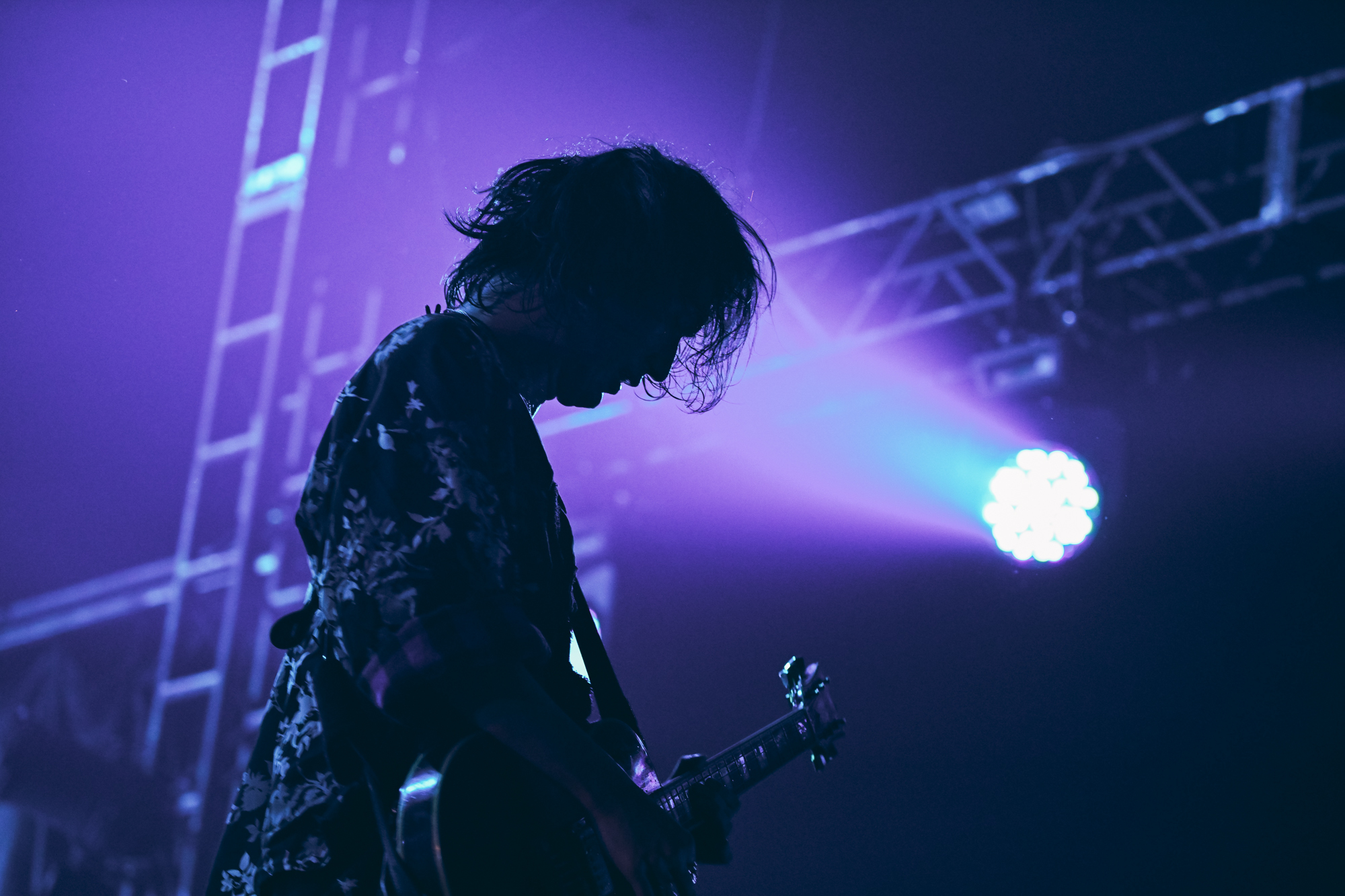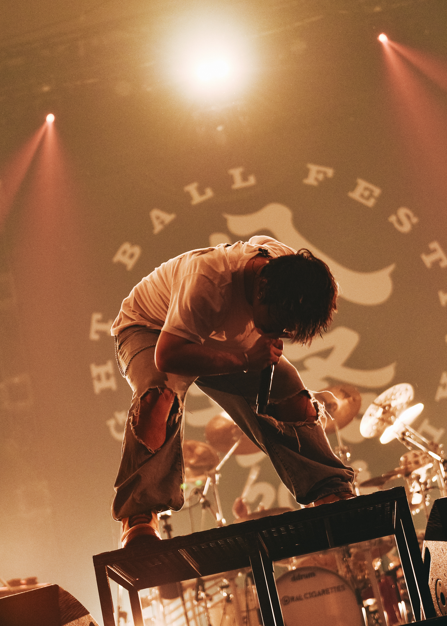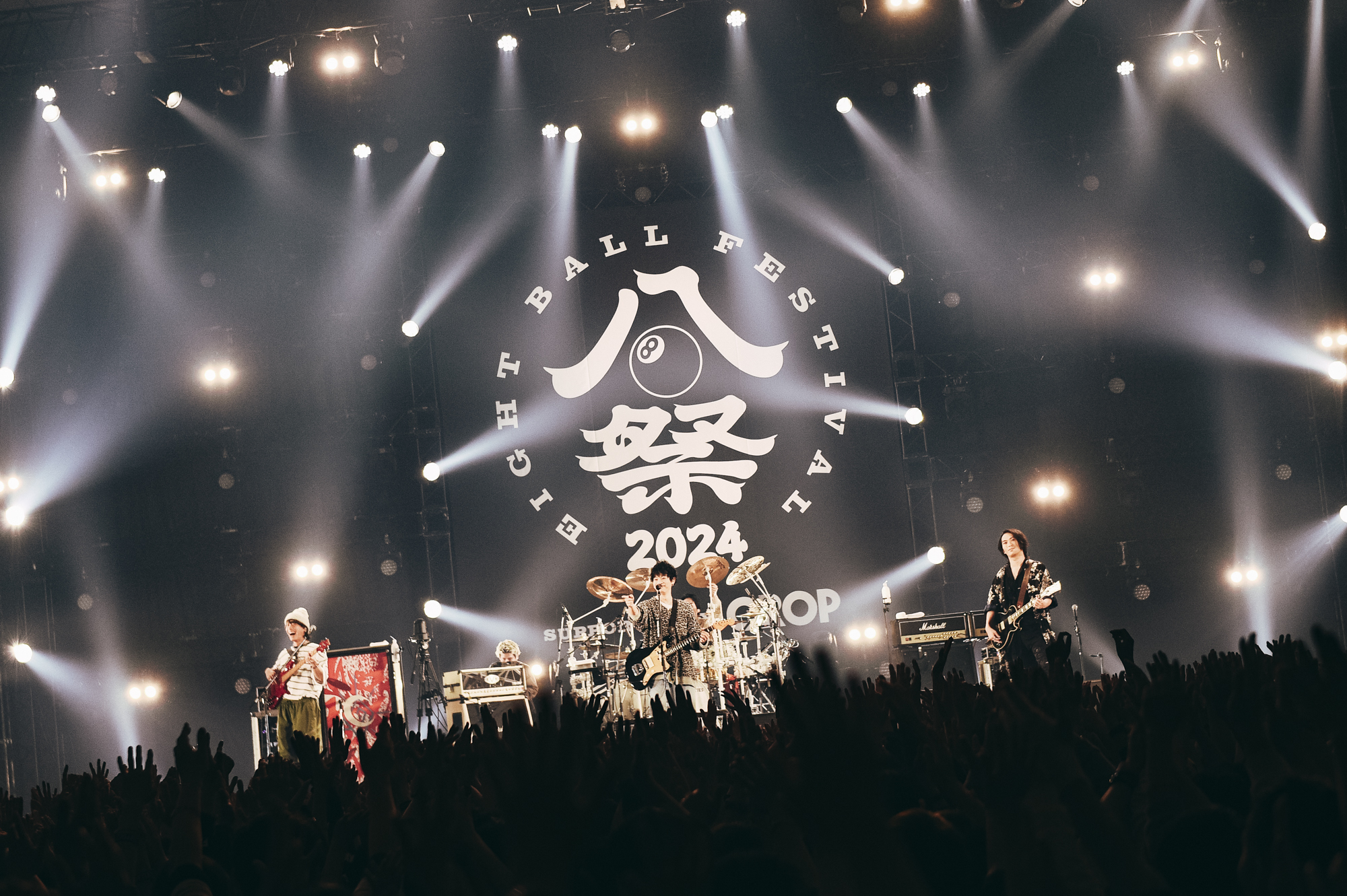 「初めまして。『EIGHT BALL FESTIVAL』の熱気はヤバいって聞いてますけど、しっかり準備してきたから。手を貸してくれ!」と山中拓也(Vo.Gt、以下同)が、彼らのライブでのお約束・4本打ちを仕掛けるも、前のめりゆえフライングするオーディエンス。こんな1シーンをとっても彼らへの期待感をひしひし感じる中、「mist…」から狂乱の宴が開幕に。一瞬のスキも許さない山中は「オイ、我慢してんちゃうん?」「もっと舞え!」と、あおるあおる。鈴木重伸(Gt)の鮮烈なフレーズにも頭を占拠されながら、眼前に広がる圧倒的なまでの盛り上がりは、大袈裟じゃなく1曲目のそれではない。