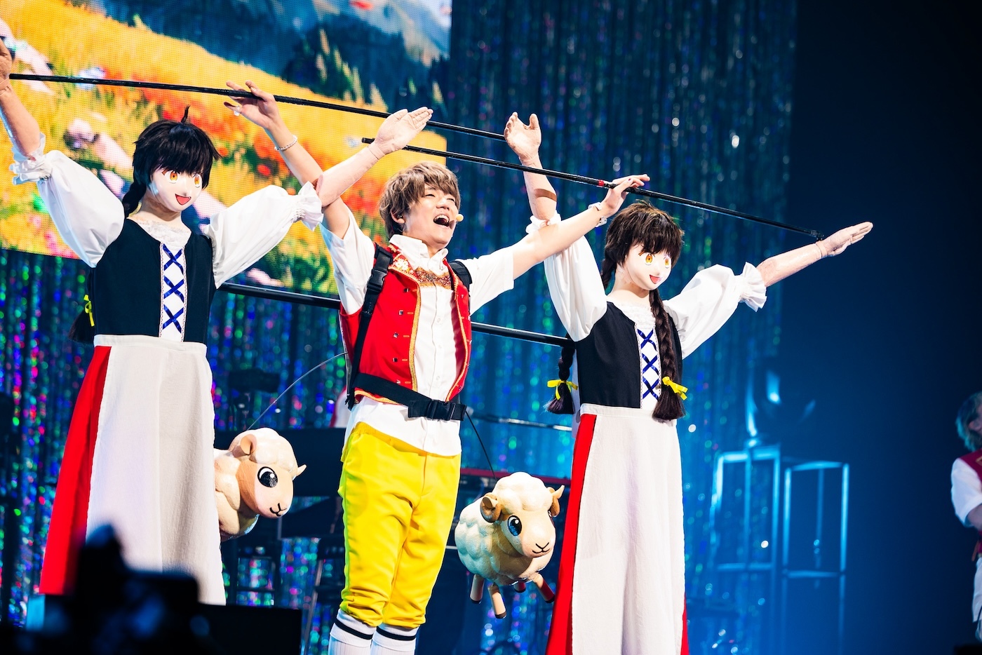 本編が終わり、客席から「アンコール!」の声が出始めると、サクッと映像が映し出され、「今日の掛け声はヤッホーでお願いします」との文字が……。観客も素直に反応し、「ヤッホー!」コールが響き渡る。すると、バンドメンバーとめいちゃんがアルプスの少年風の衣装で登場。スタンダードなヨーデル曲「She Taught Me How to Yodel」を楽しげに歌い始めた。しかも完璧なヨーデル歌唱をバッチリこなして、そのままバンドメンバーとステージを降りて客席通路へ。周辺の観客はめいちゃんとのハイタッチにあやかるなど、サービス満点のサプライズタイムだった。さらにはシンクロパペット(棒で固定した左右の人形とシンクロして踊るもの)を従えてダンスを披露。こういうエンターテイナーぶりはさすがと言うしかない。以降はTシャツに着替えて再登場。気持ちを切り替えて「大切な曲です」と前置きしつつ、自ら作詞作曲した「世迷言」へ。彼自身の葛藤が伝わる歌には、グッとくるものがあった。この後は大ラス曲である。ここでめいちゃんがツアー完走の思いを語り始める。