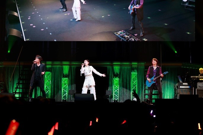 ANIMAXバンドによる生演奏も『ANIMAX MUSIX』の魅力のひとつだが、続く富田美憂の「Broken Sky」は、そんな彼らの技巧を存分に引き立つ楽曲だったと言えよう。「4月から放送の『デート・ア・ライブV』の主題歌を担当させて頂きまして、まだ世に1番しか出てない曲を今日は生演奏でフル初公開します!」と新曲「Paradoxes」を披露。打って変わってしっとりとしつつも彼女らしい力強い歌声のバラードで会場を包み込んだ。