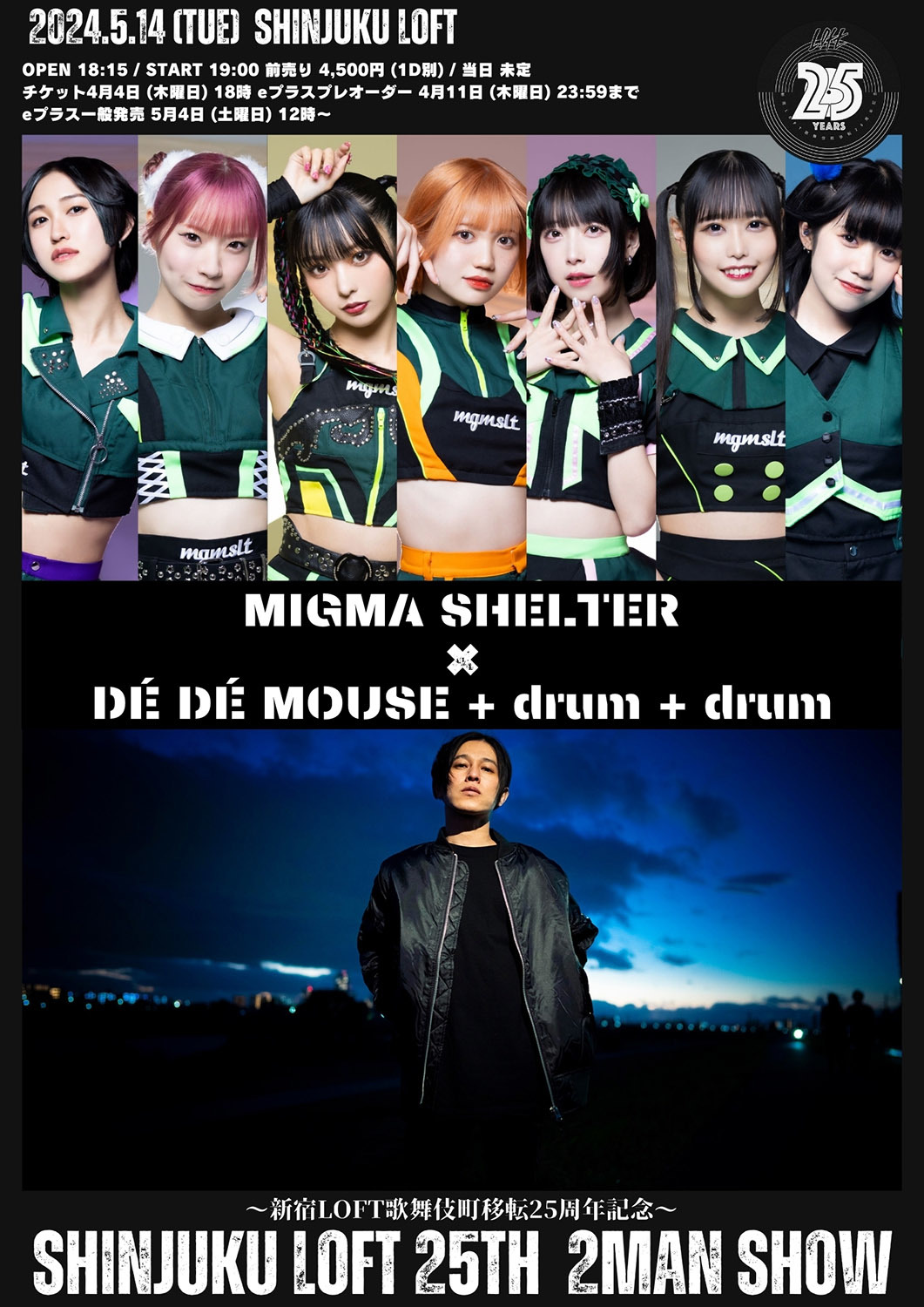 2024年5月14日(火)に新宿LOFT歌舞伎町移転25周年記念企画として、MIGMA SHELTER(ミグマシェルター)×DÉ DÉ MOUSE+drum+drumの2マンライブの開催が発表された。