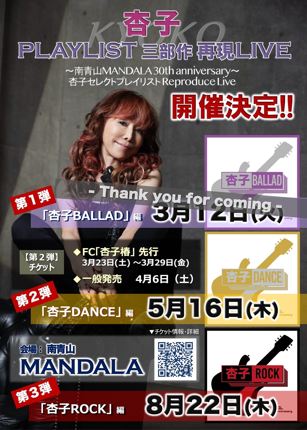 そして2024年はアーティスト杏子の魅力が熱く伝わるシリーズライブも開催。会場は今年30周年を迎える南青山MANDALA。杏子本人がセレクトしたプレイリスト三部作・再現ライブで、3月に行われた第1弾『杏子BALLAD』に続く第2弾は、5月16日『杏子DANCE』編、チケットは現在販売中。ボーカリスト杏子の魅力を存分に詰め込んだプレイリスト選曲で、ビビッドにボーカルパワーを体感できる貴重な“再現ライブ”。プレイリストを聴き込んで、ライブでも杏子のボーカルの魅力を堪能してほしい。