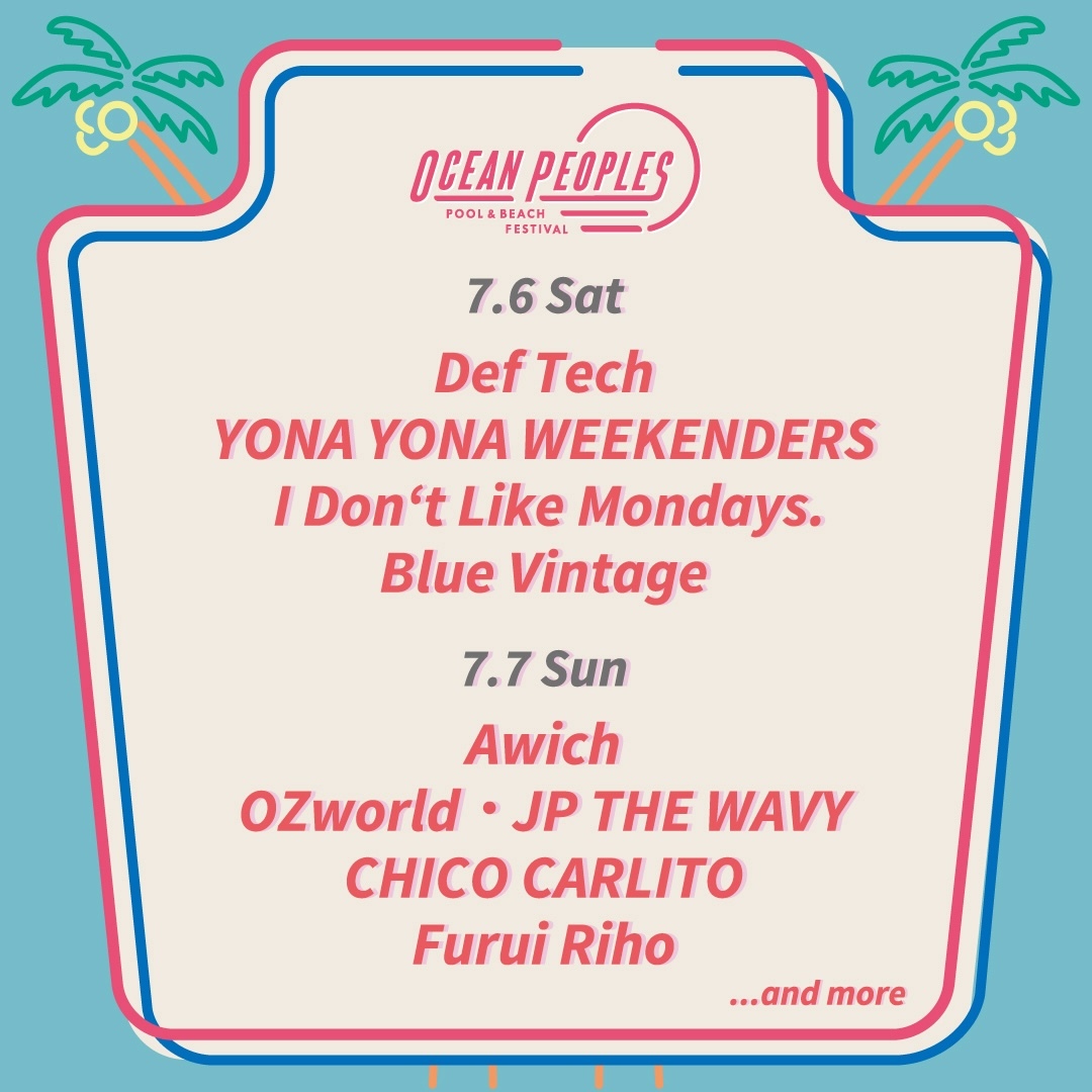 初日・7月6日(土)には、最高のパフォーマンスで会場を盛り上げ、幅広い世代から人気を誇るDef Tech、「ツマミになるグッドミュージック」を奏でる4人組バンド・YONA YONA WEEKENDERS、スタイリッシュなロックサウンドで人気を集めるI Donʻt Like Mondays.、<そこに海が見える音楽>と称される、心地よいながらも心躍らせるサーフミュージックで人気を誇るBlue Vintageの出演が決定。