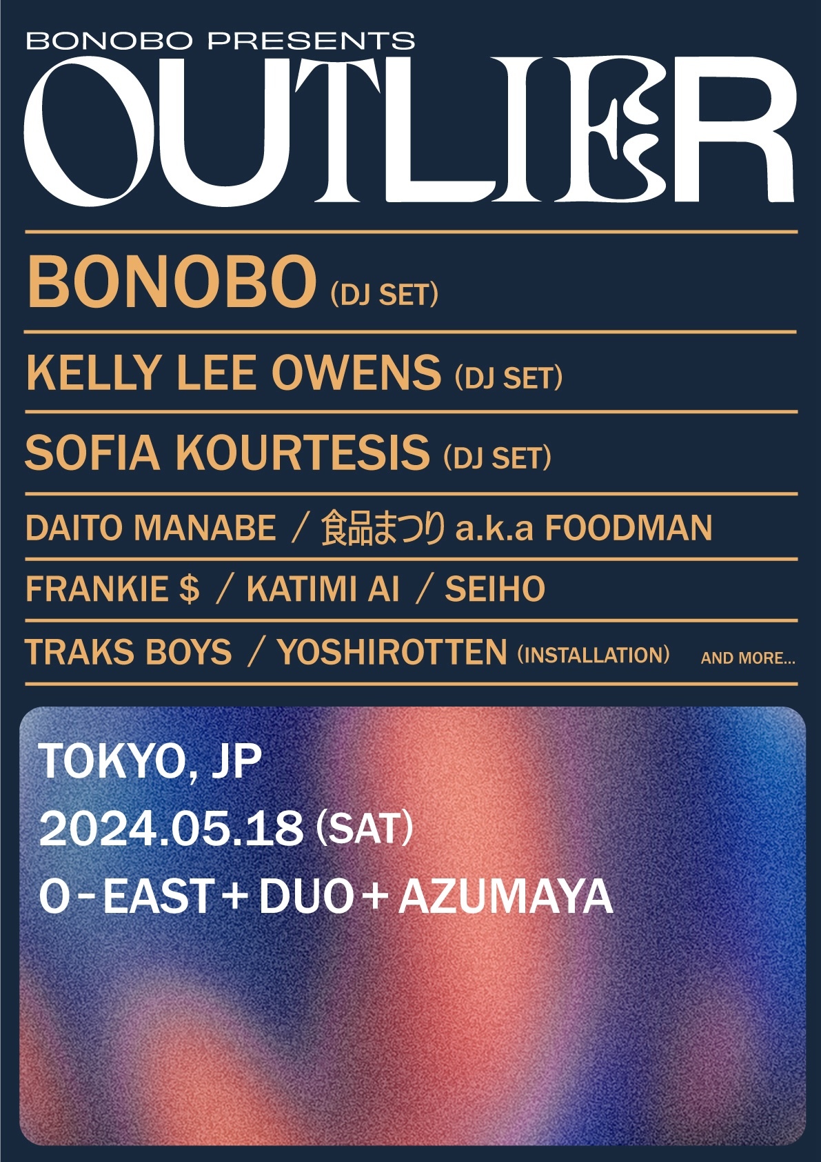 アーティスト/プロデューサーとしてグラミー賞に7度ノミネートされ、バンドセットで大型会場や音楽フェスのオーディエンスを熱狂させる一方、DJとしても官能的かつ情熱的なプレイで、ジャンルや国境を超えて絶大なる人気を獲得しているボノボ。彼が主宰する『OUTLIER』は、クラブシーンでもトップを走る彼が自らキュレーションを手掛け、数多くの先鋭アーティスト達をフィーチャーし、世界各地で開催されているイベント。