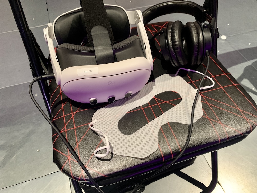 定刻少し前に会場に入りドキドキしながら待っていると、スタッフさんがVRゴーグル+ヘッドフォン、そしてフェイスカバーを手渡してくれた。ゴーグルは心配していたほど重くなく、タイミング悪く首を寝違えて参戦していた筆者でもラクに装着することができた。ポニーテールなど髪の毛をしばってアップスタイルしている場合はちょっと装着しづらそうなので、臨機応変に対応できる髪型がおすすめだ。ちなみにおよそ1時間の体験を楽しんでも、眉毛が落ちなかったことは実証済みなのでご安心あれ。