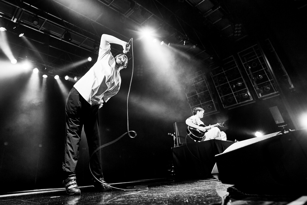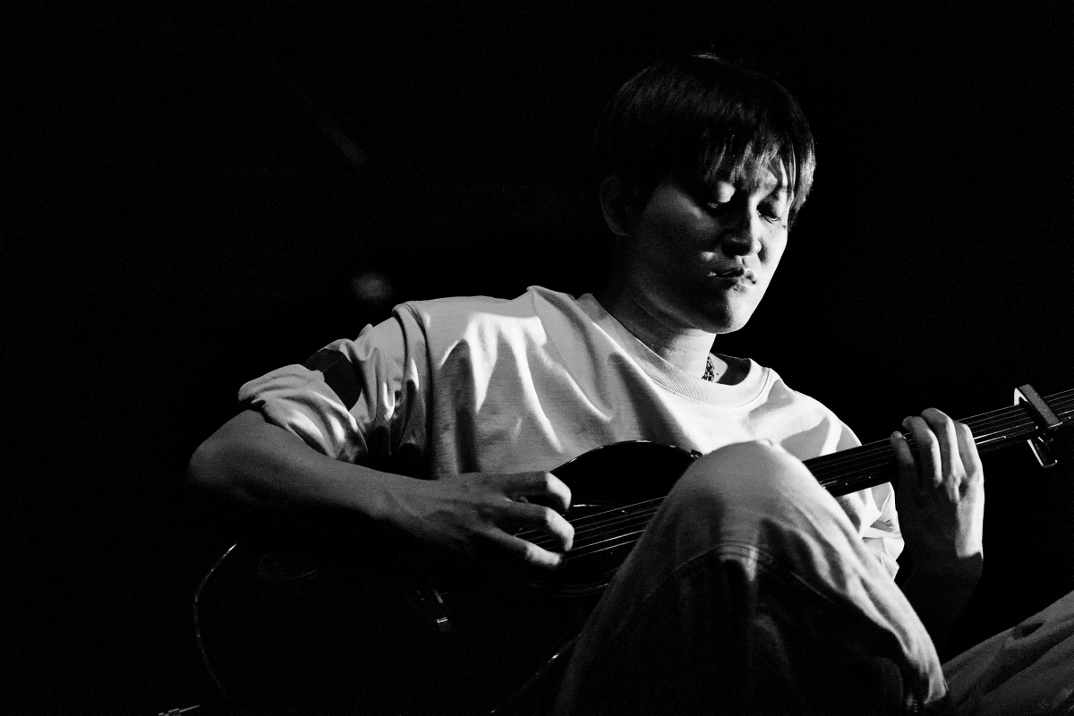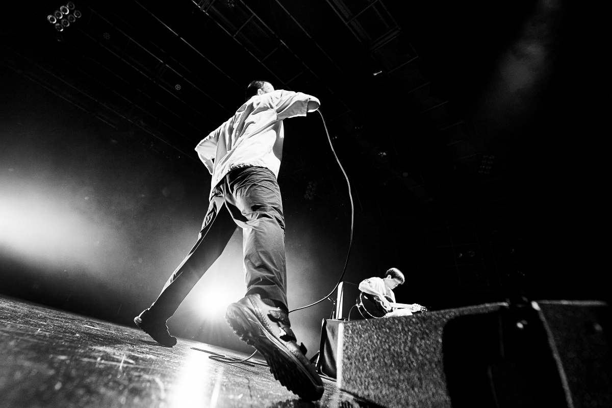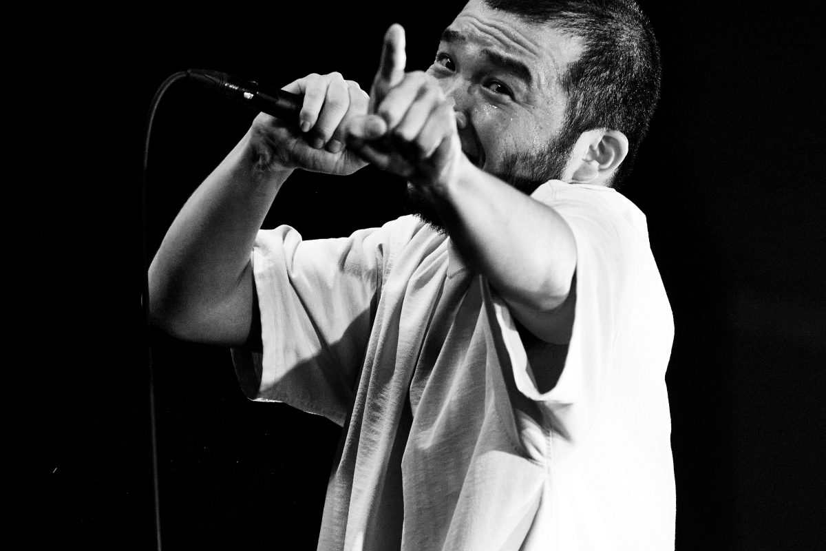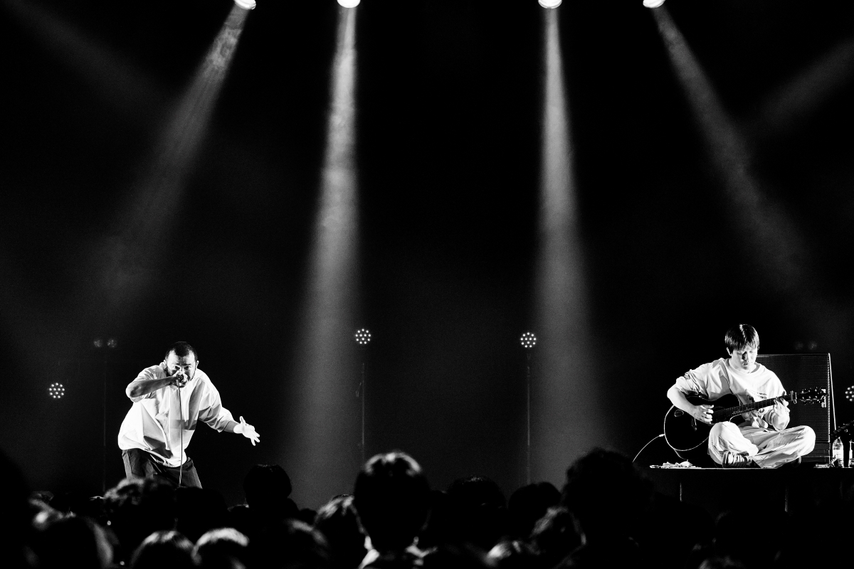 大きな舞台からアンプやドラムセットが取り払われ、だだっ広い漆黒の空間にUK(Gt)の鎮座する小上がりと、ドリンクが置かれた小さな箱馬が一つ。殺風景なそこにふらりと現れた2人は、顔を見合わせ始まりのときをうかがう。白い閃光とUKのつまびく鋭利なギターを背に、ライブの幕開けを飾るヒリヒリするような口上、「チャンプロード」からスタートした今宵の真打は、MOROHAだ。