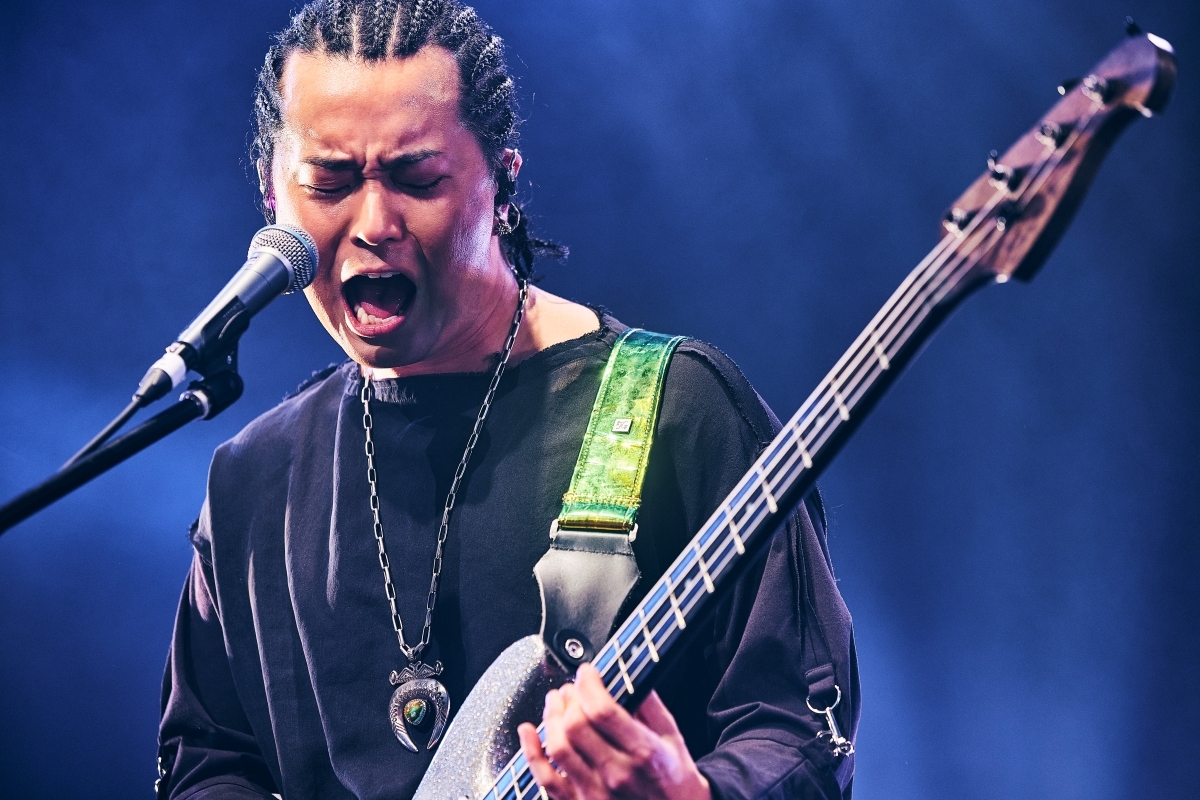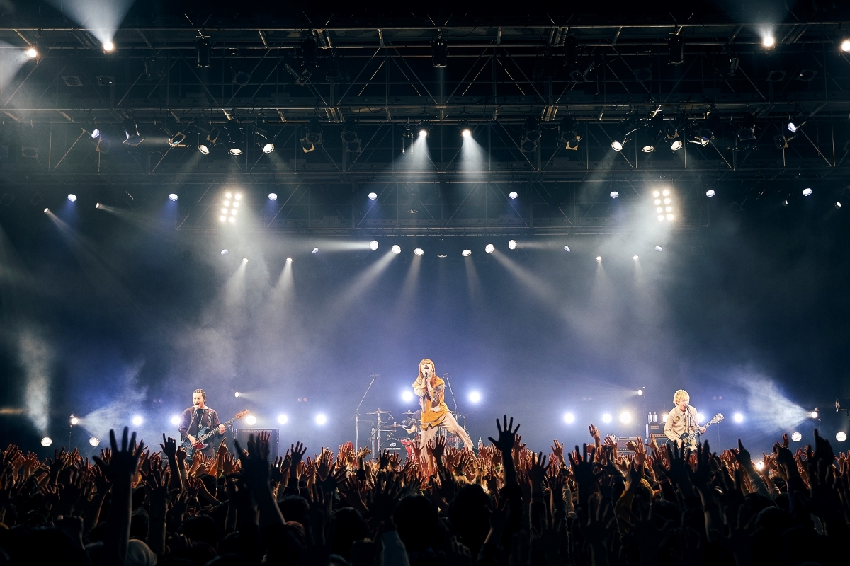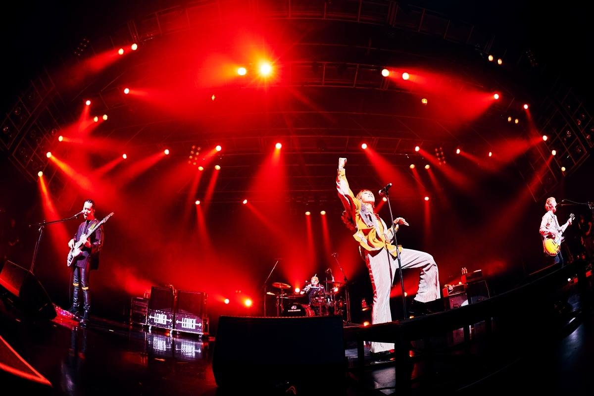 そう言われてアガらないヤツがどこにいる!? 見渡す限りの拳が突き上がった「突破口」に続いて、「決心」でも威風堂々のたたずまいで歌を届け、ライブのボルテージをぐんぐん引き上げていく。その勢いのまま渋谷が「もっとデカい拍手をくれ!」と叫んだアウトロのマキシマムな音像から、藤原“35才”広明(Dr)がビートを刻むミニマムな音量へと急降下した瞬間、次の曲を察した観客から思わず声が上がる。そこに柳沢のアルペジオ、上杉研太(Ba)の重たいベースラインが合流していく先にあったのは「27」。リリースから8年の時を経てより強靭に響くバンドサウンドとメッセージが心臓を貫く。一転、さっきまでの喧騒から、深紅の光に染まった4人に送られる真剣なまなざし。感動の名バラード「儚くない」が、ささくれだった心に優しく優しく染みわたっていく。