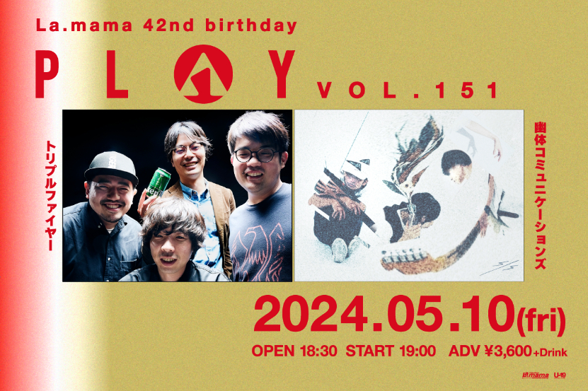 『PLAY』は、渋谷La.mamaが企画するツーマンライブシリーズ。今回の『PLAY VOL.151』では、同日に渋谷La.mamaが設立42周年を迎えることを記念し、トリプルファイヤーと幽体コミュニケーションズがツーマンライブを開催する。