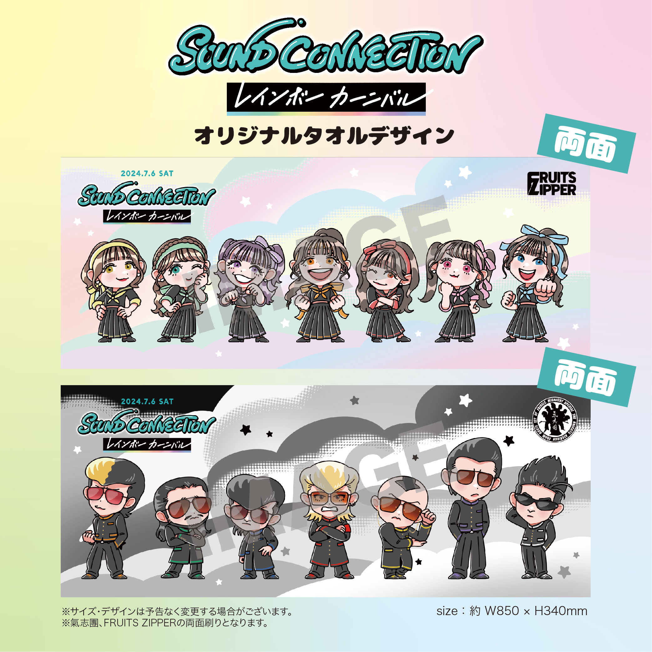 イベントのビジュアルデザインは、イラストレーターのナガミネショウコが手がけた。FRUITS ZIPPERの氣志團へのリスペクトの想いを込め、氣志團風の衣装をまとった特別なイラストとなっている。イラストがデザインされた、タオル付きチケット(数量限定)も発売されるので要チェックだ。