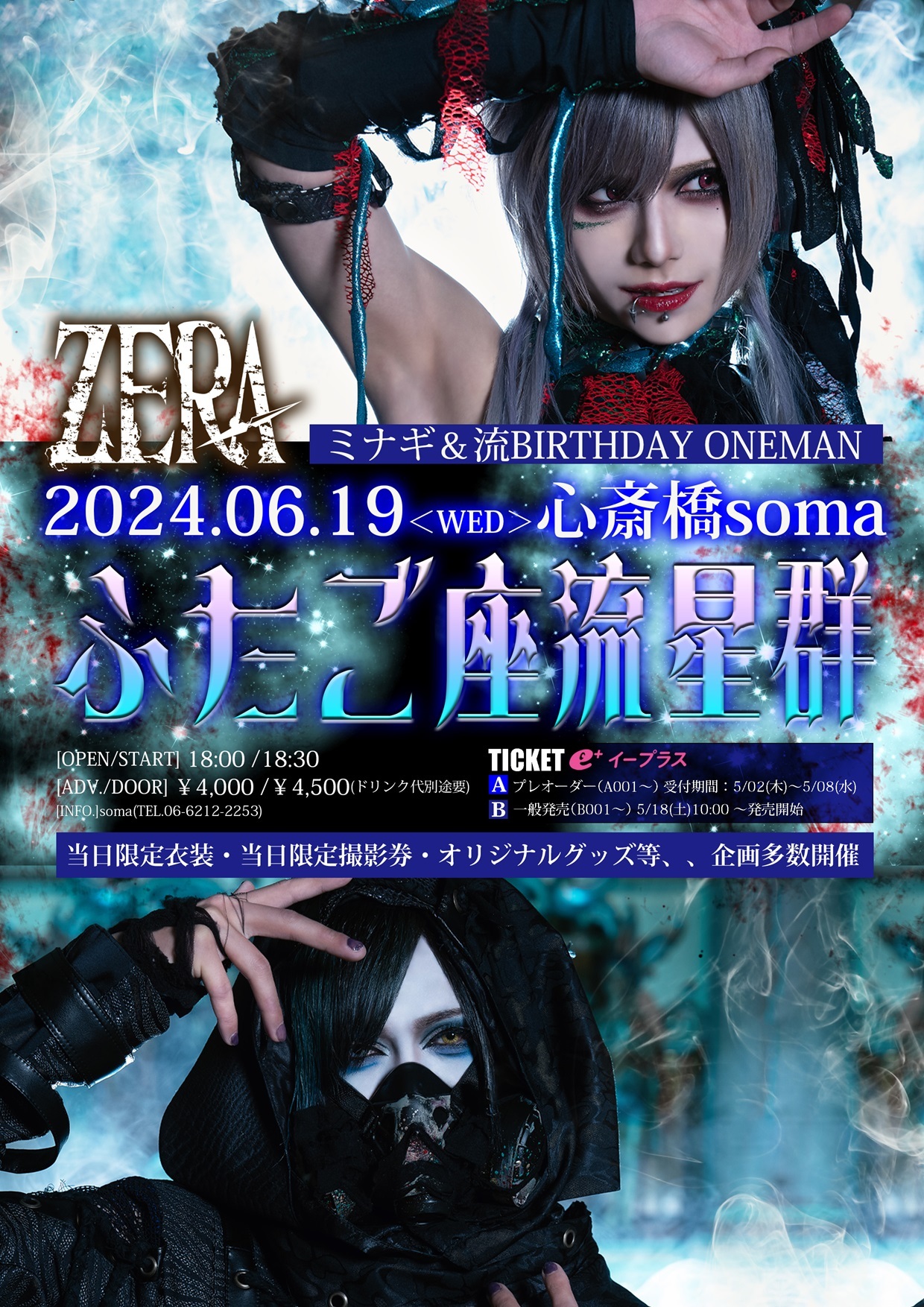 現在、シングル「Octavius」リリースし、ワンマンツアーを敢行中のゼラ。6月19日(水)大阪・心斎橋somaにて、ミナギ(Gt)&流(Ba)の誕生日を祝して、ダブルバースデーワンマン『ふたご座流星群』を開催することを発表した。