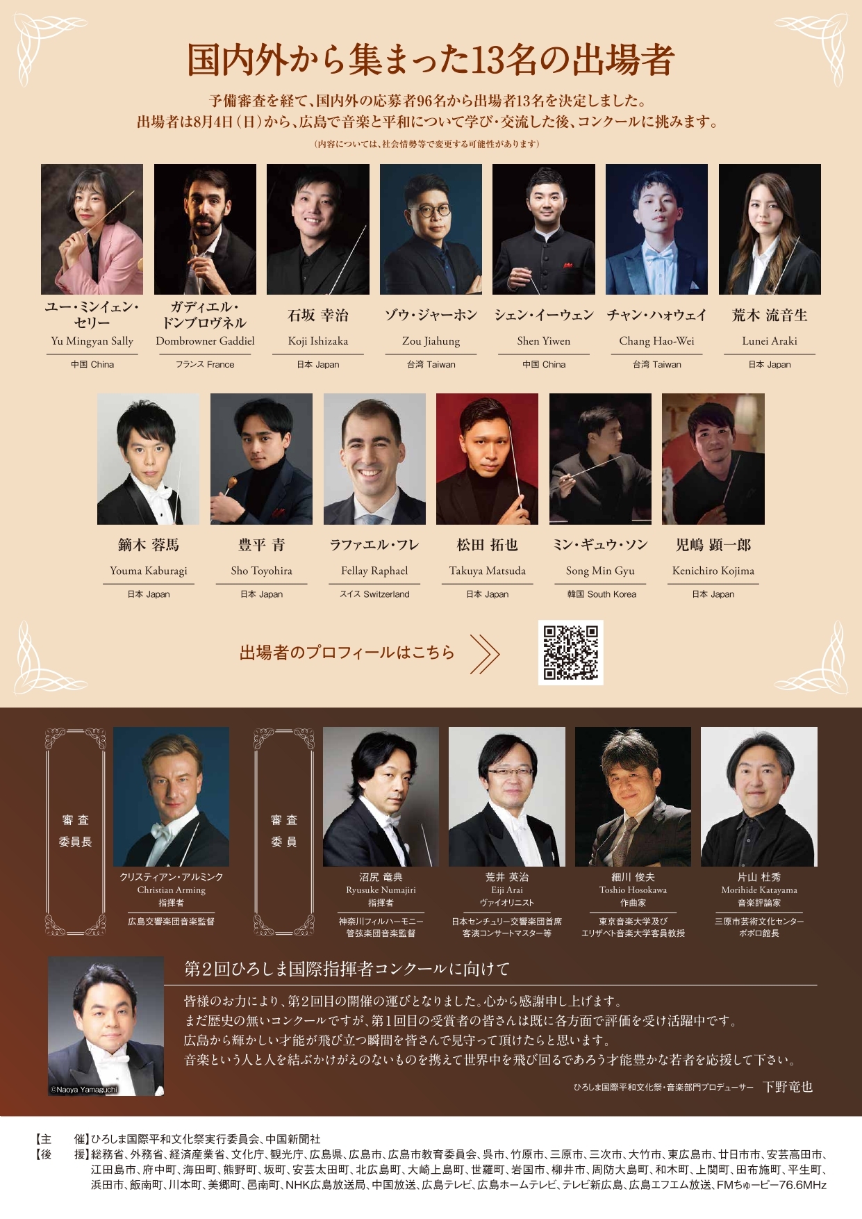 映像による予備審査を経て、国内外の応募者96名から13名の出場者が選び抜かれた。出場者は8月4日(日)から広島で平和への取組を学び、『ひろしま国際平和文化祭』下野竜也 音楽プロデューサーによるマスタークラスを受講した後、一次予選、二次予選、本選に挑む。