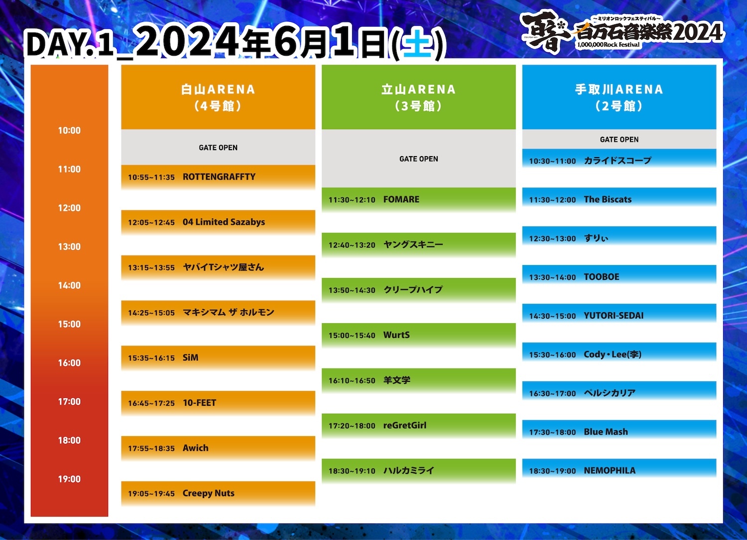 『百万石音楽祭2024〜ミリオンロックフェスティバル〜』DAY1タイムテーブル