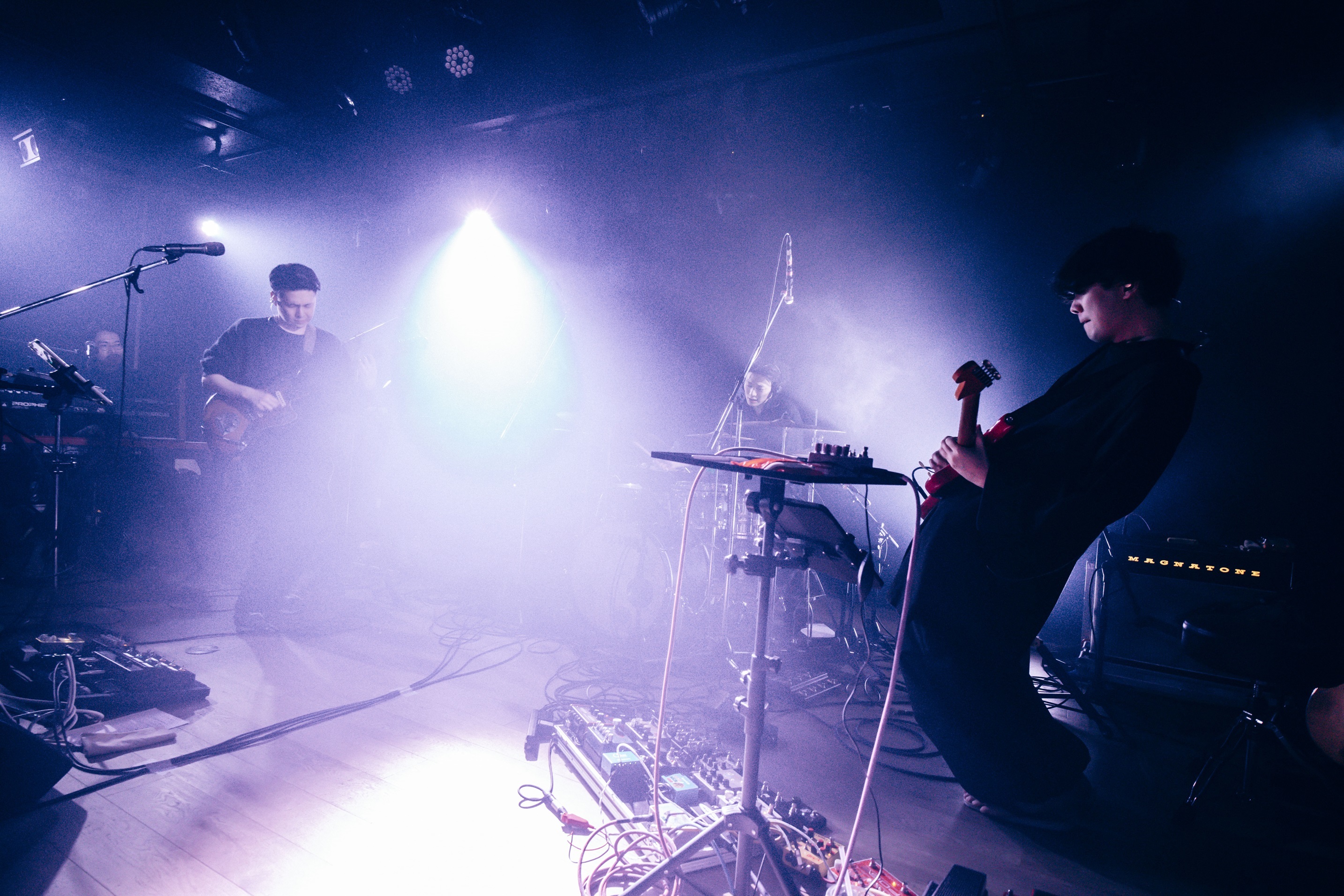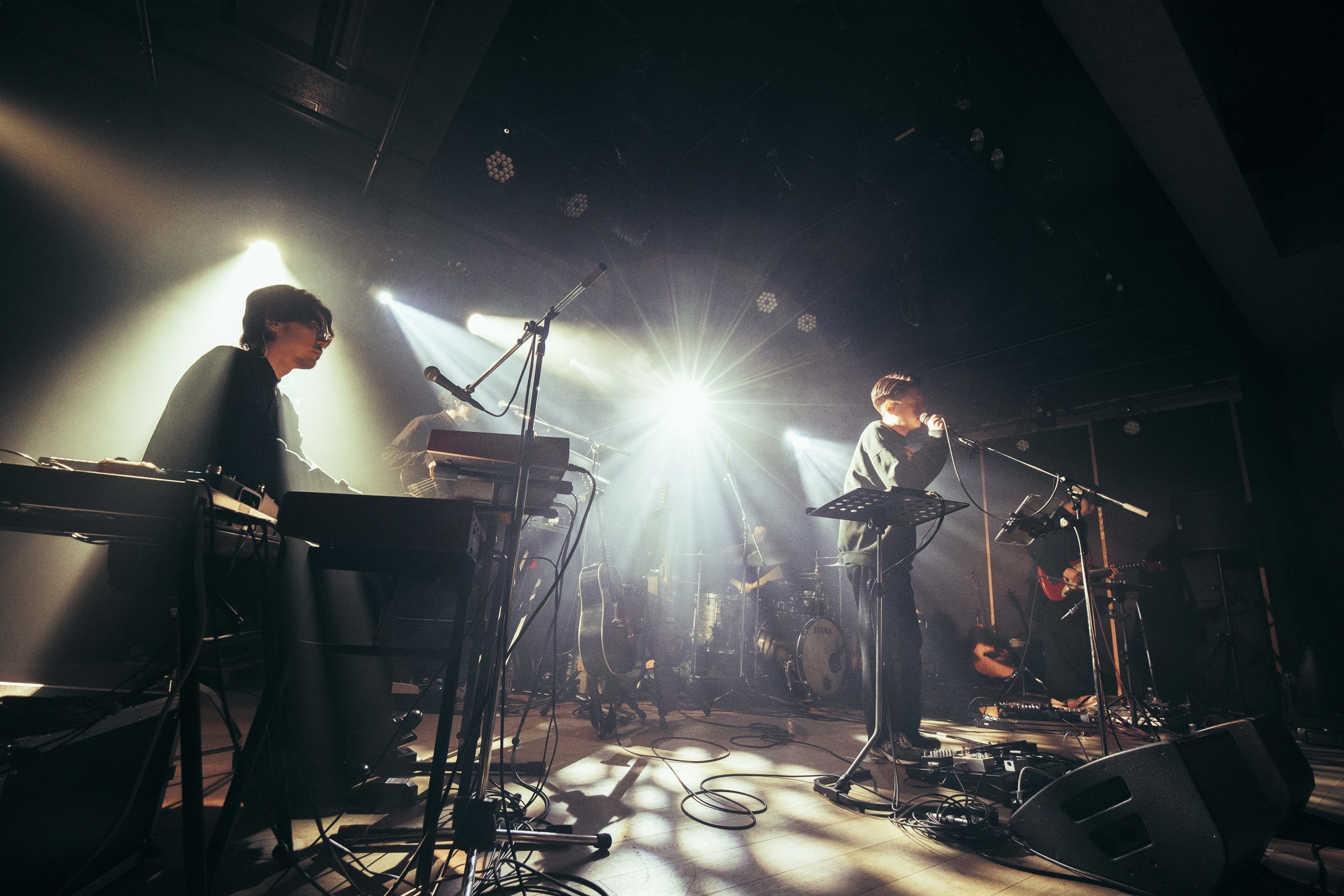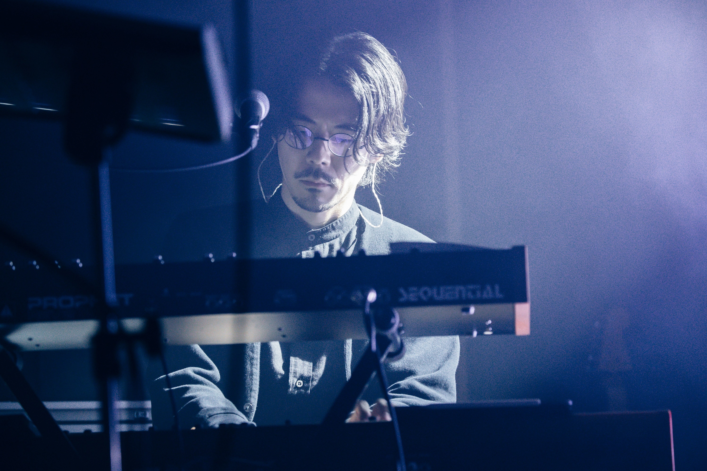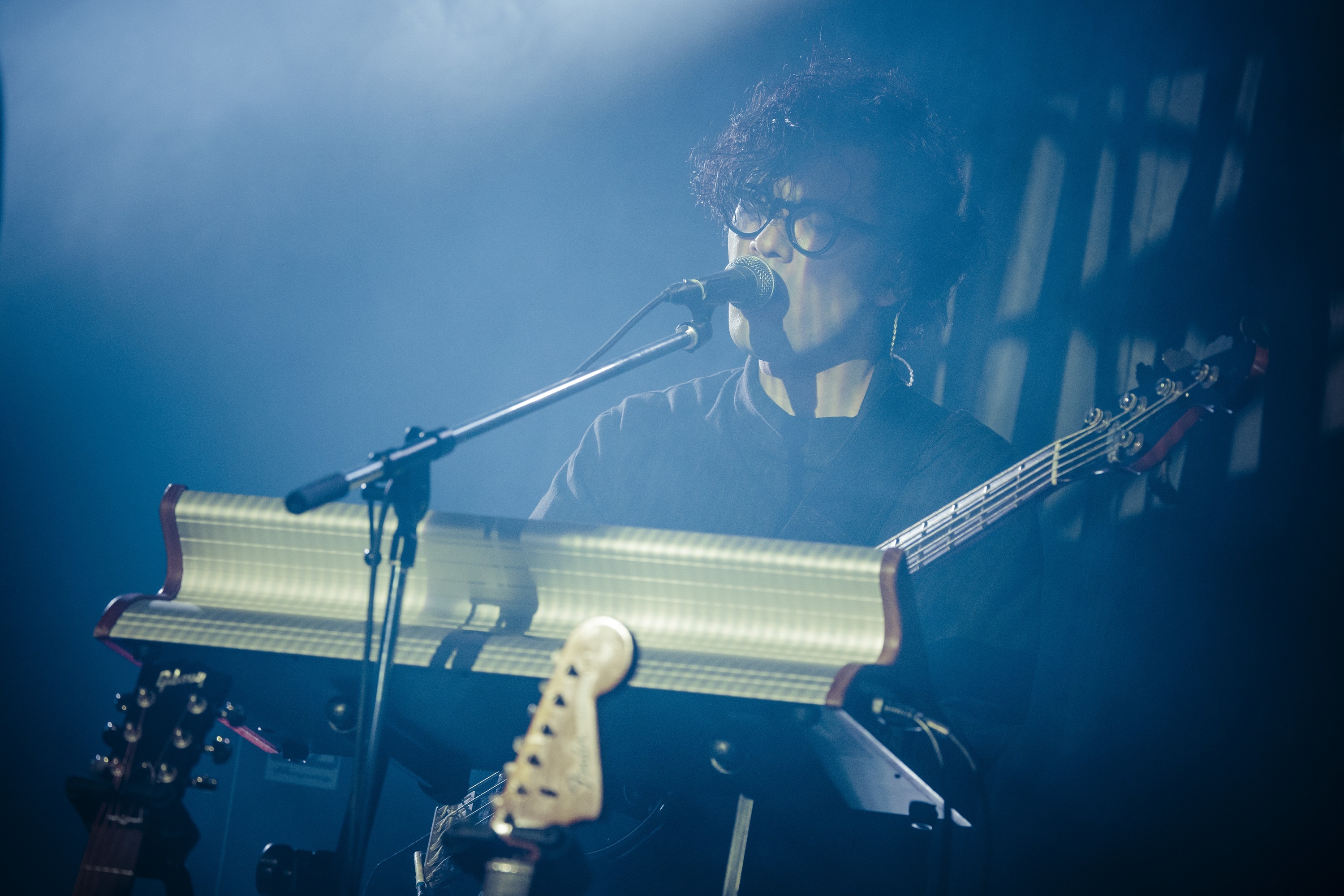 ライブの立ち上がりは静かなものだった。定刻を少し過ぎ、スッと暗転。オープニングSEは無く、現れたメンバーに送られる拍手が場内に満ちていく。開演前から流れていたまばらなリズムを刻むクリック音に、鍵盤やグロッケンの音色を重ねて形作られたアンビエントな音像が次第に力強さを増していき、「Distances」へ。濃いめのスモークに覆われたステージからミゾベリョウ(Vo)がファルセット混じりに歌い上げる切々としたボーカルが響く。じっくりじっくりとグルーヴを練り上げながら、次第に立体的/肉体的になっていく音は終盤になるとダイナミックなバンドサウンドへと変貌。「自由なリズムで、今日は楽しんでください」と一言告げて繋いだ「幸せ?」は、拍子はトリッキーだしShaikh Sofian(Ba)の奏でるベースラインもアブストラクトなものだが、ノリ自体はダンサブルでキャッチーでさえある。