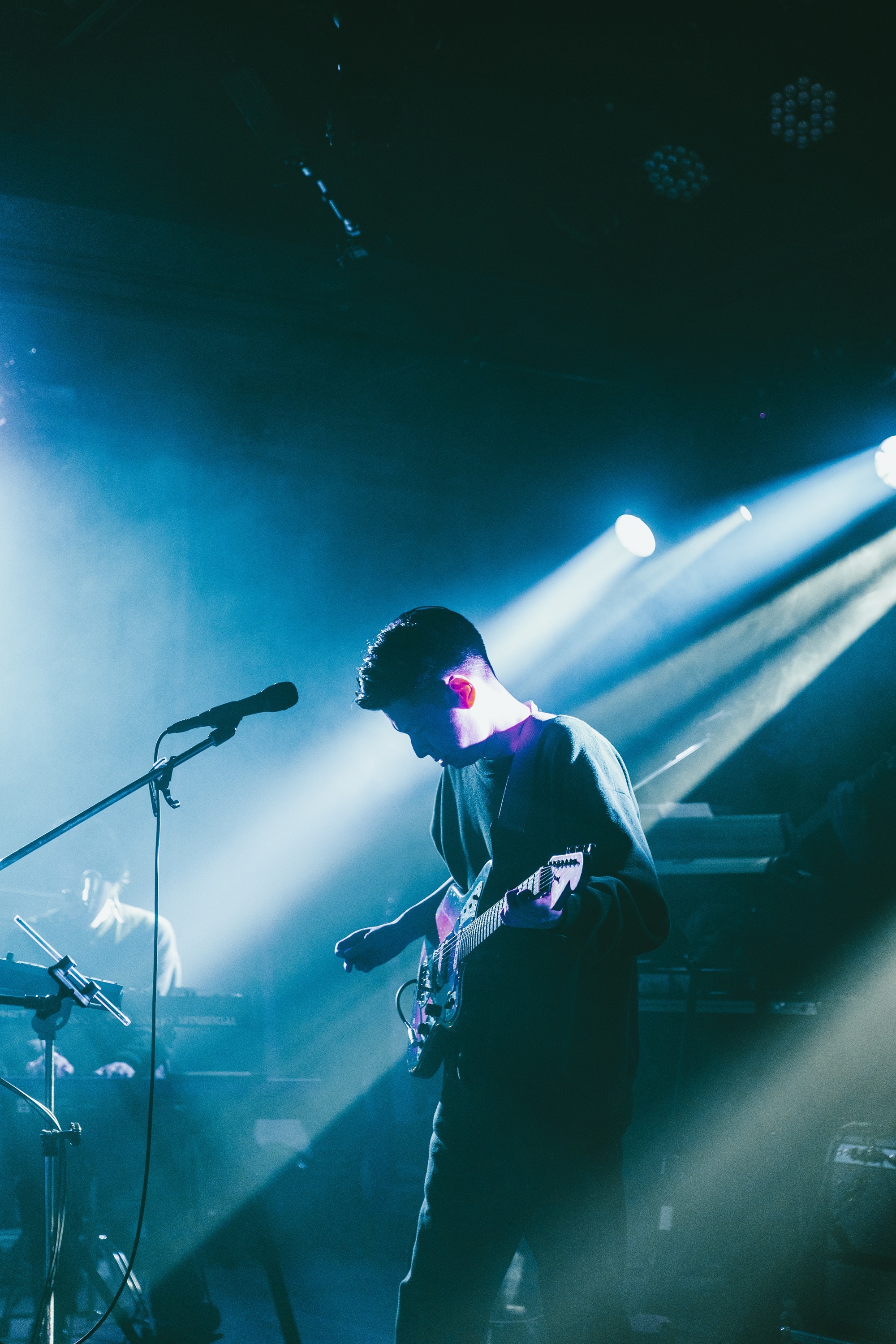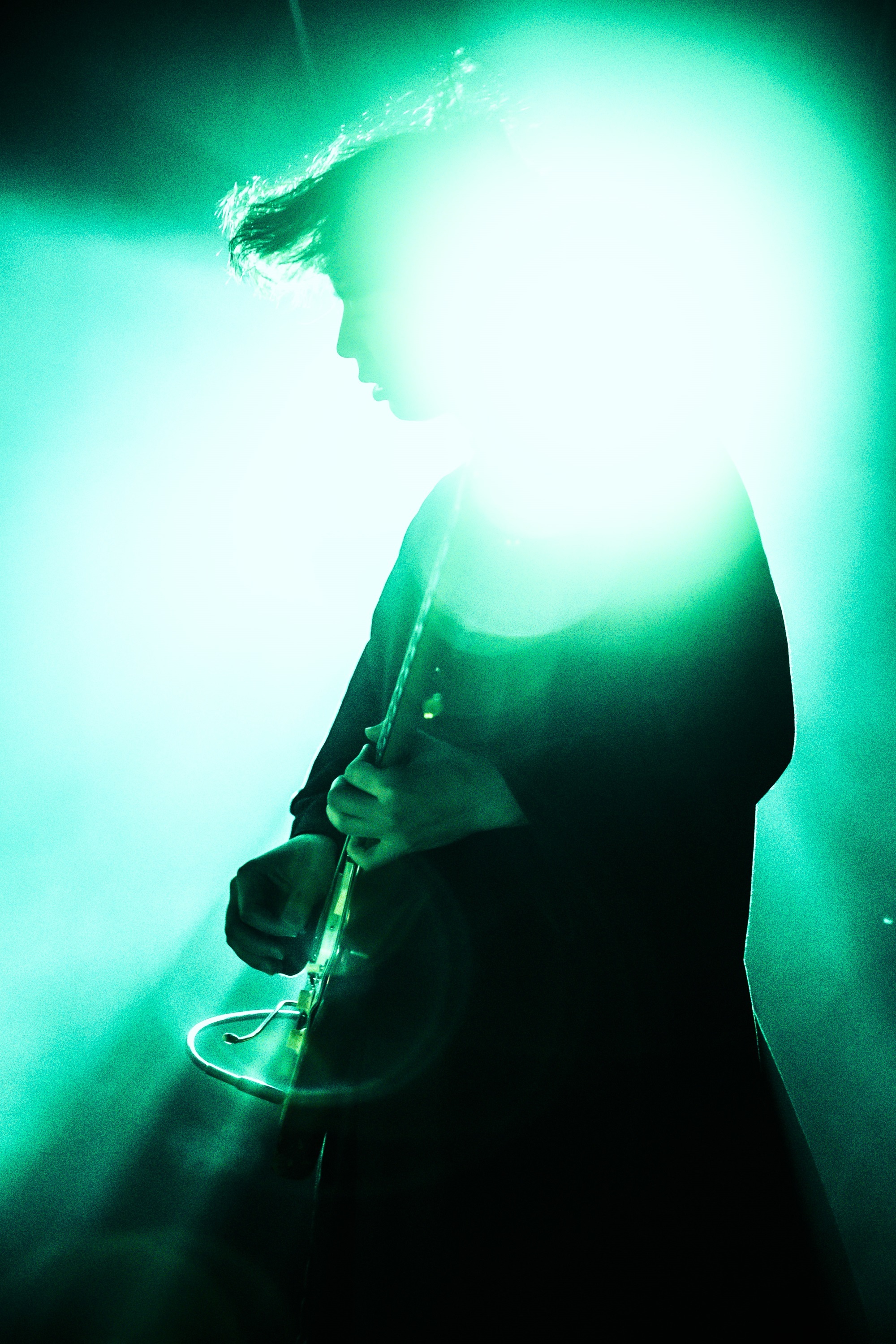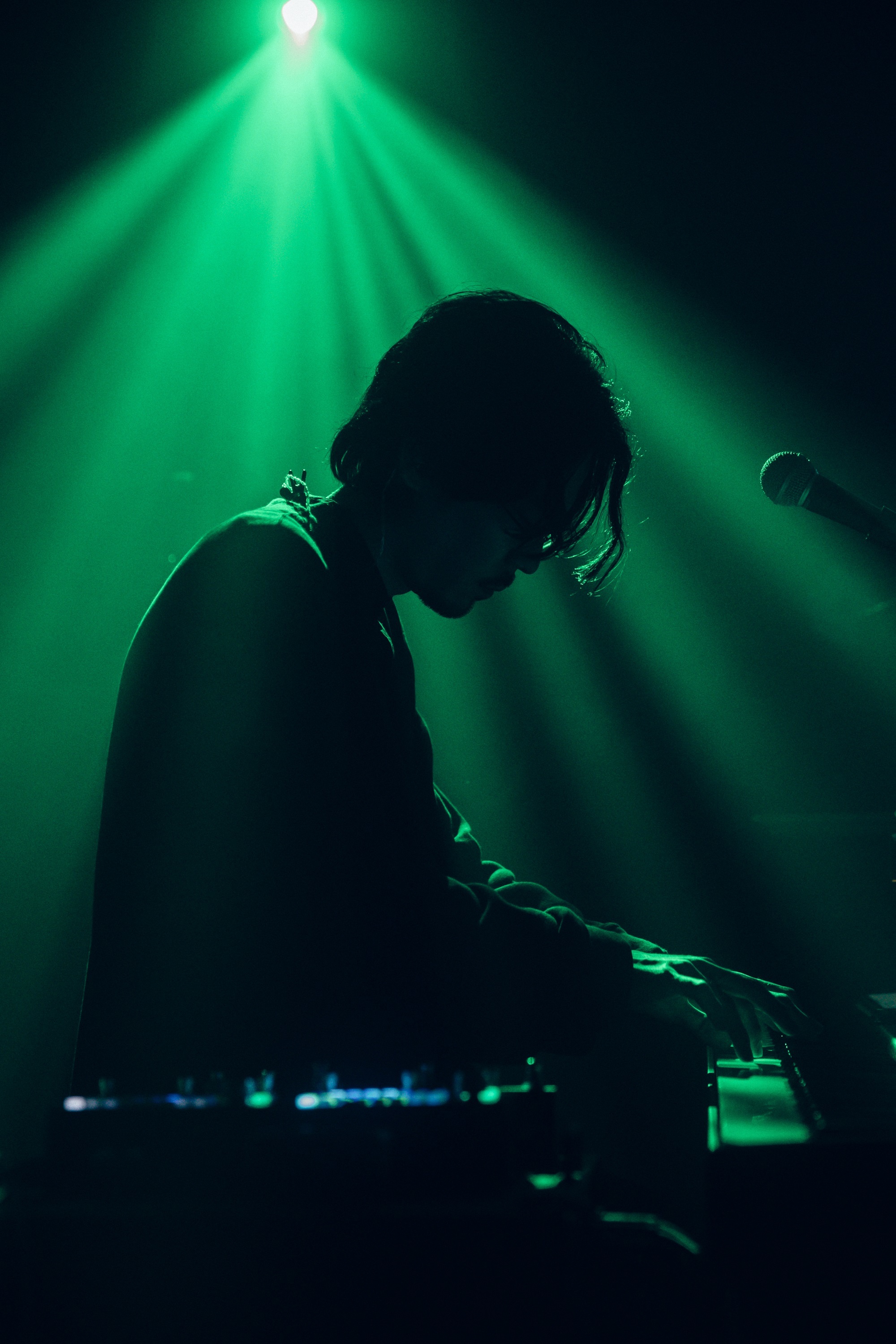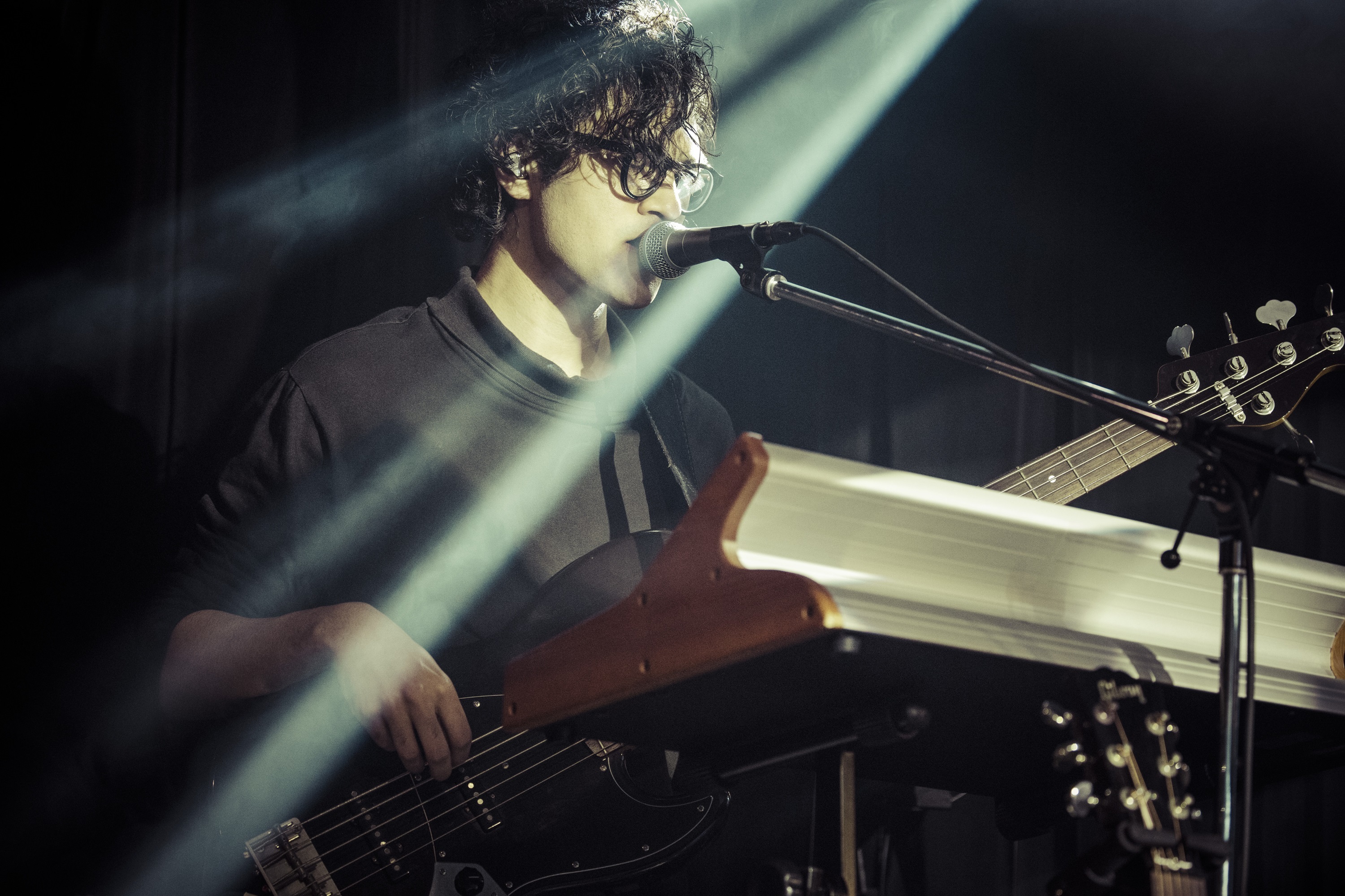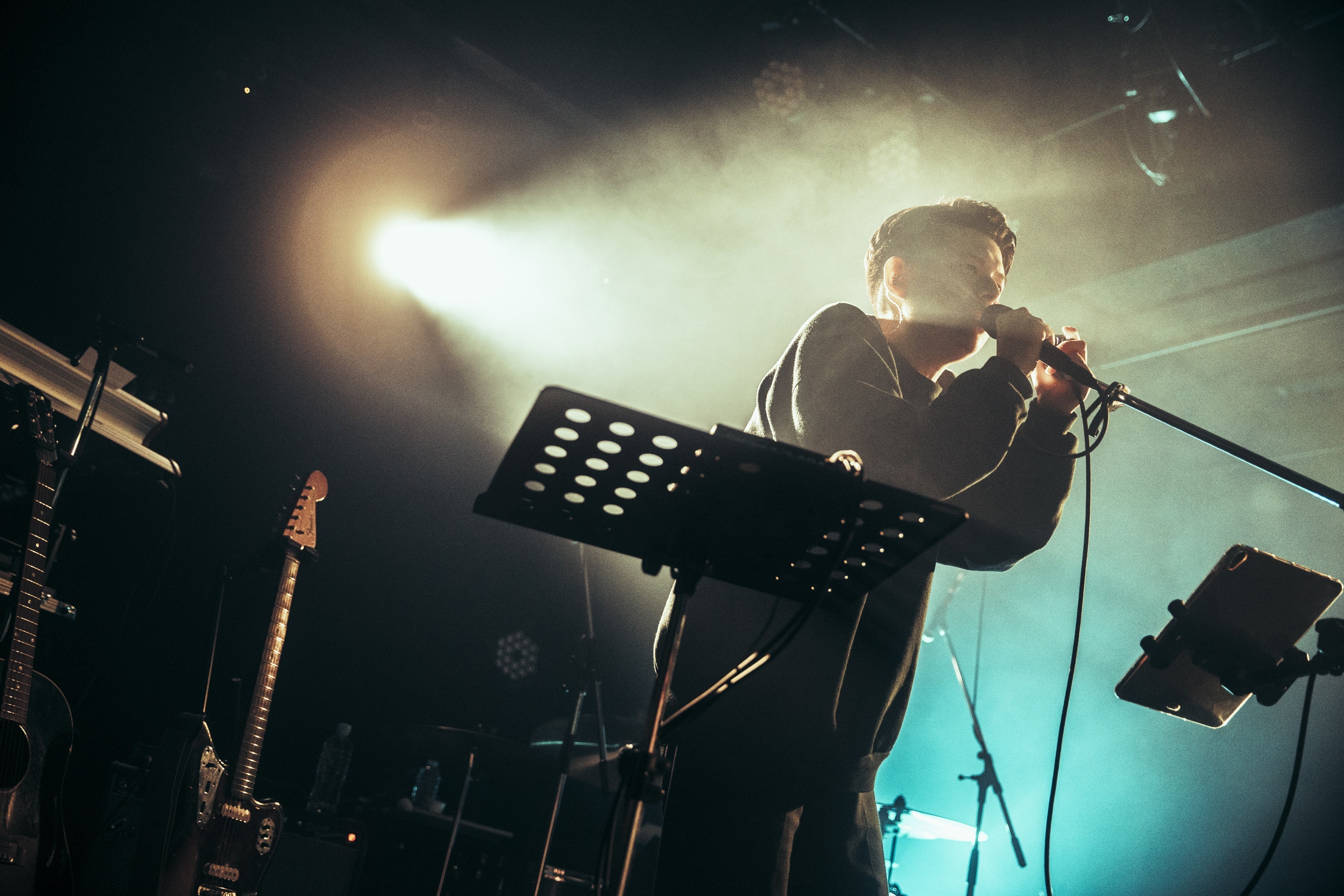 ライブの立ち上がりは静かなものだった。定刻を少し過ぎ、スッと暗転。オープニングSEは無く、現れたメンバーに送られる拍手が場内に満ちていく。開演前から流れていたまばらなリズムを刻むクリック音に、鍵盤やグロッケンの音色を重ねて形作られたアンビエントな音像が次第に力強さを増していき、「Distances」へ。濃いめのスモークに覆われたステージからミゾベリョウ(Vo)がファルセット混じりに歌い上げる切々としたボーカルが響く。じっくりじっくりとグルーヴを練り上げながら、次第に立体的/肉体的になっていく音は終盤になるとダイナミックなバンドサウンドへと変貌。「自由なリズムで、今日は楽しんでください」と一言告げて繋いだ「幸せ?」は、拍子はトリッキーだしShaikh Sofian(Ba)の奏でるベースラインもアブストラクトなものだが、ノリ自体はダンサブルでキャッチーでさえある。