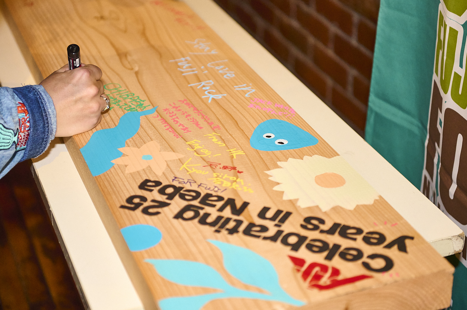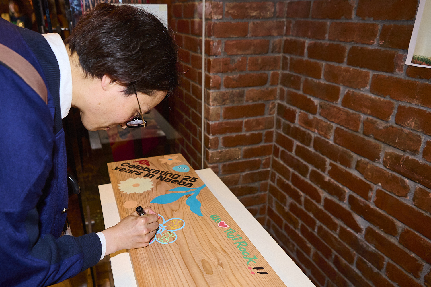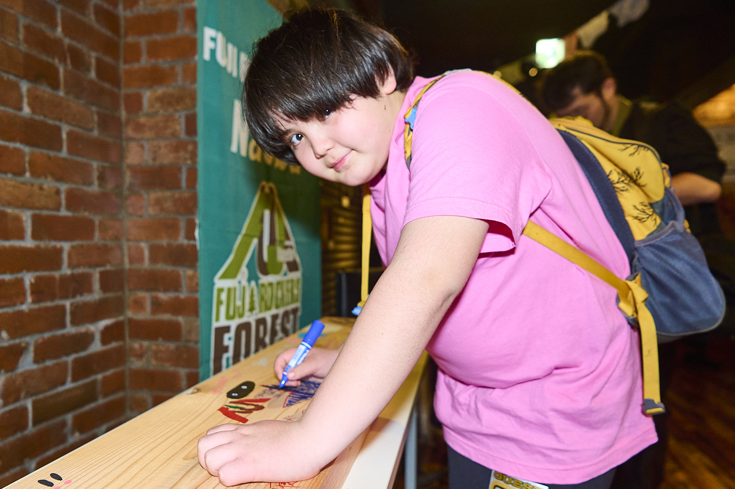 『フジロック』会場内にある「ボードウォーク」用の板に寄せ書きができるコーナーもあった。ボードウォークとは木の板張りで作られた遊歩道(木道)のことで、日本では尾瀬が有名だが『フジロック』場内にも約2kmにわたって存在する。『フジロック』ではステージ間をつなぐ動脈として、歩行者、車いすでの通行も可能としているが、一方では人々が湿原に踏み入れないようにすることで、現地に生息する植物などの自然を保護する役割も担っている。そんな『フジロック』のボードウォークは地元の方々とボランティアによって長年かけて作られ、毎年修繕を重ね守られてきた。この日、来場者が色とりどりのペンを手に『フジロック』への思いやイラストなどを描いた板は、次回5月18日に開催されるボードウォークキャンプで取り付けられるとのこと。