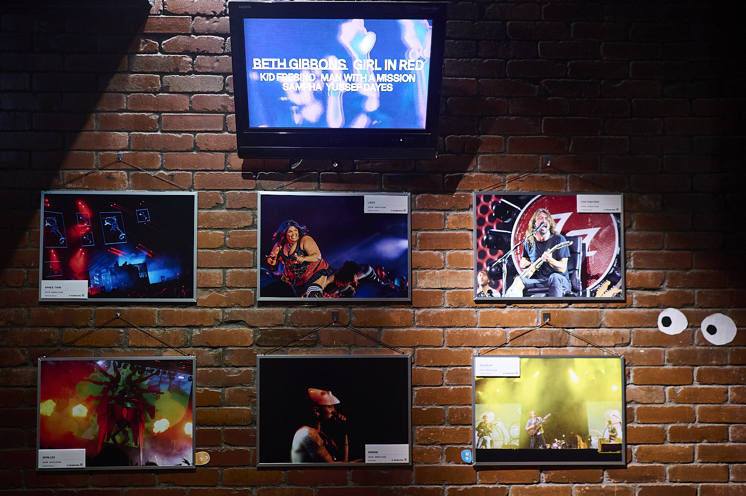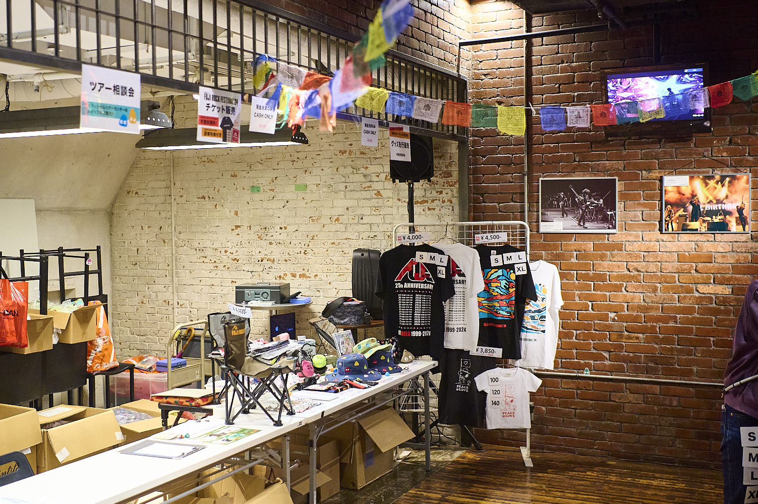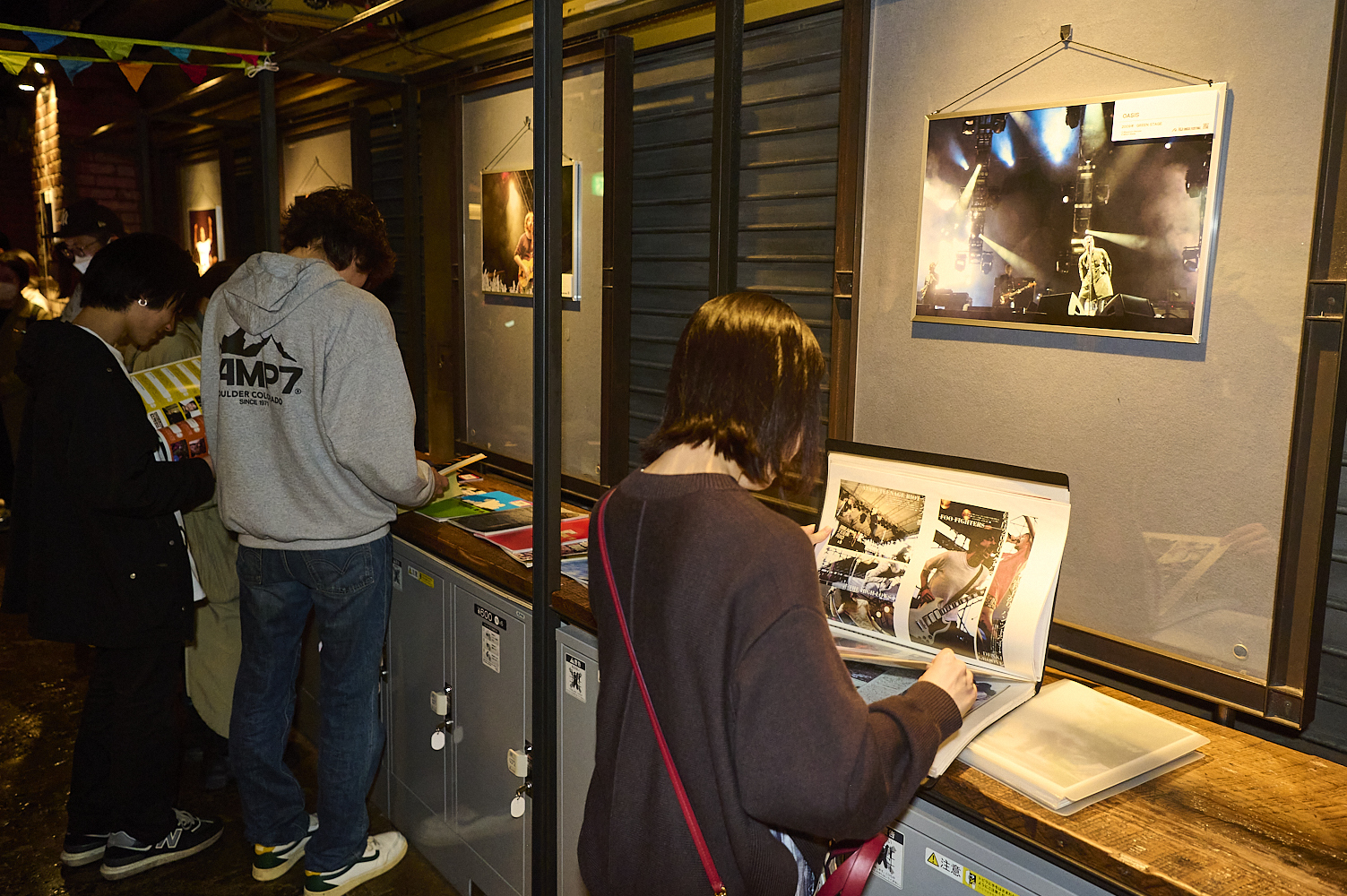 まず来場者を出迎えたのは、『フジロック』が誇る貴重な展示物。場内の壁にはレッド・ホット・チリ・ペッパーズ(Red Hot Chili Peppers)、フー・ファイターズ(Foo Fighters)、レイジ・アゲインスト・ザ・マシーン(Rage Against the Machine)、エミネム(Eminem)、オアシス(Oasis)、シーア(Sia)、忌野清志郎などの錚々たる出演アーティストの名シーンが収められた写真パネルがずらりと飾られていた。さらに開催初年1997年から2023年までの歴代パンフレット(原本)や、国内のみならず海外の新聞や雑誌による『フジロック』関連記事が大量にスクラップされたブックファイルが置かれていて、自由に手に取って見ることができた。そして場内の至るところ(果てはトイレの中までも!)に出現していた『フジロック』のマスコット的キャラクター「ゴンちゃん」もまた、都内のど真ん中にあるライブハウスに居ながらにして苗場感を呼び覚ますというキックオフイベントの主旨に大きく貢献していた。