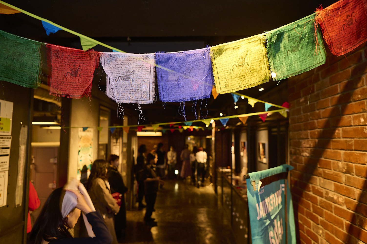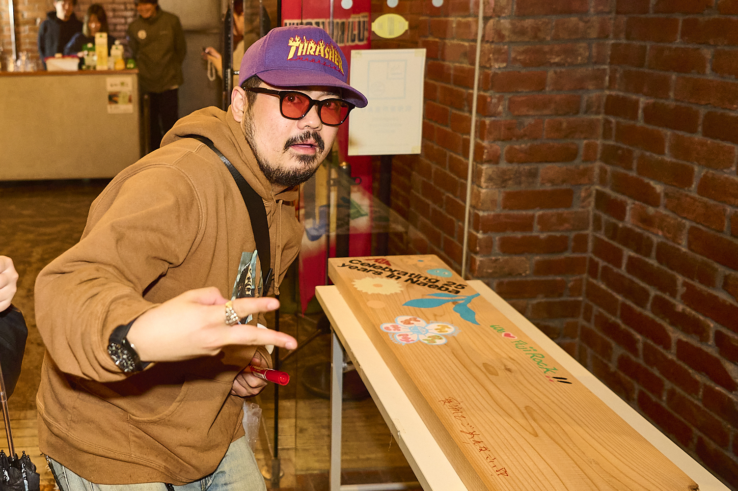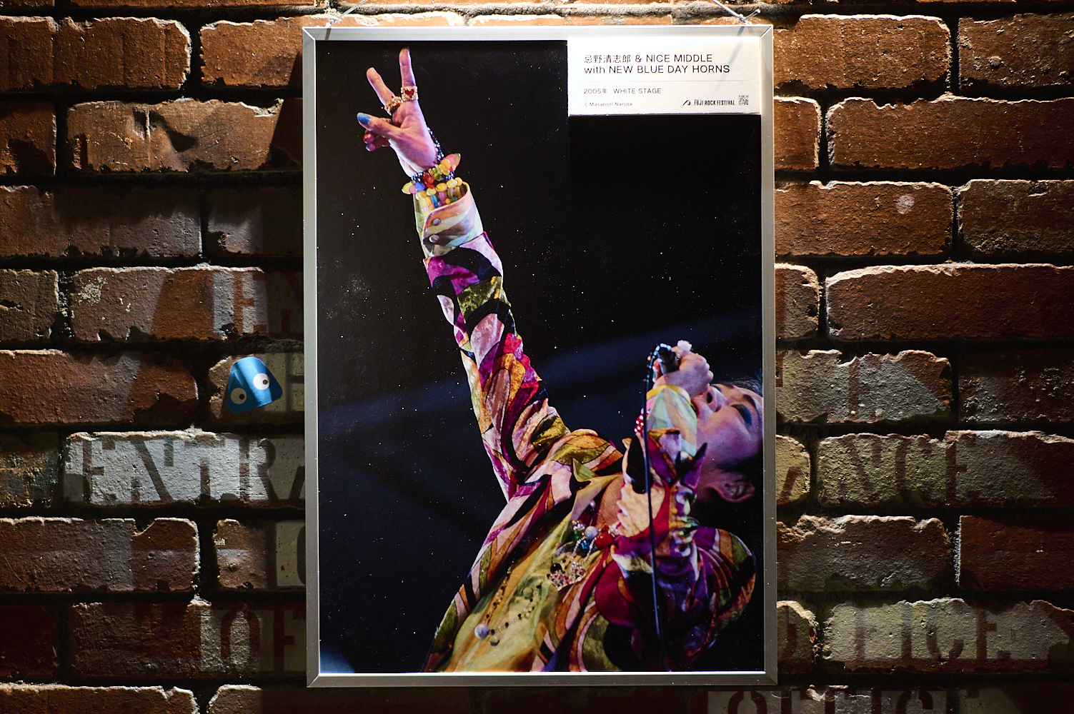 まず来場者を出迎えたのは、『フジロック』が誇る貴重な展示物。場内の壁にはレッド・ホット・チリ・ペッパーズ(Red Hot Chili Peppers)、フー・ファイターズ(Foo Fighters)、レイジ・アゲインスト・ザ・マシーン(Rage Against the Machine)、エミネム(Eminem)、オアシス(Oasis)、シーア(Sia)、忌野清志郎などの錚々たる出演アーティストの名シーンが収められた写真パネルがずらりと飾られていた。さらに開催初年1997年から2023年までの歴代パンフレット(原本)や、国内のみならず海外の新聞や雑誌による『フジロック』関連記事が大量にスクラップされたブックファイルが置かれていて、自由に手に取って見ることができた。そして場内の至るところ(果てはトイレの中までも!)に出現していた『フジロック』のマスコット的キャラクター「ゴンちゃん」もまた、都内のど真ん中にあるライブハウスに居ながらにして苗場感を呼び覚ますというキックオフイベントの主旨に大きく貢献していた。
