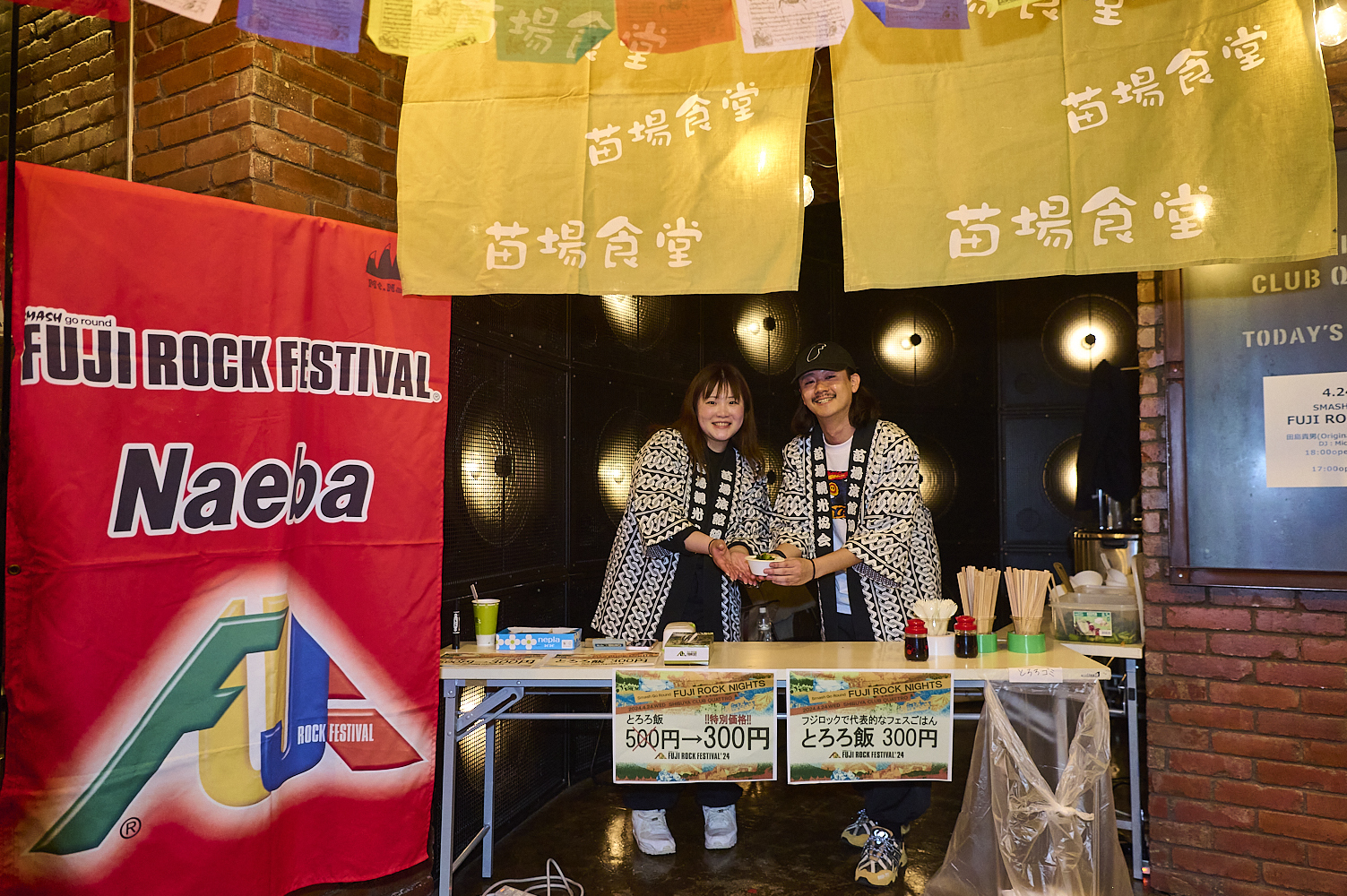 特別販売されていたのは『フジロック』が開催される苗場のスペシャルフード、『フジロック』の代表的なフェスごはんである「とろろ飯」。『フジロック』会場ではフードやドリンクを楽しむエリア「オアシス」にある苗場食堂で購入することができるのだが、数百もの店が軒を連ね、国内外のフードを幅広く楽しめる『フジロック』において、とろろ飯以外にも豊富なメニューをリーズナブルな価格で提供する苗場食堂は大人気店だ。このイベントのために、苗場食堂を運営している地元の方々が苗場から出張されての提供という徹底ぶりは、『フジロック』と開催地との関わりの深さ故だろうか。
