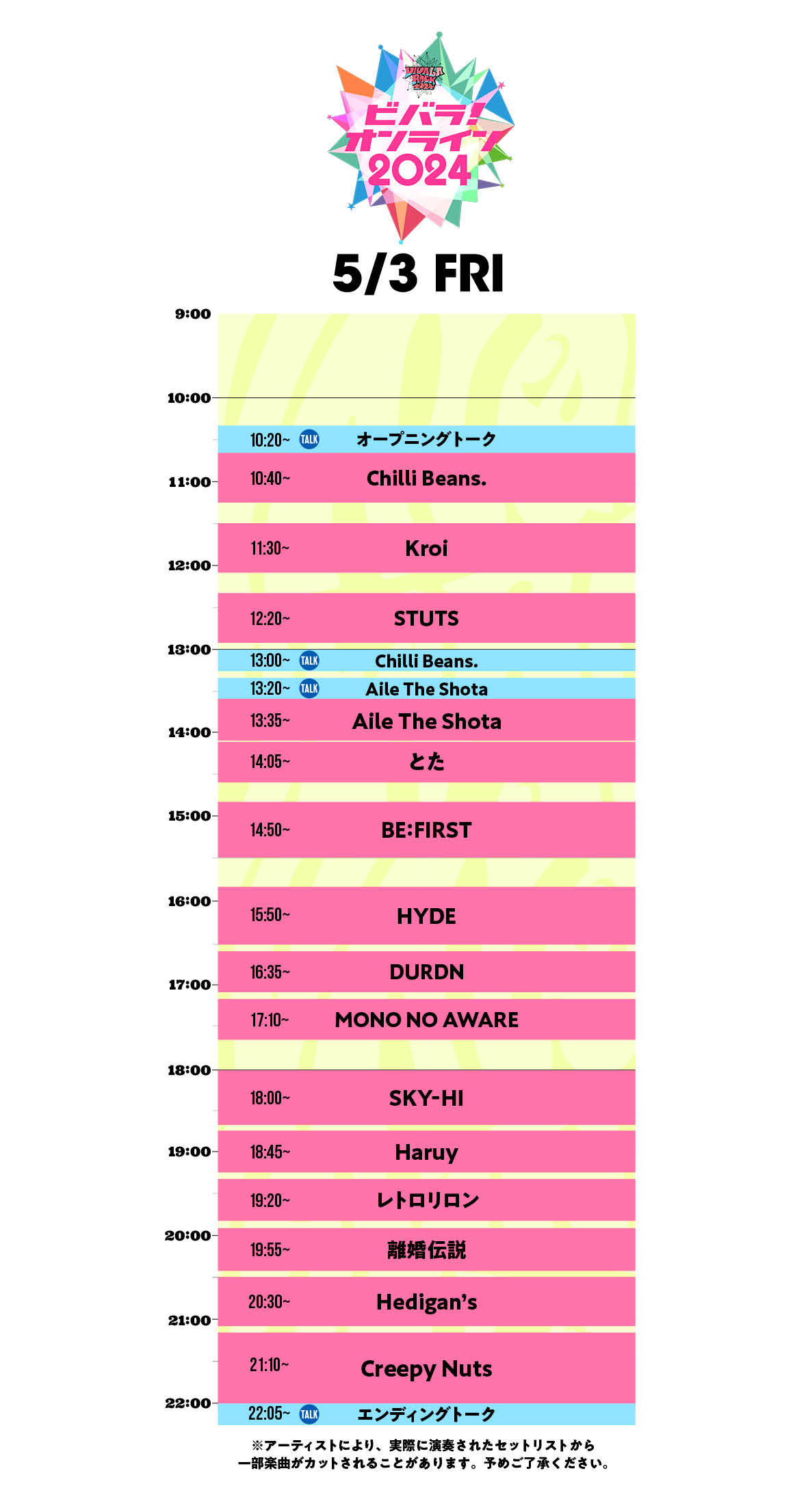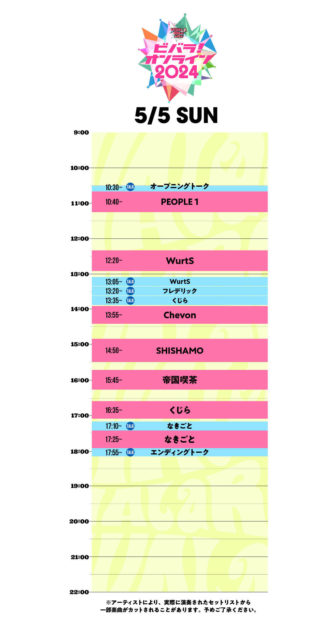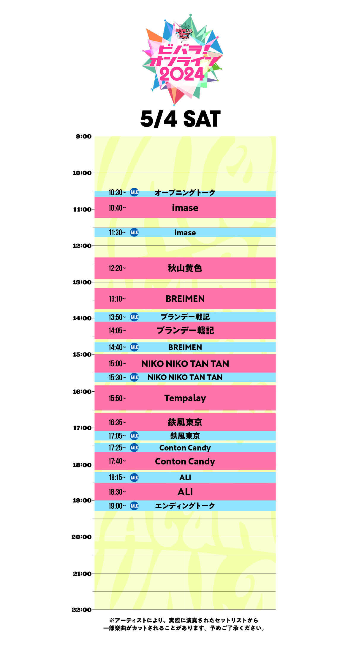 5月4日(土・祝)には、ALI、imase、Conton Candy、鉄⾵東京、NIKO NIKO TAN TAN、ブランデー戦記、BREIMENがトークゲストとして登場する。