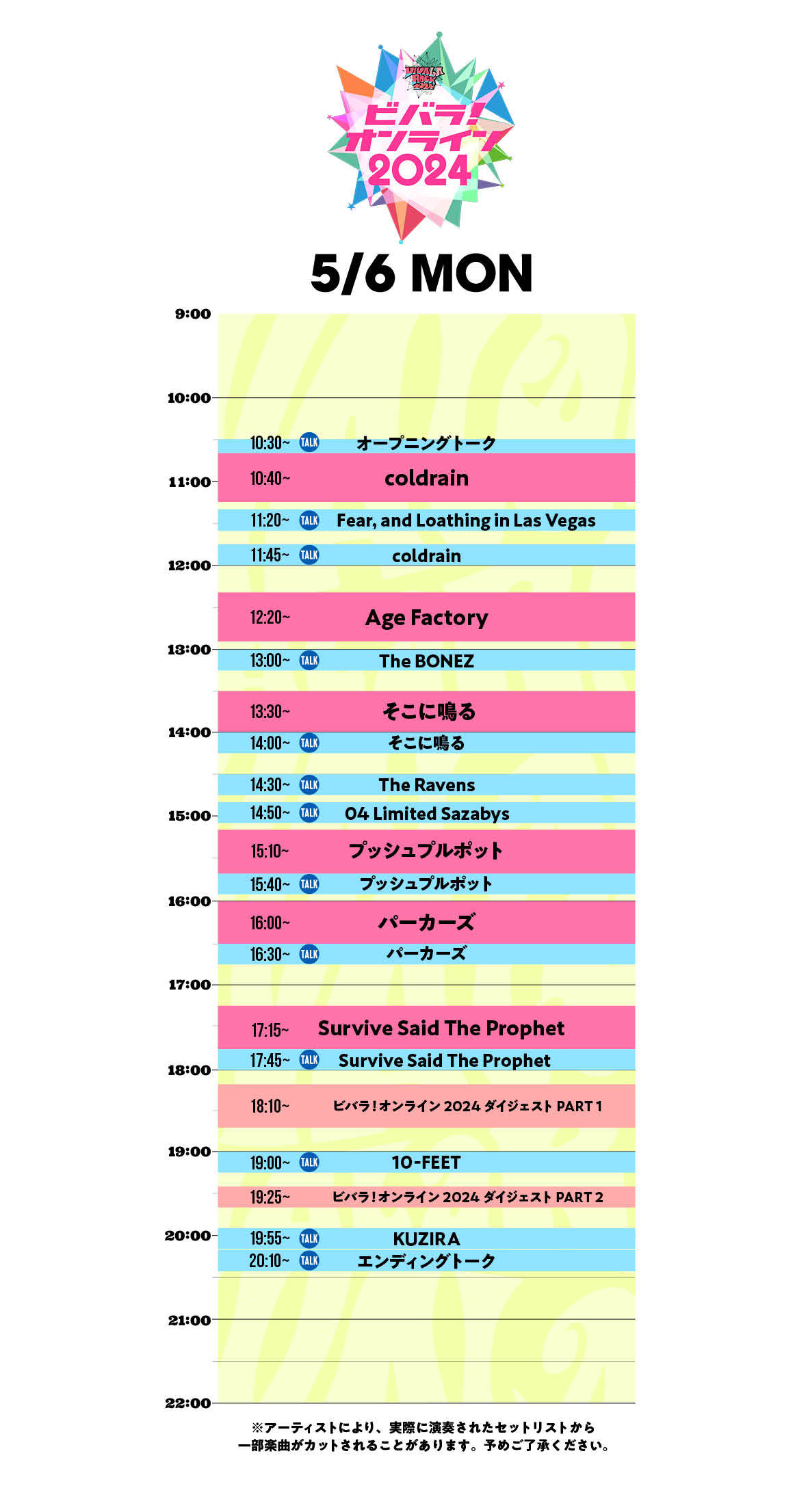 5月6 日(月・休)は、そこに鳴るの追加出演がアナウンス。トークゲストとしてKUZIRA、coldrain、Survive Said The Prophet、そこに鳴る、10-FEET、パーカーズ、Fear, and Loathing in Las Vegas、04 Limited Sazabys、プッシュプルポット、The BONEZ、The Ravensが出演する。